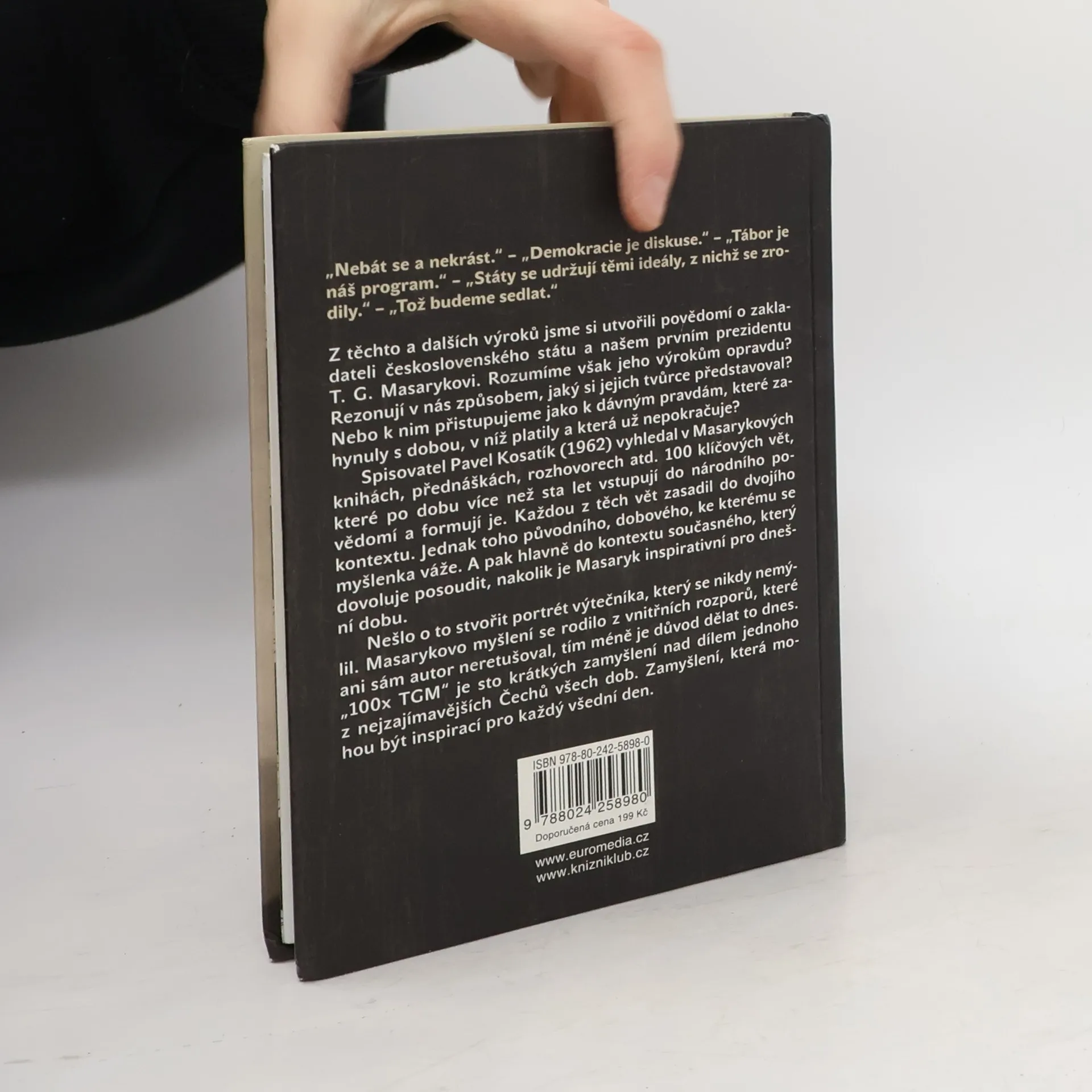 100 moudrých i vtipných, slavných i neznámých, ale vždy zajímavých výroků T. G. Masaryka, které mohou být užitečné a posloužit k zamyšlení i v současnosti. Malá čítanka Masarykových výroků s komentářem a výkladem, která TGM přibližuje dnešním čtenářům.
