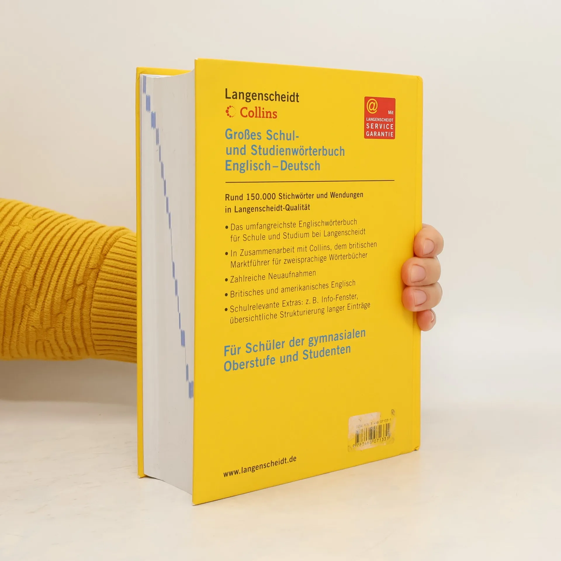 Hochaktueller Wortschatz mit insgesamt rund 315.000 Stichwörtern und Wendungen in 2 Bänden. In Zusammenarbeit mit Collins, dem britischen Marktführer für zweisprachige Wörterbücher. Zusatzinformationen speziell für Oberstufe und Studium. Mit der Langenscheidt Service-Garantie. Das umfangreichste Englischwörterbuch für Schule und Studium bei Langenscheidt Zahlreiche neue und aktuelle Einträge Schulrelevante Extras: Hunderte von Info-Fenstern, unregelmäßige englische Verben, Tipps zum Verfassen englischer Briefe oder E-Mails und viele andere