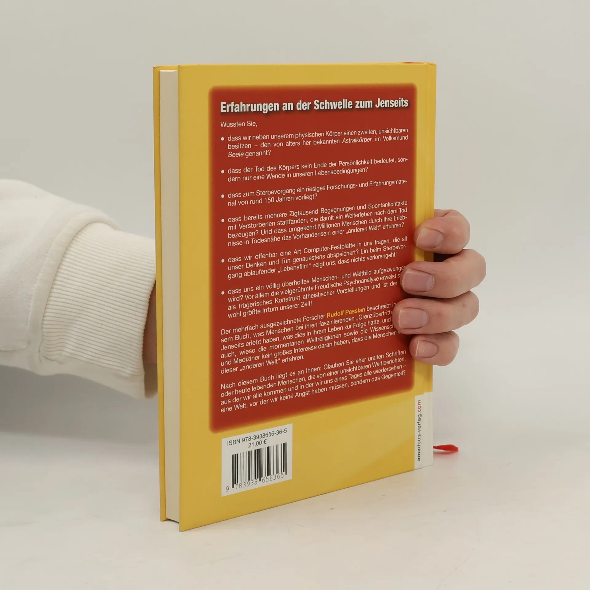 Wussten Sie, dass wir neben unserem physischen Körper einen unsichtbaren Astralkörper besitzen, der umgangssprachlich als Seele bezeichnet wird? Der Tod des Körpers bedeutet nicht das Ende der Persönlichkeit, sondern eine Wende in unseren Lebensbedingungen. Es gibt ein umfangreiches Forschungs- und Erfahrungsmaterial von rund 150 Jahren zum Sterbevorgang, das mehrere Zigtausend Begegnungen mit Verstorbenen dokumentiert, die ein Weiterleben nach dem Tod bezeugen. Millionen Menschen berichteten zudem von Erlebnissen in Todesnähe, die das Vorhandensein einer „anderen Welt“ bestätigen. Wir tragen offenbar eine Art Computer-Festplatte in uns, die all unser Denken und Handeln speichert. Der beim Sterbevorgang ablaufende „Lebensfilm“ zeigt, dass nichts verloren geht. Zudem wird uns ein überholtes Menschen- und Weltbild aufgezwungen, wobei die Freud’sche Psychoanalyse sich als trügerisches Konstrukt atheistischer Vorstellungen entpuppt. Der Forscher Rudolf Passian beschreibt in diesem Werk die Erfahrungen von Menschen bei ihren Grenzübertritten ins Jenseits und deren Auswirkungen auf ihr Leben. Er beleuchtet auch das Desinteresse der Weltreligionen sowie der Wissenschaft und Medizin an diesen Themen. Am Ende liegt es an Ihnen, ob Sie uralten Schriften oder den Berichten lebender Menschen glauben, die von einer unsichtbaren Welt erzählen, aus der wir alle stammen und in der wir uns eines Tages wiedersehen.