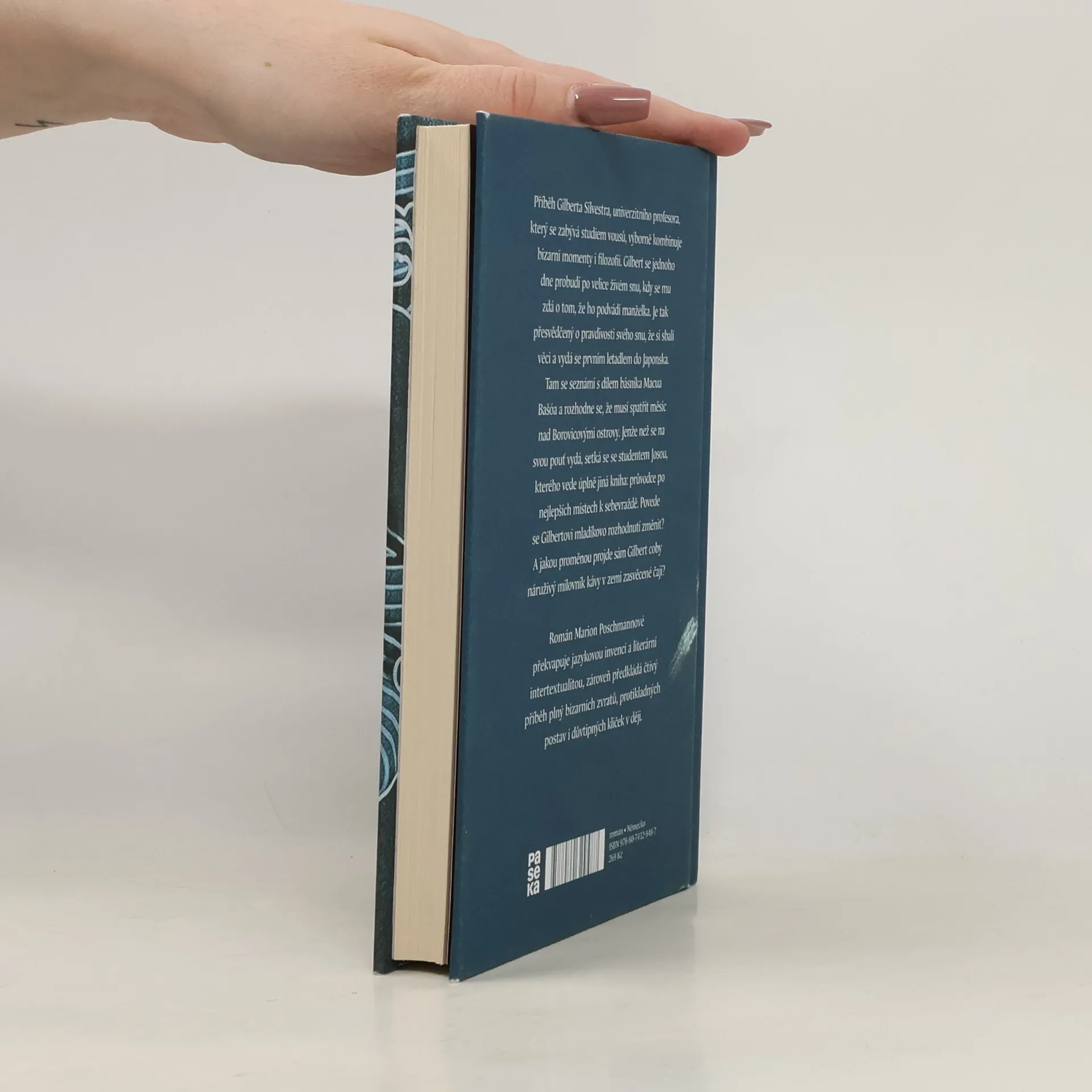 Příběh Gilberta Silvestra, univerzitního profesora, který se zabývá studiem vousů ve filmech, výborně kombinuje bizarní momenty i filozofii. Gilbert se jednoho dne probudí po velice živém snu, v němž se mu zdá o tom, že ho podvádí manželka. Profesor je tak přesvědčený o pravdivosti svého snu, že si sbalí věci a vydá se prvním letadlem do Japonska. Tam se seznámí s dílem básníka Macua Bašóa a rozhodne se, že musí spatřit měsíc nad Borovicovými ostrovy. Jenže ještě než se na svou pouť vydá, setká se se studentem Josou, kterého na cestách vede úplně jiná kniha: průvodce po nejlepších místech k sebevraždě. Povede se mu mladíkovo rozhodnutí změnit? A jakou proměnou projde sám Gilbert coby náruživý milovník kávy v zemi zasvěcené čaji? Román Marion Poschmannové překvapuje jazykovou invencí a literární intertextualitou, zároveň předkládá čtivý příběh plný bizarních zvratů, postav i důvtipných kliček v ději. V Německu je Poschmannová opěvována nejen kritiky, ale především čtenáři.