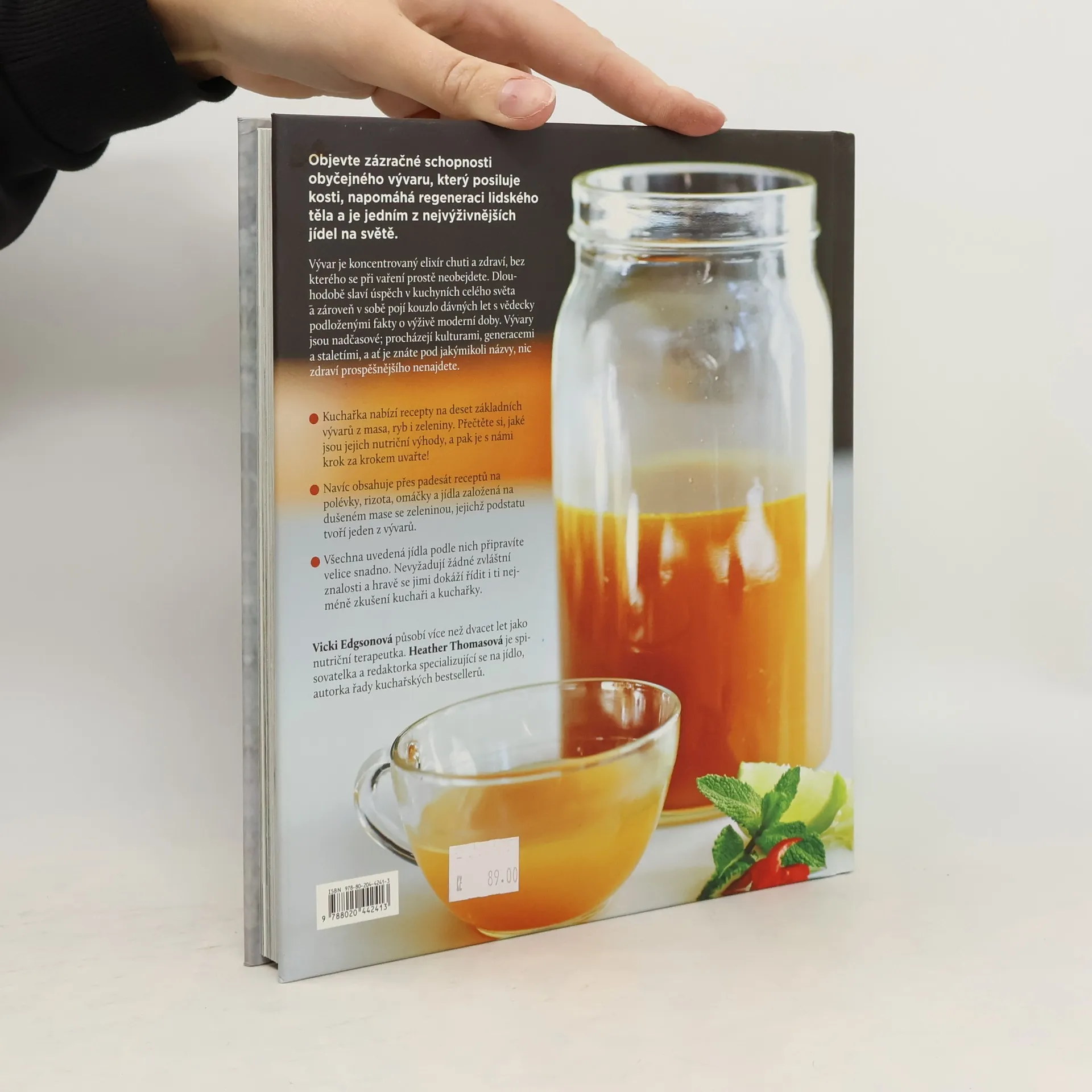 Objevte zázračné schopnosti obyčejného vývaru, který posiluje kosti, napomáhá regeneraci lidského těla a je jedním z nejvýživnějších jídel na světě. Vývar je koncentrovaný elixír chuti a zdraví, bez kterého se při vaření prostě neobejdete. Dlouhodobě slaví úspěch v kuchyních celého světa a zároveň v sobě pojí kouzlo dávných let s vědecky podloženými fakty o výživě moderní doby. Vývary jsou nadčasové; procházejí kulturami, generacemi a staletími, a ať je znáte pod jakýmikoli názvy, nic zdraví prospěšnějšího nenajdete. Kuchařka nabízí recepty na deset základních vývarů z masa, ryb i zeleniny. Přečtěte si, jaké jsou jejich nutriční výhody, a pak je s knihou krok za krokem uvařte! Navíc obsahuje přes padesát receptů na polévky, rizota, omáčky a jídla založená na dušeném mase se zeleninou, jejichž podstatu tvoří jeden z vývarů. Všechna uvedená jídla lze připravit velice snadno. Recepty nevyžadují žádné zvláštní znalosti a snadno se jimi dokáží řídit i ti nejméně zkušení kuchaři a kuchařky.