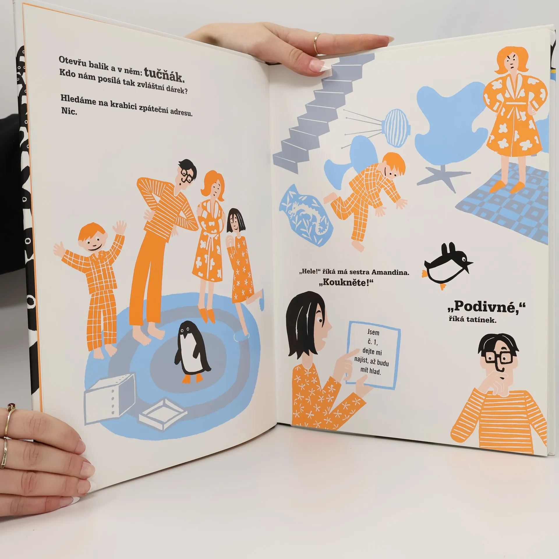 Prvního ledna zazvoní pošťák a přinese balík. Je v něm tučňák a záhadný dopis: „Jsem číslo 1, až budu mít hlad, dejte mi najíst.“ A tak to jde den co den… Obrazová kniha výtvarnice Joëlle Jolivet a spisovatele Jeana-Luca Fromentala je nápaditým a navýsost vtipným vyprávěním o počítání, jedné rodině a 365 překvapeních. Co udělat, když vám po domě capkají nejdřív desítky a pak stovky nezvaných hostů s oranžovými nožkami a v černobílém fráčku, místo mluvení kvakají, neustále se zavírají do koupelny a ke všemu bývají dost nervózní, když mají hlad? Jak uspořádat a uživit 4 x 15, 12 x 12 nebo 6 x 6 x 6 tučňáků, když je jich každý den o jednoho víc? Po pár měsících mamince docházejí zásoby, sestra má chuť na tučňáčí paštiku a tatínkovi se z toho neustálého přepočítávání motá hlava… Kdo je záhadný odesílatel živých balíčků a proč je vlastně posílá? Neobyčejně legrační obrazový matematický příběh s ekologickou pointou. K použití pro celou rodinu!