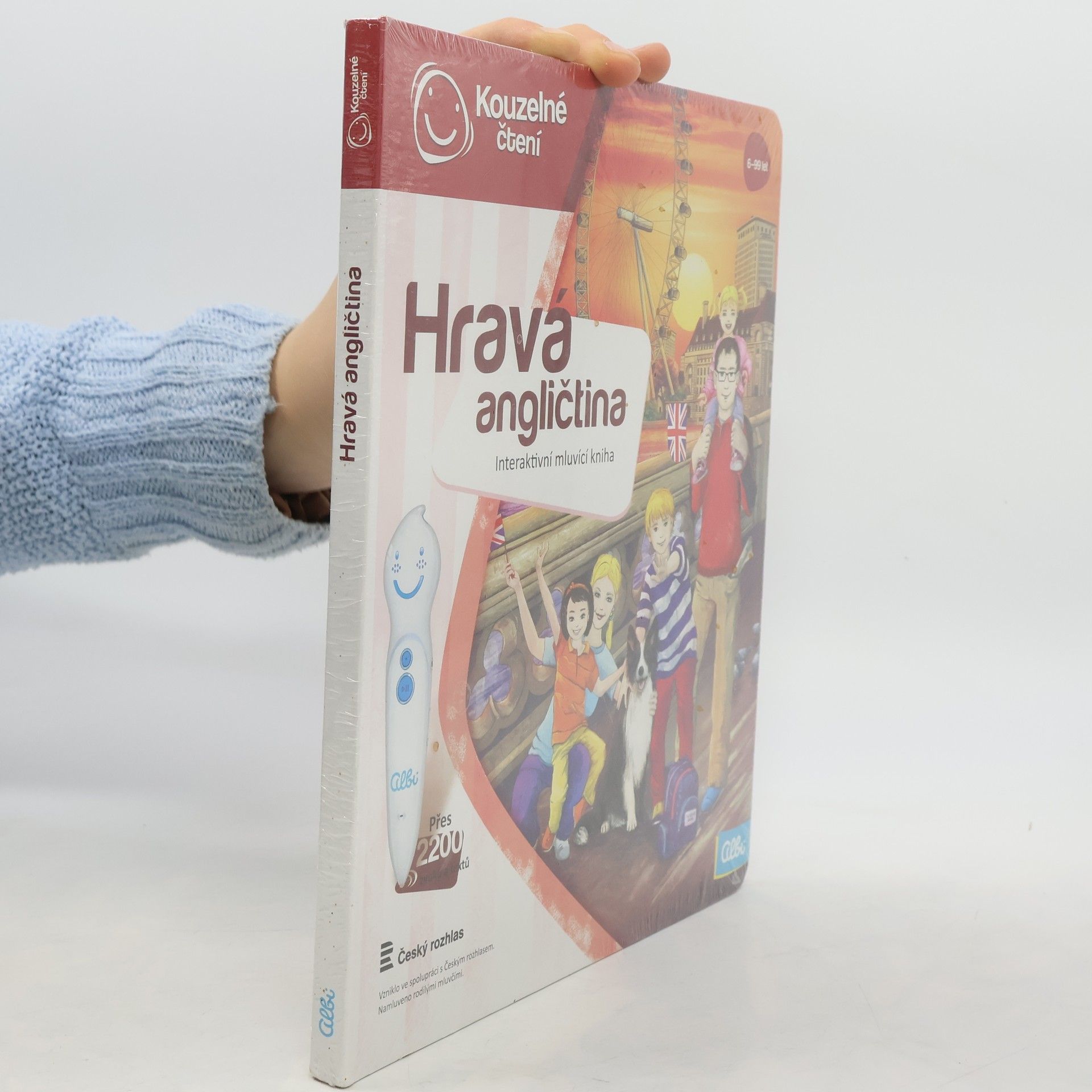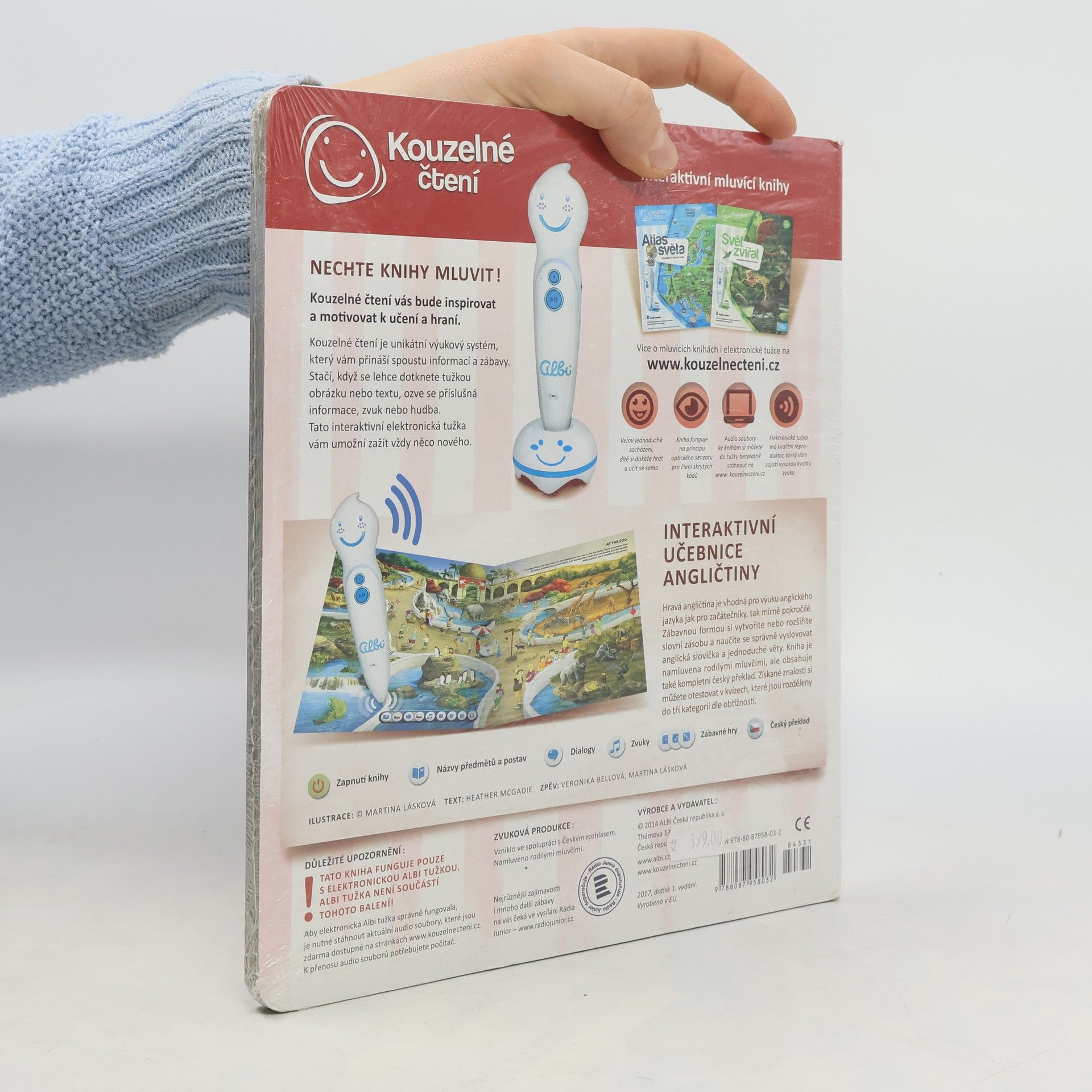 Kouzelné čtení od značky Albi je unikátní výukový systém, který vašim dětem přinese spoustu zábavy a nových informací. Můžete se těšit na velké množství zajímavostí, napínavé vyprávění o věcech kolem nás i na zpívání a přehrávání zvuků. Kniha Hravá angličtina naučí vaše dětih ravou formou základy anglických slovíček. Děti se pomocí této knihy naučí pojmenovat věci v obchodním domě, zvířátka v zoo, vybavení školní třídy, věci v domě, na farmě a další. Součástí výuky je i správná výslovnost slovíček. Upozornění: Ke knize je nutné vlastnit elektronickou tužku Albi , která není součástí balení. Jak na to? Velice snadno! Stačí do své elektronické tužky Albi nahrát aplikaci k dané knize z kolekce Kouzelné čtení a poté tužku přiložit k vyznačenému bodu na úvodní straně knihy. Elektronická tužka tak automaticky rozpozná, v jaké knize se připravujete listovat. Poté už můžete knihu procházet, prohlížet obrázky a přikládat tužku k vyznačeným bodům na stránkách. Elektronická tužka vám vše sama převypráví. Specifikace Značka: Albi Model: Hravá angličtina Edice: Kouzelné čtení Doporučený věk: 6+ Kompatibilní s elektronickou tužkou Albi Hmotnost: 0,358 kg Rozměry: 23 x 27 x 1 cm Obsah balení Kniha Albi Kouzelné čtení Hravá angličtina