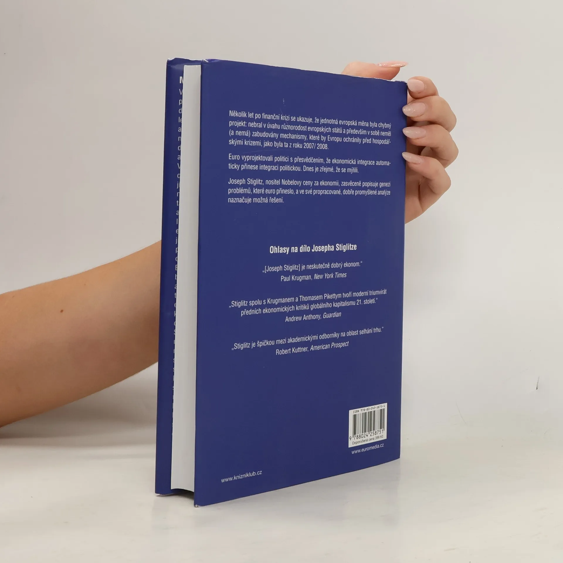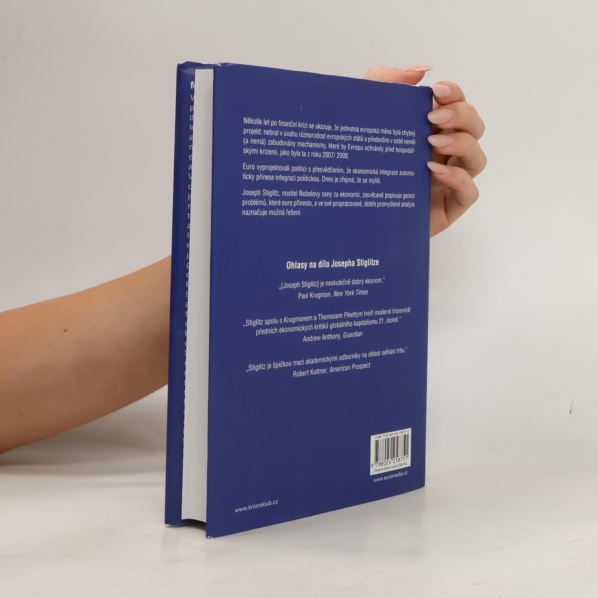 Několik let po finanční krizi se ukazuje, že jednotná evropská měna byla chybný projekt: nebral v úvahu různorodost evropských států a především v sobě neměl (a nemá) zabudovány mechanismy, které by Evropu ochránily před hospodářskými krizemi, jako byla ta z roku 2007/ 2008. Euro vyprojektovali politici s přesvědčením, že ekonomická integrace automaticky přinese integraci politickou. Dnes je zřejmé, že se mýlili. Joseph Stiglitz, nositel Nobelovy ceny za ekonomii, zasvěceně popisuje genezi problémů, které euro přineslo. Ukazuje, jak jednotná měna zvýraznila rozdíly mezi „věřitelskou Evropou“ v čele s Německem, a „Evropou dlužníků“ v čele s Řeckem. Podle Stiglitze je neudržitelný současný stav, kdy se „hasí“ jen ty nepalčivější problémy. Buď se eurozóna musí proměnit v plnohodnotnou měnovou unii, která bude mít společnou fiskální politiku (společný rozpočet, společné dluhopisy), nebo se musí rozpadnout na „dvě, tři kompatibilnější části“, případně zavést „flexibilnější euro“, což je částečně návrat k národním měnám. Pokud se nic nestane, můžou vysoká nezaměstnanost a další sociální problémy v řadě evropských zemí postupně vést k nepokojům, růstu napětí a nepředvídatelným řešením, jako jsme viděli v případě Brexitu. Pozoruhodná, věcná a srozumitelná analýza globalizované a stále propojenější světové ekonomiky. (společná měna jako hrozba pro budoucnost Evropy)