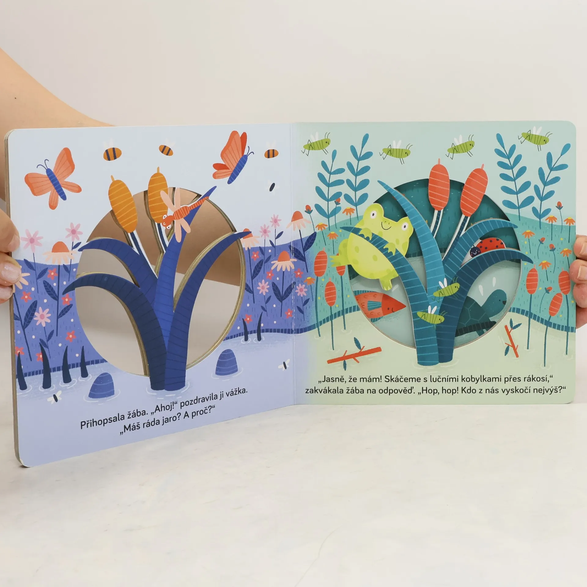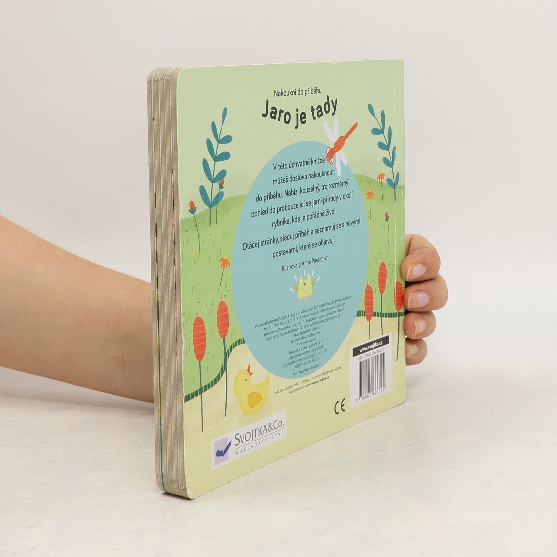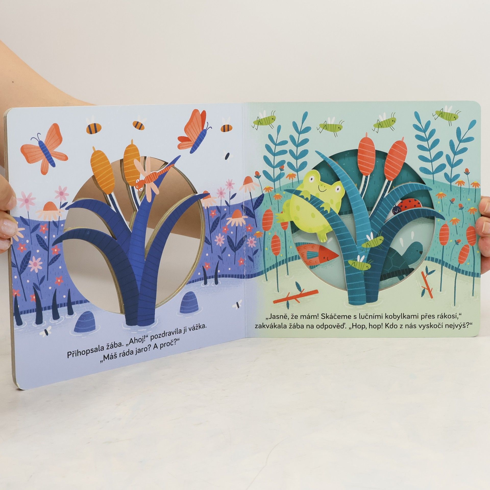 Nastává jaro a pro kachničky u rybníka všechno krásně, lákavě voní. I vážka nad hladinou si užívá hru ve větru a letí se podívat na svou kamarádku žabku. Vedle sedí beruščí maminka, která má plno práce – musí svým dítkům ukázat celý svět! Na všechny své přátele se těší bobr. To je prima, když se všichni u rybníka sejdou! V této úchvatné knížce můžeš doslova nakouknout do příběhu. Nabízí kouzelný, trojrozměrný pohled do probouzející se jarní přírody v okolí rybníka, kde je pořádně živo. Otáčej stránky, sleduj příběh a seznamuj se s novými postavami, které se objevují.