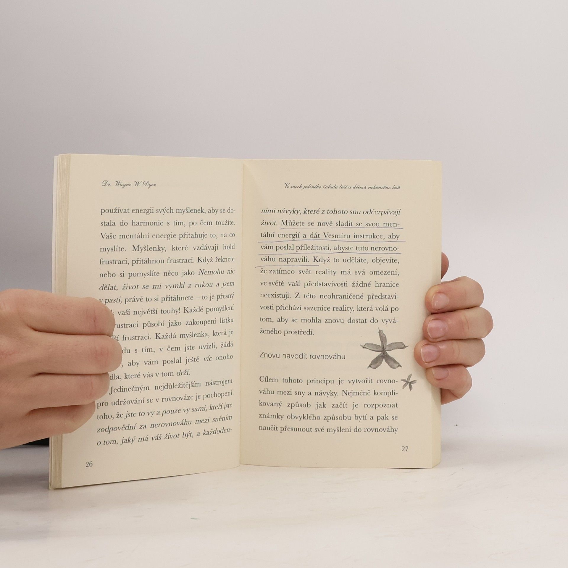 V této knize plné inspirace vám řečník a autor bestsellerů Wayne W. Dyer ukazuje, jak můžete v životě dosáhnout rovnováhy. Nabízí k tomu devět principů, s jejichž pomocí sladíte své myšlenky, aby odpovídaly vašim největším touhám. Představte si váhy, kde je jedna miska zatížena až na zem a ta druhá - představující objekt vašich tužeb - nejistě ční ve vzduchu. Tyto váhy jsou měřítkem vašich myšlenek. K tomu, abyste znovu nastolili rovnováhu, která charakterizuje všechno ve vesmíru, musíte pozvednout tíživé myšlenky, takže budou v souladu s vašimi touhami.
