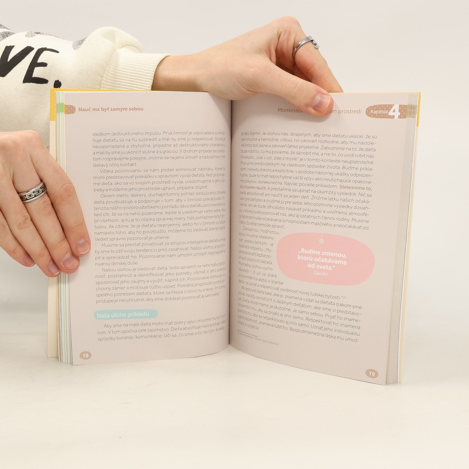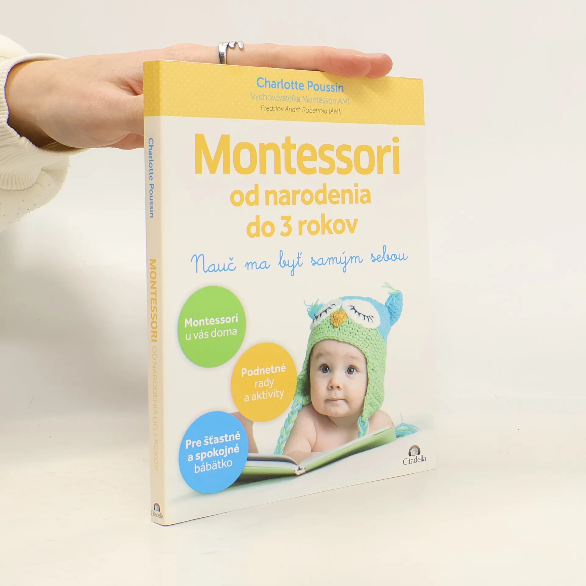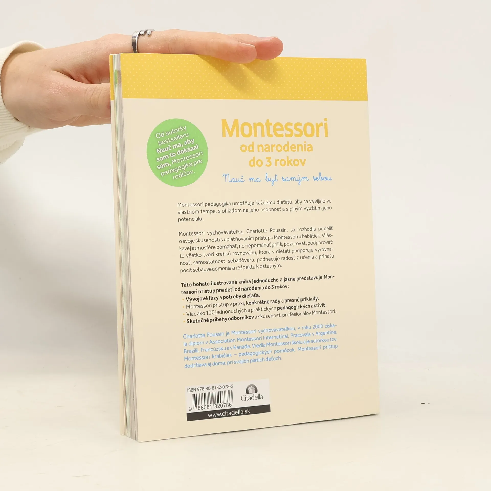 Montessori pedagogika umožňuje každému dieťaťu, aby sa vyvijalo vo vlastnom tempe, s ohľadom na jeho osobnosť a s plným využitím jeho potenciálu. Montessori vychovávateľka, Charlotte Poussin, sa rozhodla podeliť o svoje skúsenosti s uplatňovaním prístupu Montessori u bábätiek. V láskavej atmosfére pomáhať, no nepomáhať príliš, pozorovať, podporovať: to všetko tvorí krehkú rovnováhu, ktorá v dieťati podporuje vyrovnanosť,lsamostatnosť, sebadôveru, podnecuje radosť z učenia a prináša pocit sebauvedomenia a rešpektu k ostatným. Táto bohato ilustrovaná kniha jednoducho a jasne predstavuje Montessori prístup pre deti od narodenia do 3 rokov: - Vývojové fázy a potreby dieťata. - Montessori prístup v praxi, konkrétne rady a presné príklady. - Viac ako 100 jednoduchých a praktických pedagogických aktivít. - Skutočné príbehy odborníkov a skúsenosti profesionálov Montessori.