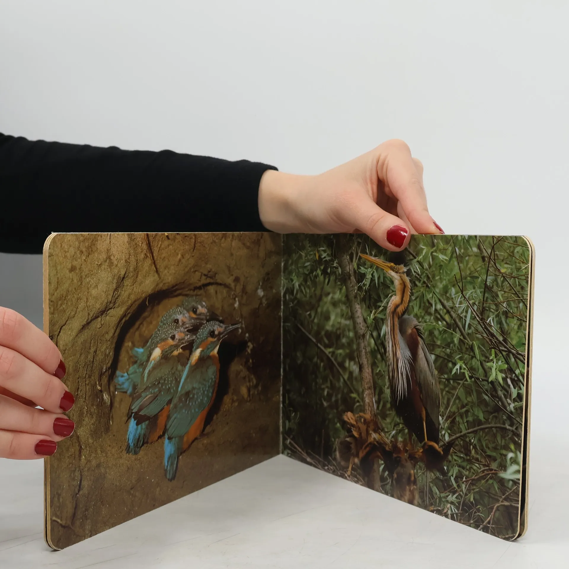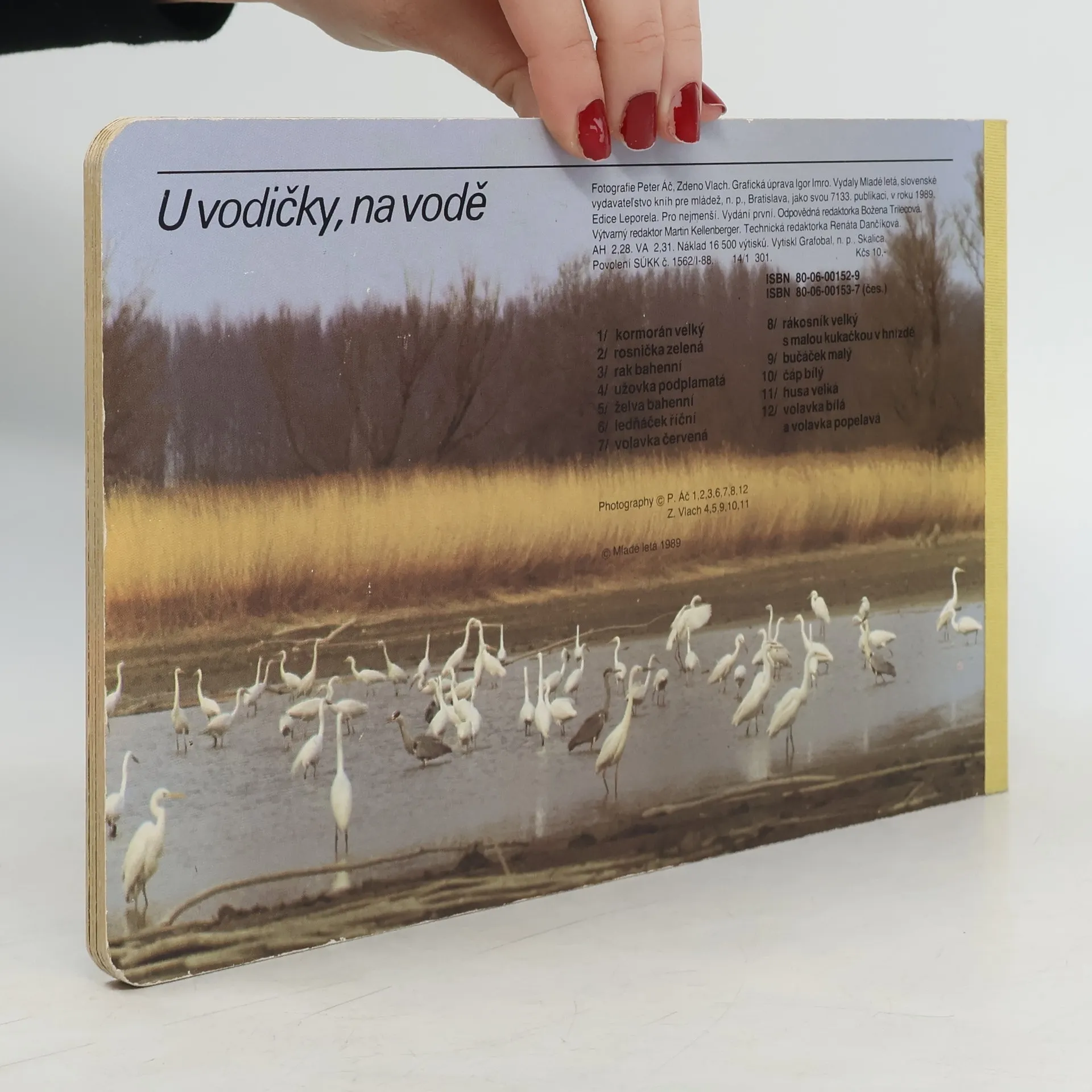 Leporelo s fotografiami zvierat pri vode: Kormorán veľký, Rosnička zelená, Rak bahenný, Užovka fŕkaná, Korytnačka močiarna, Rybárik riečny, Volavka purpurová, Trsteniarik veľký s malou kukučkou v hniezde, Bučiačik močiarny, Bocian biely, Hus divá, Volavka biela a volavka popolavá.