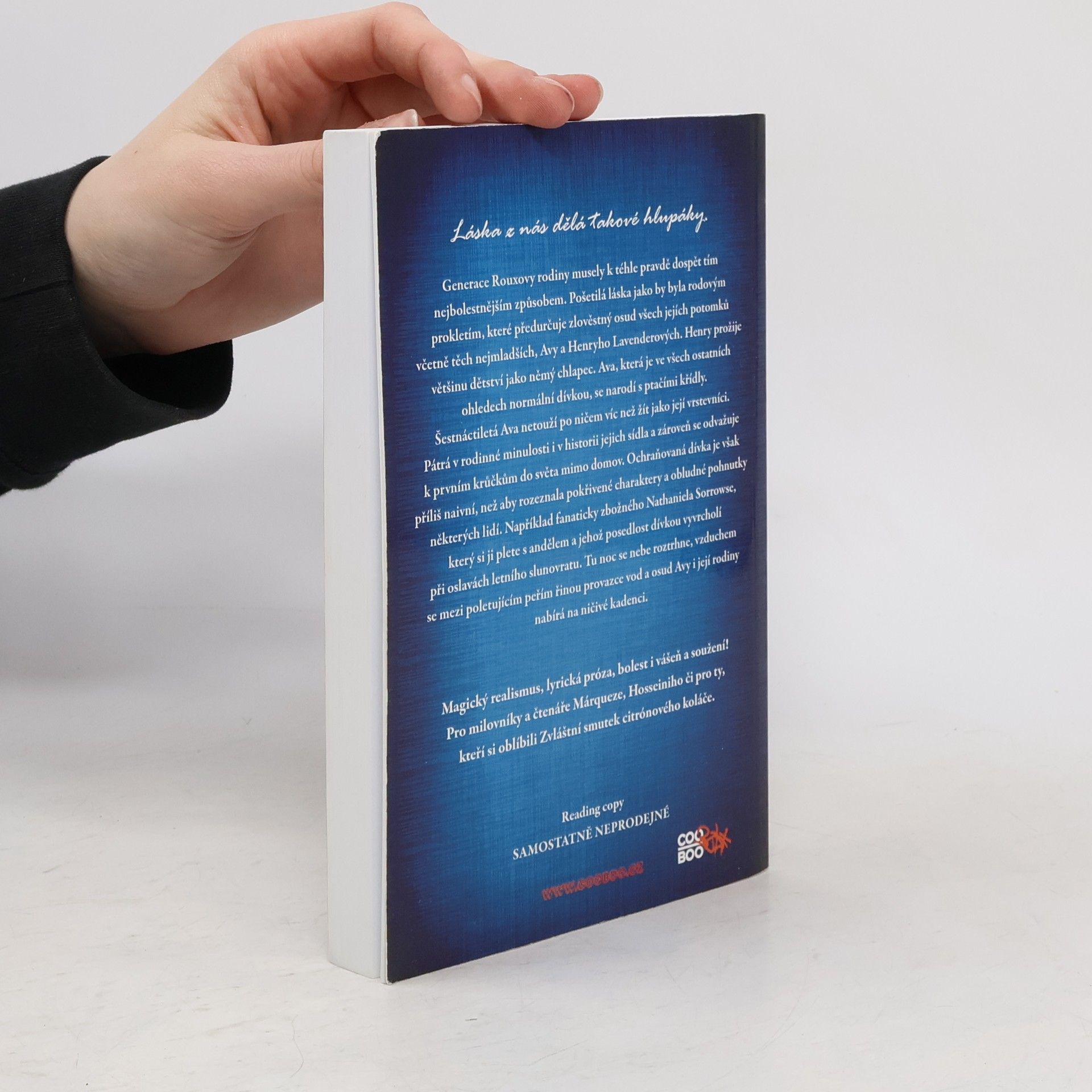 Rodina Rouxova má pošetilou lásku ve vínku, což nevěští nic dobrého pro její nejmladší členku, Avu Lavender. Ava – skoro ve všech ohledech normální dívka – se narodila s křídly. Ve snaze pochopit tuto svou zvláštnost a s rostoucí touhou zapadnout mezi své vrstevníky se šestnáctiletá Ava odváží do světa, naprosto nepřipravená na to, co ji může čekat, a naivní vůči zvráceným pohnutkám ostatních lidí. Lidí, jako je třeba zbožný Nathaniel Sorrows, který si Avu splete s andělem a jehož posedlost dívkou s křídly vygraduje v noci oslav letního slunovratu. Tu noc se nebe roztrhne, vzduchem se mezi poletujícím peřím řinou provazce vod a osud Avy i její rodiny nabírá na ničivé kadenci.... Magický realismus, lyrická próza, bolest i vášeň a soužení – to vše v jedné knize!