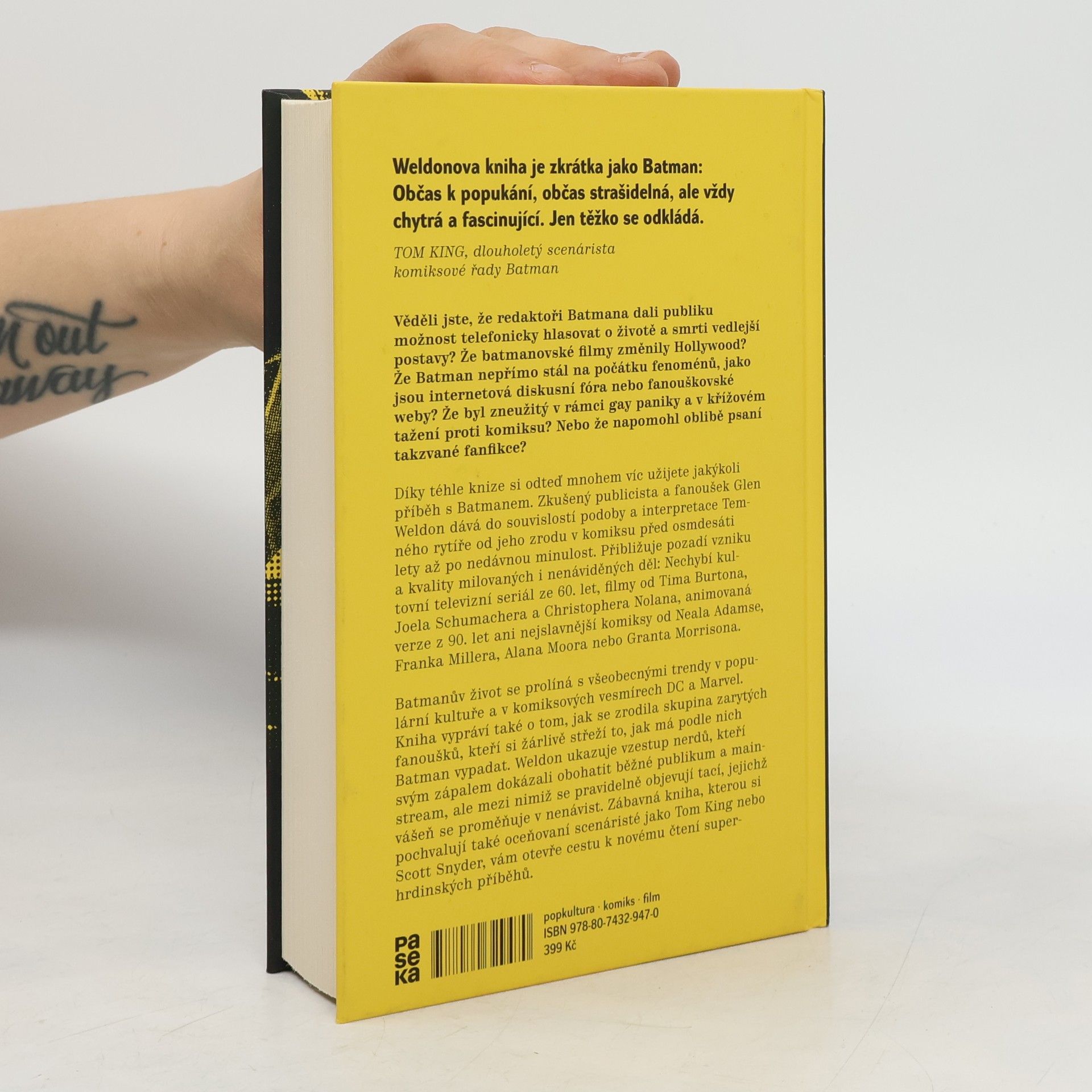 Historie Batmana a zrod nerdů. Tahle kniha ukrývá víc překvapení než Batmanův opasek. Věděli jste, že redaktoři Batmana dali publiku možnost telefonicky hlasovat o životě a smrti vedlejší postavy? Že filmy s Batmanem navždy změnily hollywoodský marketing? Že nepřímo stál na počátku fenoménů, jako jsou internetová diskusní fóra nebo fanouškovské weby, a že napomohl oblibě psaní takzvané fanfikce? Zkušený publicista a fanoušek Glen Weldon dává do souvislostí podoby a interpretace Temného rytíře od jeho zrodu v komiksu před 80 lety až po nedávnou minulost. Přibližuje pozadí vzniku a kvality milovaných i nenáviděných děl: Nechybí televizní seriál ze 60. let, filmy od Tima Burtona, Joela Schumachera a Christophera Nolana, animovaná verze z 90. let ani nejslavnější komiksy od Neala Adamse, Franka Millera, Alana Moora nebo Granta Morrisona. Batmanův život na papíře i mimo něj se prolíná se vznikem kultury zarytých fanoušků, kteří si žárlivě střeží to, jak má podle nich Batman vypadat a koho má reprezentovat. Weldon ukazuje vzestup nerdů, kteří svým zápalem dokázali obohatit běžné publikum a mainstream, ale mezi nimiž se pravidelně objevují tací, jejichž vášeň se proměňuje v nenávist. Objevná kniha, kterou si pochvalují také oceňovaní scenáristé jako Tom King nebo Scott Snyder, vám otevře cestu k novému čtení Batmanových příběhů.