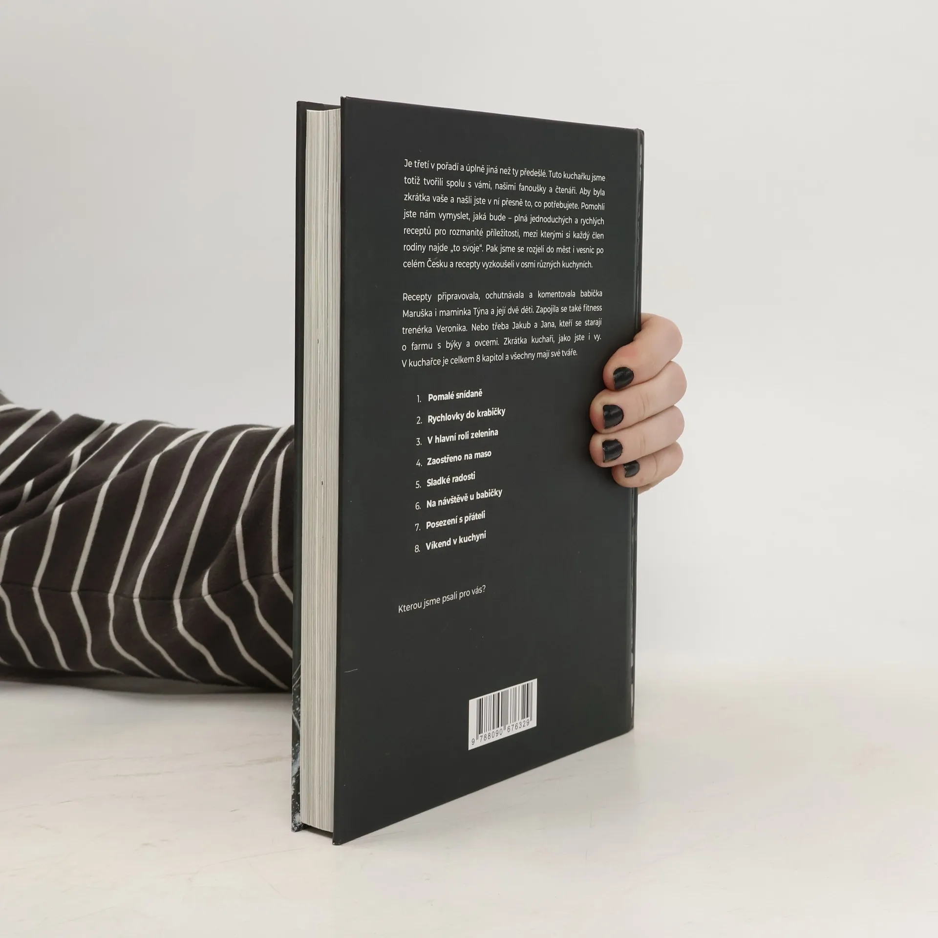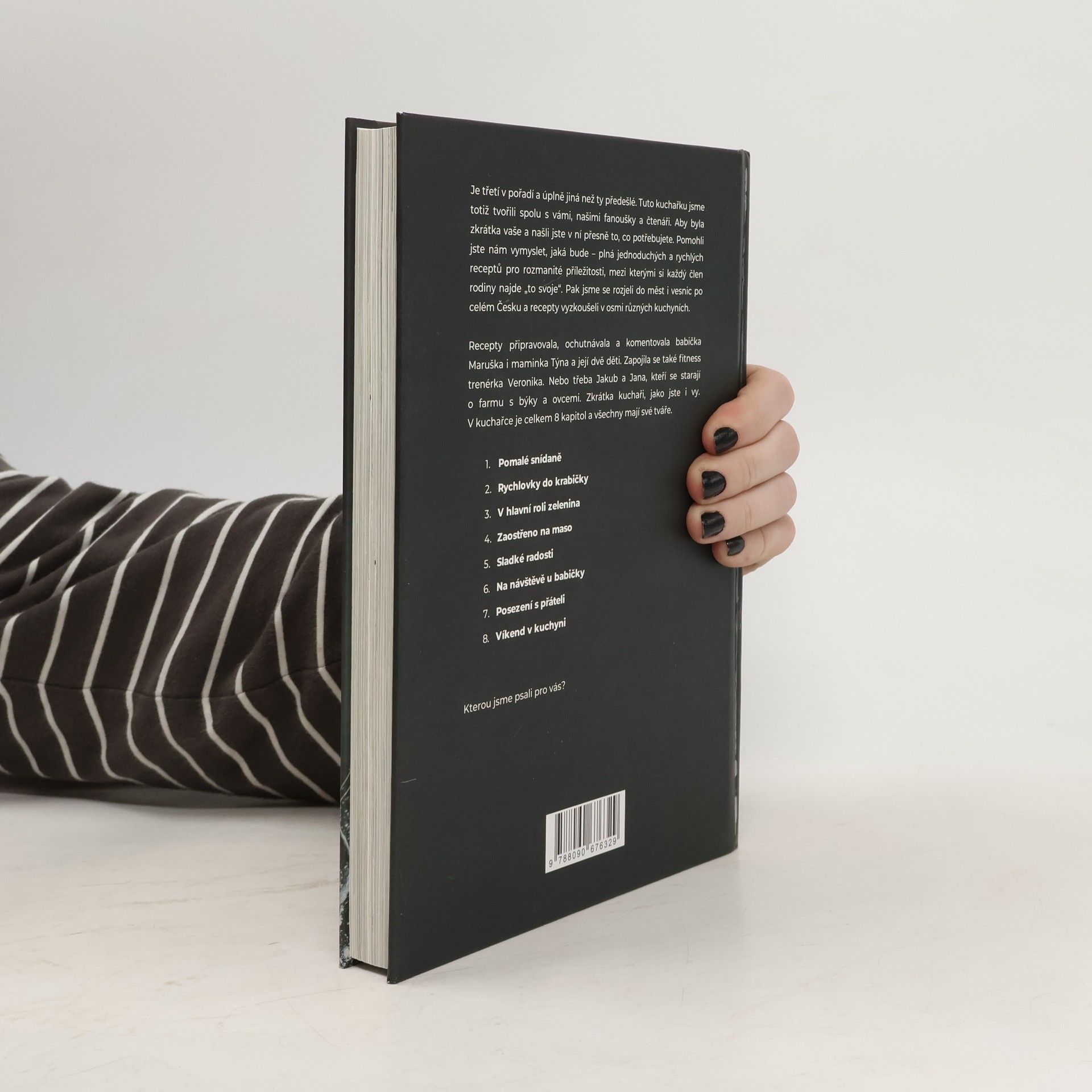 Máme za sebou pěkný kus cesty. Slíbili jsme, že připravíme kuchařku podle vašich přání. Tak jsme pracovali 8 měsíců, ujeli 1 438 kilometrů, vařili v osmi kuchyních po různých koutech Česka – a nezapomněli se radit s vámi. Děkujeme vám za pomoc a podporu! V kuchařce najdete od každého něco – péct budete s mámou Týnou a jejími dětmi. S babičkou Maruškou a její vnučkou ochutnáte tradiční recepty v netradiční podobě. A s fitness trenérkou Verčou se podíváte na to, jaké recepty si můžete zabalit s sebou do krabičky. V celkem 8 kapitolách najdete 110 receptů pro různé příležitosti.