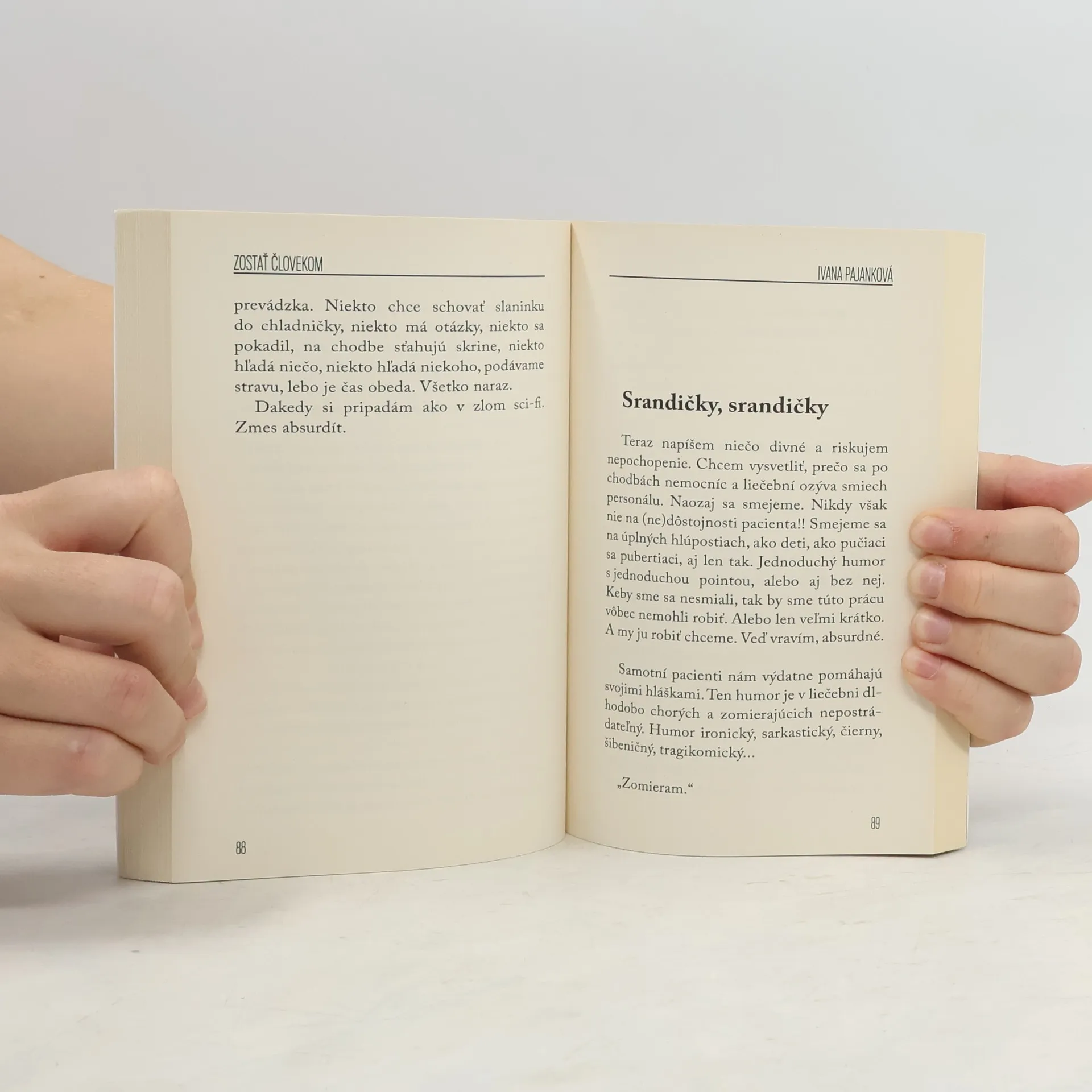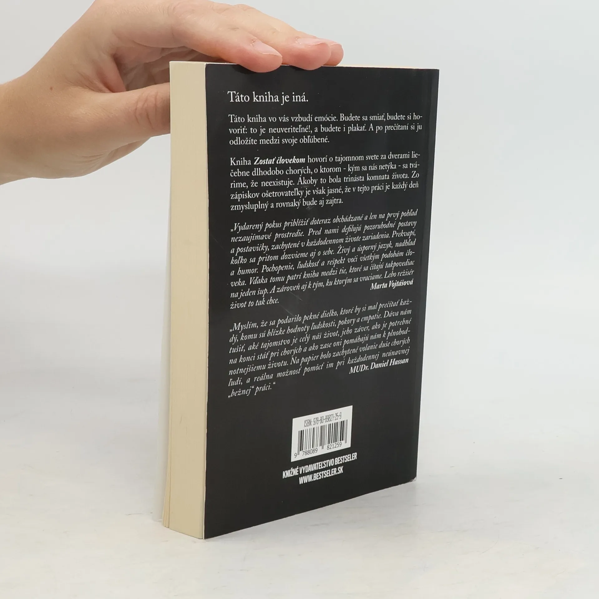 Táto kniha je iná. Táto kniha vo vás vzbudí emócie. Budete sa smiať, budete si hovoriť: to je neuveriteľné!, a budete i plakať. A po prečítaní si ju odložíte medzi svoje obľúbené. Kniha Zostať človekom hovorí o tajomnom svete za dverami liečebne dlhodobo chorých, o ktorom - kým sa nás netýka - sa tvárime, že neexistuje. Akoby to bola trinásta komnata života. Zo zápiskov ošetrovateľky je však jasné, že v tejto práci je každý deň zmysluplný a rovnaký bude aj zajtra.