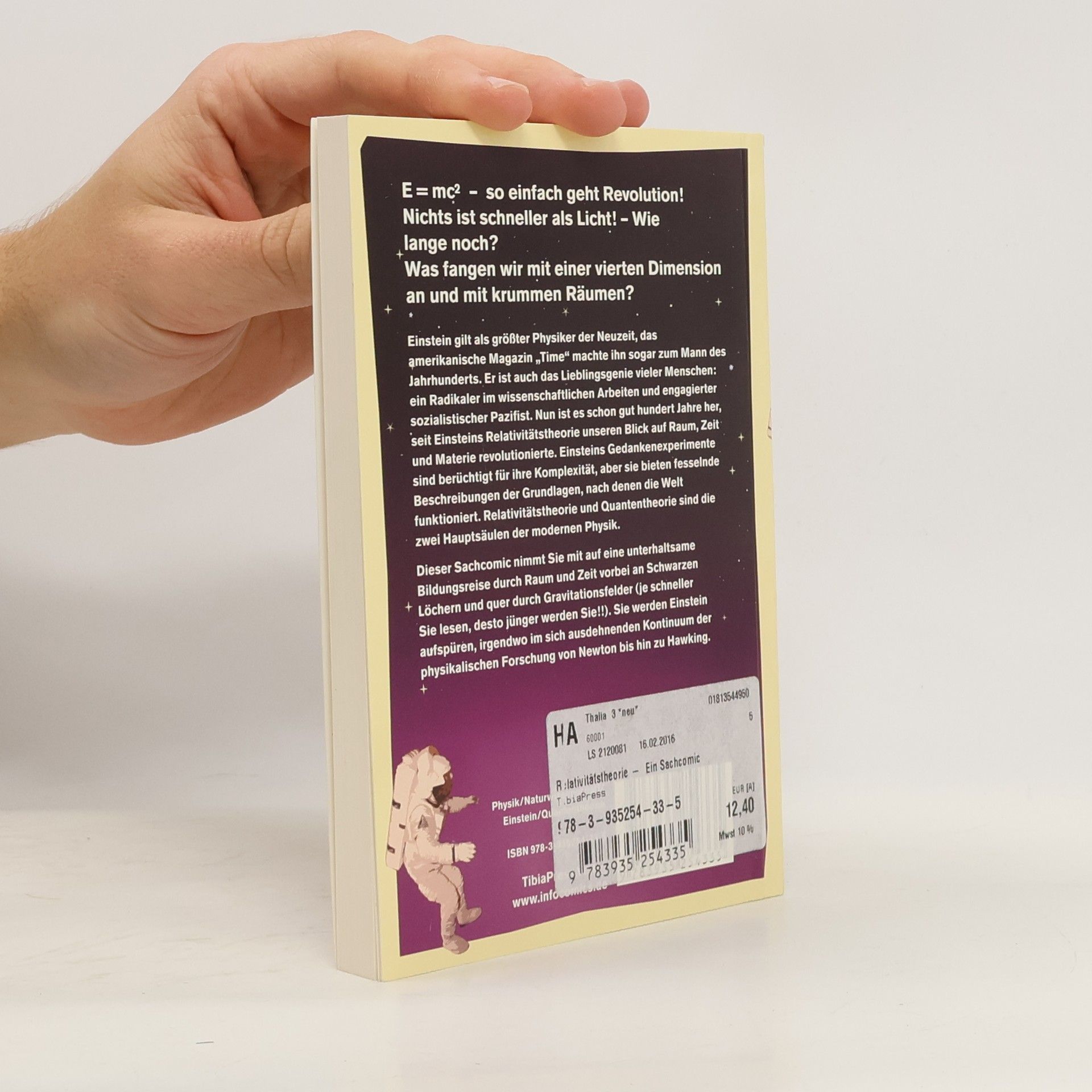 E = mc² – so einfach ist eine Revolution! Nichts ist schneller als Licht! Wie lange noch? Was fangen wir mit einer vierten Dimension an und mit krummen Räumen? Einstein gilt als größter Physiker der Neuzeit, das amerikanische Magazin „Time“ machte ihn sogar zum Mann des Jahrhunderts. Einstein ist das Lieblingsgenie vieler Menschen: ein Radikaler im wissenschaftlichen Arbeiten und engagierter sozialistischer Pazifist. Es ist nun gut hundert Jahre her, seit Einsteins Relativitätstheorie unseren Blick auf Raum, Zeit und Materie revolutionierte. Einsteins Gedankenexperimente sind berüchtigt für ihre Komplexität, aber sie bieten fesselnde Beschreibungen der Grundlagen, auf denen die Welt funktioniert. Relativitätstheorie und Quantentheorie sind die zwei Hauptsäulen der modernen Physik. Dieser Sachcomic nimmt Sie mit auf eine unterhaltsame Bildungsreise durch Raum und Zeit vorbei an Schwarzen Löchern und quer durch Gravitationsfelder (Je schneller Sie lesen, desto jünger werden Sie!!). Sie werden Einstein aufspüren, irgendwo im sich ausdehnenden Kontinuum der physikalischen Forschung von Newton bis hin zu Hawking.