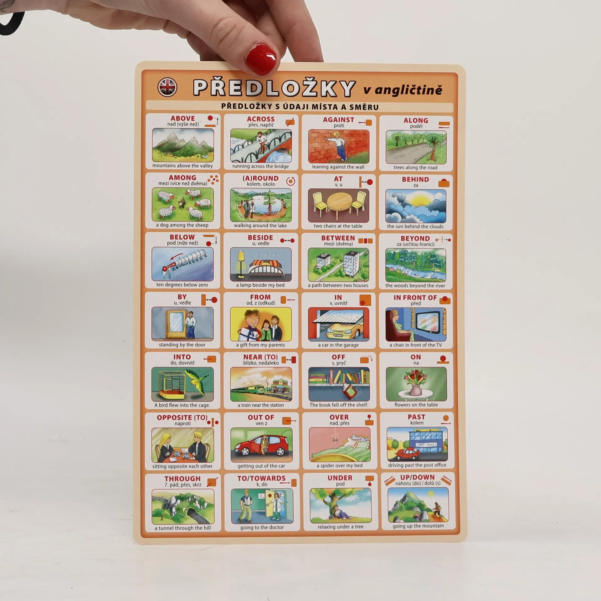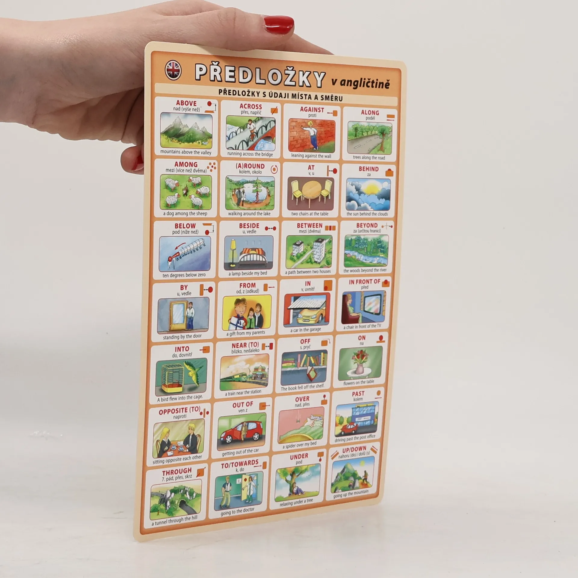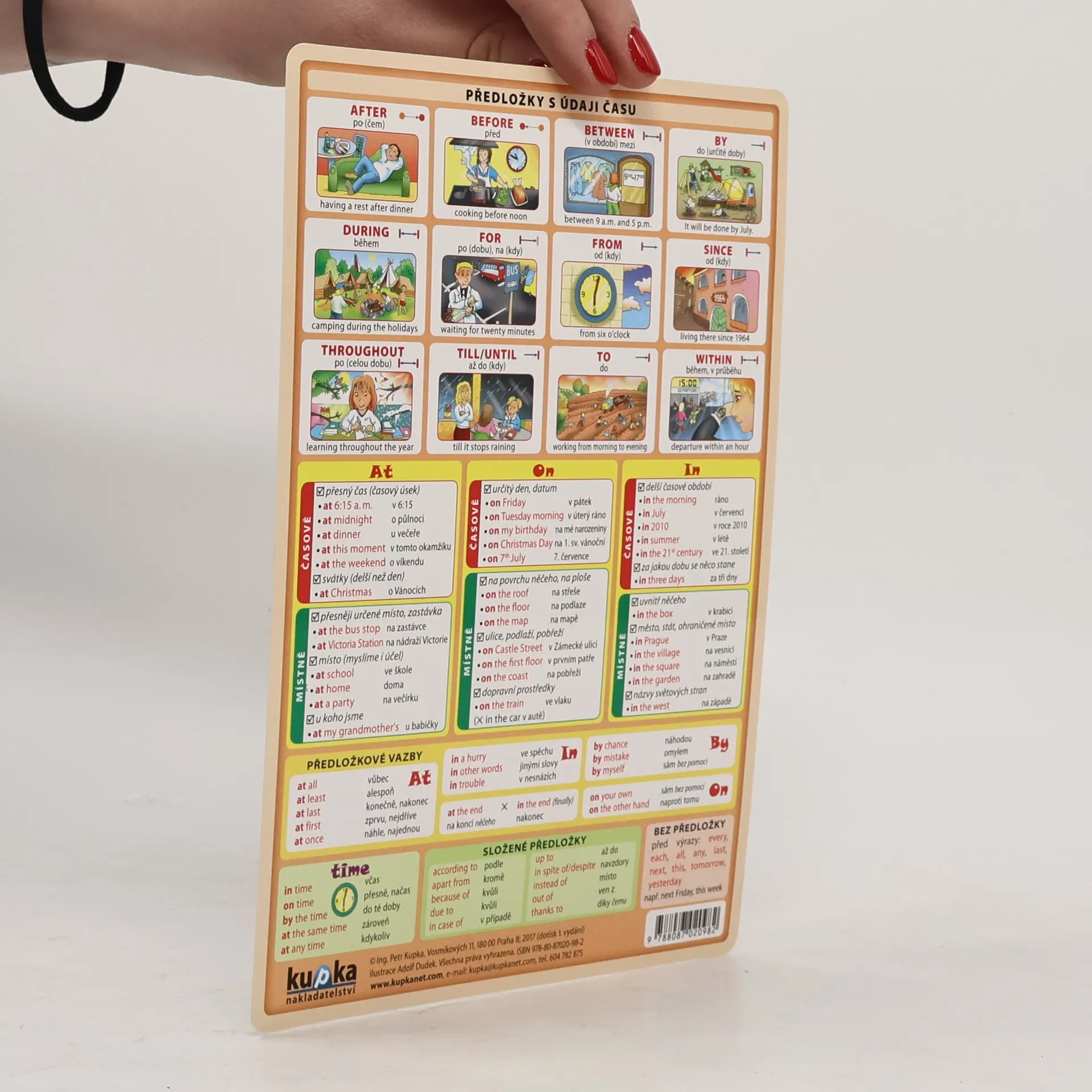 Anglické předložky s českým překladem a ilustrovaným příkladem. Obsahuje předložky s údaji místa a směru, předložky s údaji času a předložkové vazby; ilustrace Adolf Dudek.