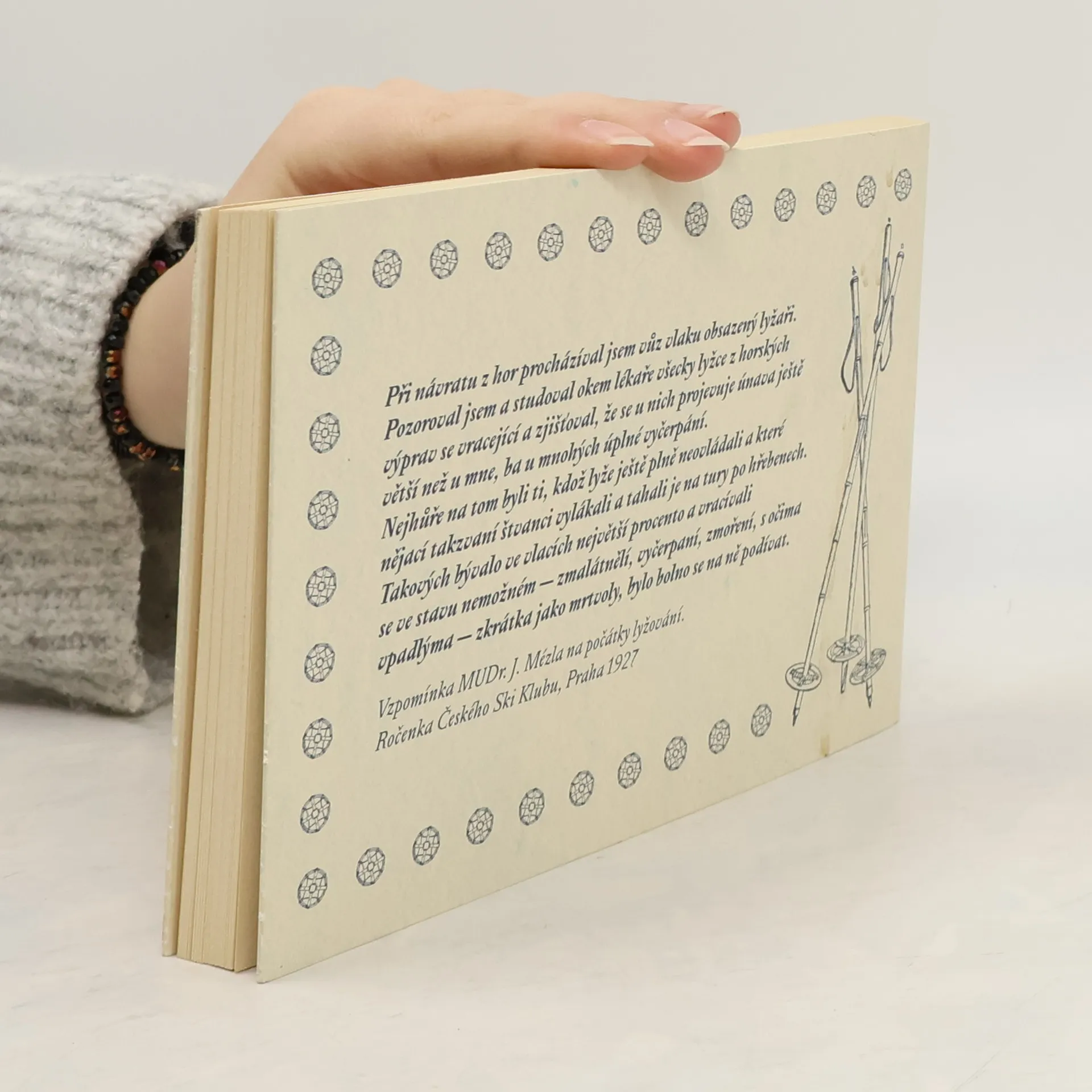 Volné pokračování předchozí úspěšné knížky Petra Rýgra o Orlických horách - Hory Orlické - Na Jiráskově horské cestě. Co znamenal příchod lyží do českých hor? Jaké bylo lyžaření, než se stalo sportem? Kniha se zábavnou formou, putováním po Orlických horách, vrací o století nazpět, do dob, kdy lyže už přestávaly být jen komunikačním prostředkem mezi horskými samotami nebo pracovním nástrojem lesního personálu a stávaly se zábavou městských lidí i společenským fenoménem. Na rychle vzrůstající počet nadšených objevitelů zasněžených horských krás, dosud po celou zimu nepřístupných, postupně reagovali nejen výrobci "ski", ale i hoteliéři, obuvníci, krejčí či vynálezci patentních holí, zaručených mazadel a nejbezpečnějších vázání. Také výrobci fotografického materiálu, schopného zachytit detaily na bílých pláních, a tak kniha přináší výběr historických snímků, které občas přívětivě porovnává s dneškem. Součástí publikace, která koncepčně a graficky navazuje na úspěšné Hory Orlické - Na Jiráskově horské cestě, je i rozsáhlá, mnohdy úsměvná a výtvarně zdařilá dobová inzerce i ukázky z tehdejších katalogů zimního vybavení.