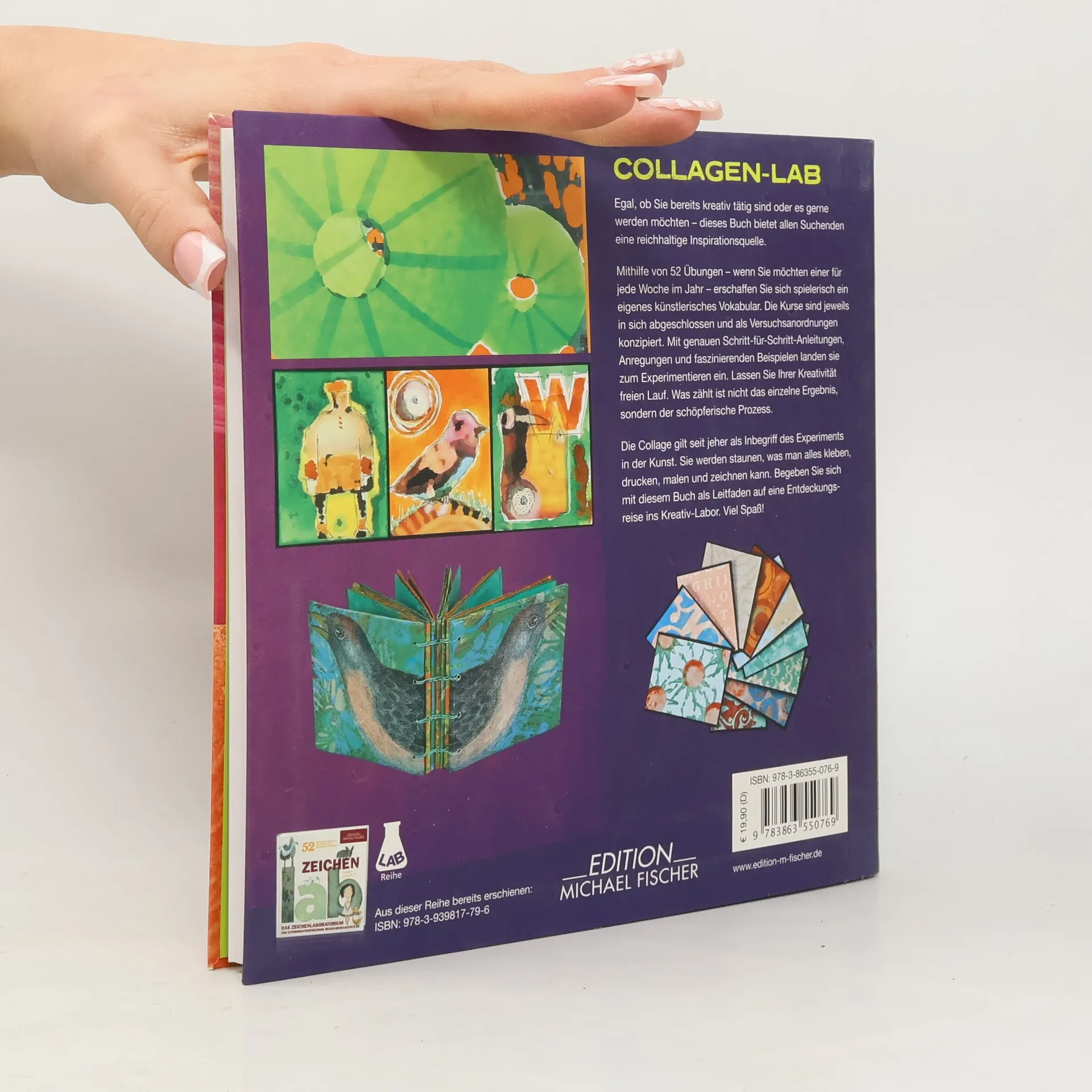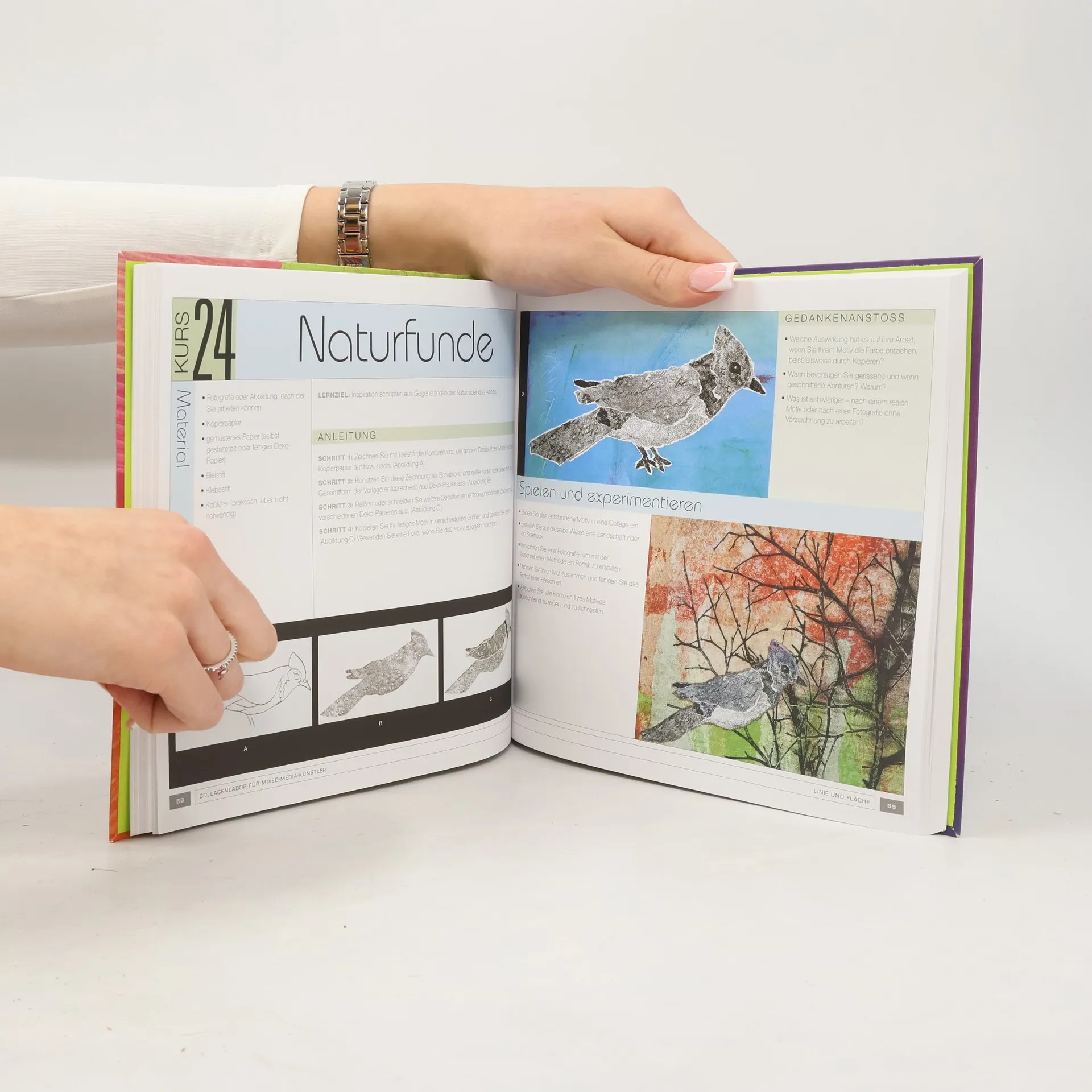 Die Collage gilt seit jeher als Inbegriff des Experiments in der Kunst. Dieses Buch bietet allen, die kreativ auf der Suche sind, eine reichhaltige Inspirationsquelle für vielfältige Experimente. Mithilfe von 52 Übungen – wenn man möchte einer für jede Woche im Jahr – entsteht spielerisch ein individuelles künstlerisches Vokabular. Die Kurse sind jeweils in sich abgeschlossen und als Versuchsanordnungen konzipiert. Mit genauen Schritt-für-Schritt-Anleitungen, Anregungen und faszinierenden Beispielen landen sie zum Experimentieren ein. Was zählt ist nicht das einzelne Ergebnis, sondern der schöpferische Prozess. Beeindruckend, was man alles kleben, drucken, malen und zeichnen kann! Dieses Buch ist ein Leitfaden auf der Entdeckungsreise im Kreativ-Labor.