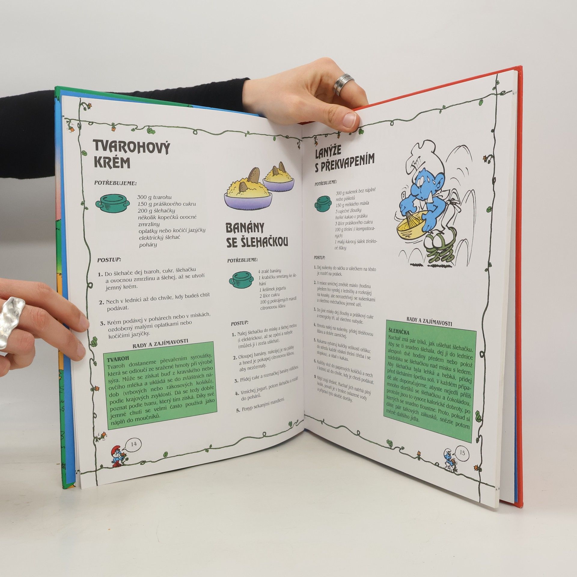 Dětská kuchařka rámuje své vegetariánské receptíky i další sdělení světem Šmoulů. Úvodní část seznámí čtenáře se šmoulím vařením, chováním i životosprávou (což jsou v zásadě výchovné pokyny pro děti). Následují recepty na drobná bezmasá pohoštění, rozdělené podle ročních dob. Doplňují je zajímavosti o některých surovinách, návody na výzdobu stolu a - samozřejmě - obrázky šmoulů. Zcela však chybí podrobnější pracovní návod - podusit, zkaramelizovat... Takže to znamená buď předběžné znalosti, nebo pomoc dospělých.