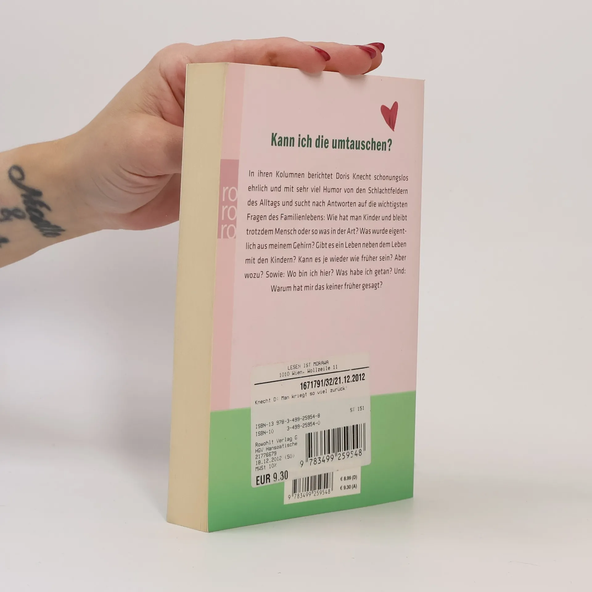 Kann ich die umtauschen? In ihren Kolumnen berichtet Doris Knecht schonungslos ehrlich und mit sehr viel Humor von den Schlachtfeldern des Alltags und sucht nach Antworten auf die wichtigsten Fragen des Familienlebens: Wie hat man Kinder und bleibt trotzdem Mensch oder so was in der Art? Was wurde eigentlich aus meinem Gehirn? Gibt es ein Leben neben dem Leben mit den Kindern? Kann es je wieder wie früher sein? Aber wozu? Sowie: Wo bin ich hier? Was habe ich getan? Und: Warum hat mir das keiner früher gesagt?