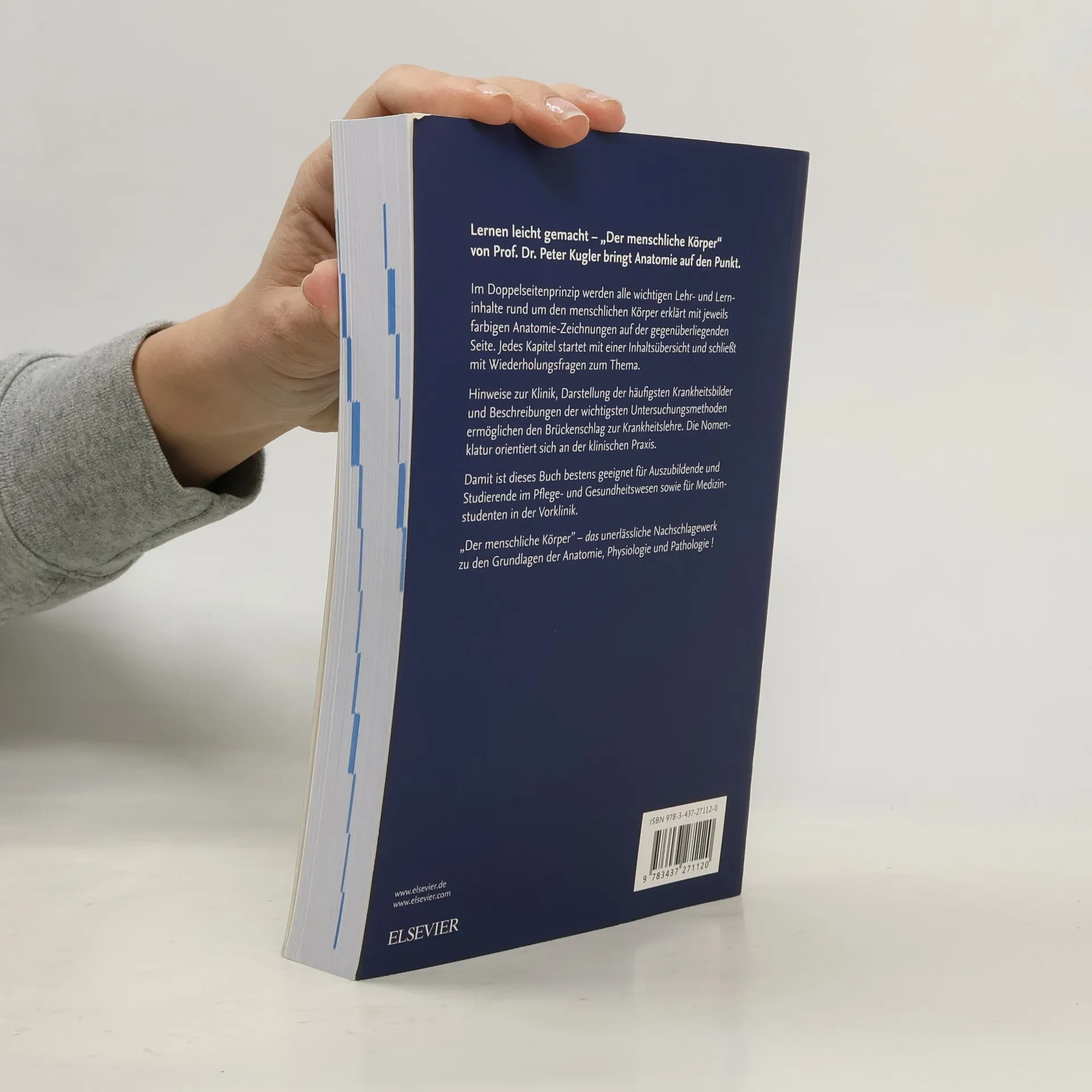 Lernen leicht gemacht – ''Der menschliche Körper'' von Prof. Dr. Peter Kugler bringt Anatomie auf den Punkt. Das opulent bebilderte Taschenbuch enthält alle wichtigen Lehr- und Lerninhalte rund um den menschlichen Körper – für Auszubildende und Studierende im Pflege- und Gesundheitswesen sowie für Medizinstudenten in der Vorklinik. Alles gut erklärt: Hervorragende, farbige Zeichnungen illustrieren die fundierten Textinhalte. So wird Lernen leicht: Die gegenüberstehenden Text-Bild-Einheiten machen die Inhalte besonders übersichtlich und erleichtern das Lernen ebenso wie die Inhaltsübersichten zu Beginn der Kapitel. Praxisnah mit klinischen Bezügen: Klinische Hinweise, die häufigsten Krankheitsbilder und Beschreibungen der wichtigsten Untersuchungsmethoden ermöglichen den Brückenschlag zur Krankheitslehre. Die Nomenklatur orientiert sich an der klinischen Praxis. Besser einprägen: Wiederholungsfragen am Ende der Kapitel dienen der gezielten Prüfungsvorbereitung. Schnell Nachschlagen, schnell Zurechtfinden: Ein umfangreiches Sachregister ermöglicht das gezielte Nachschlagen, die anatomischen, physiologischen und pathologischen Inhalte sind jeweils mit eigener Überschriftsfarbe gekennzeichnet.