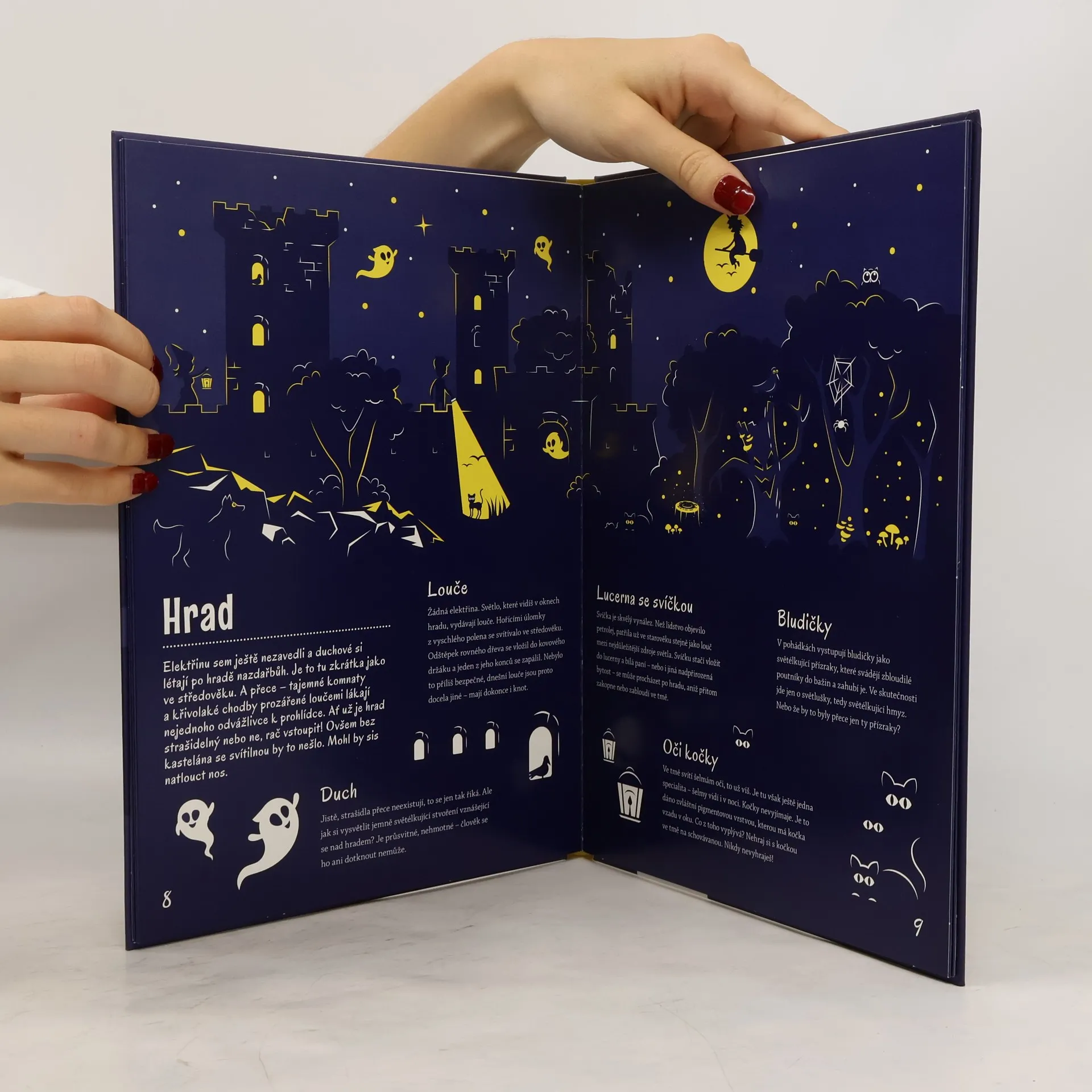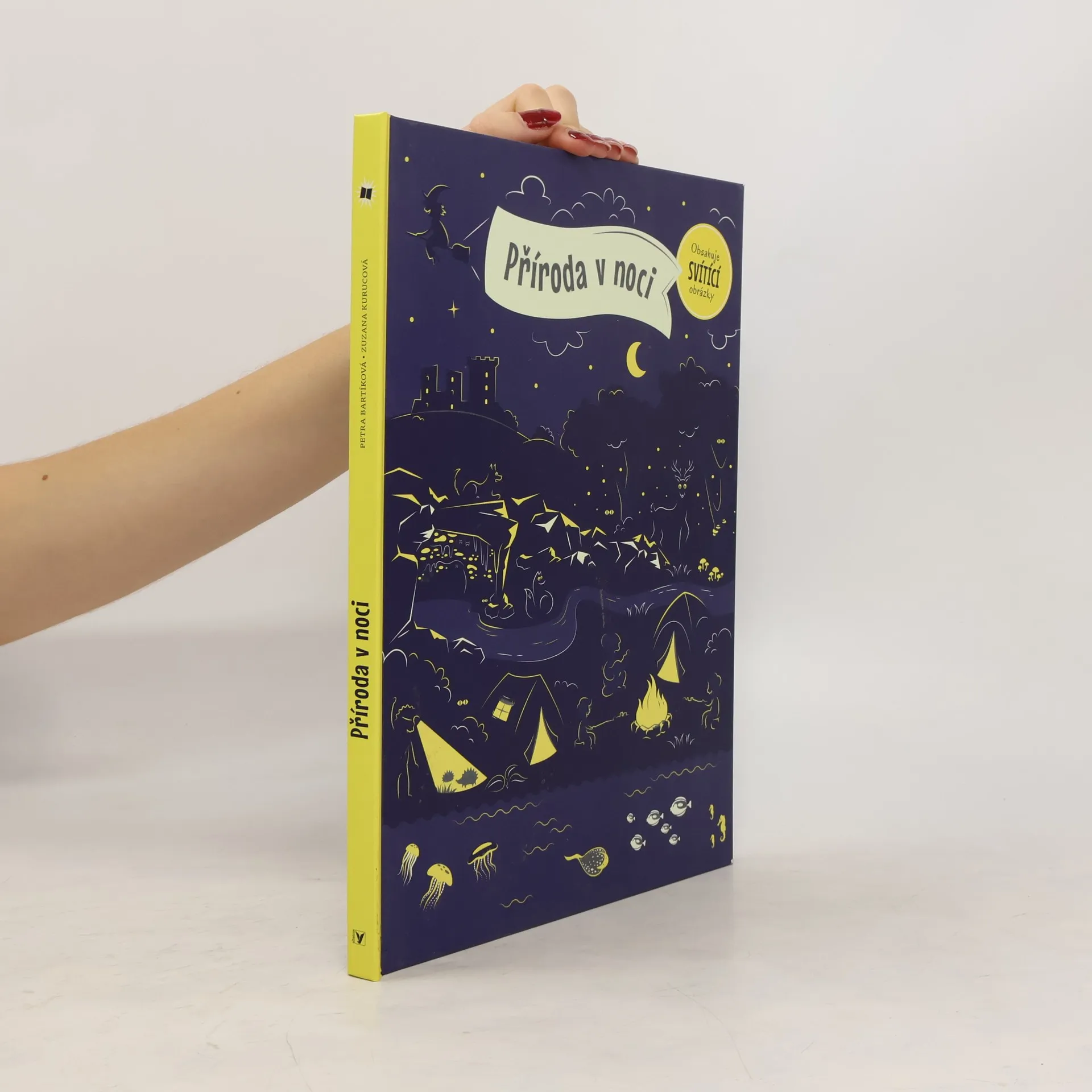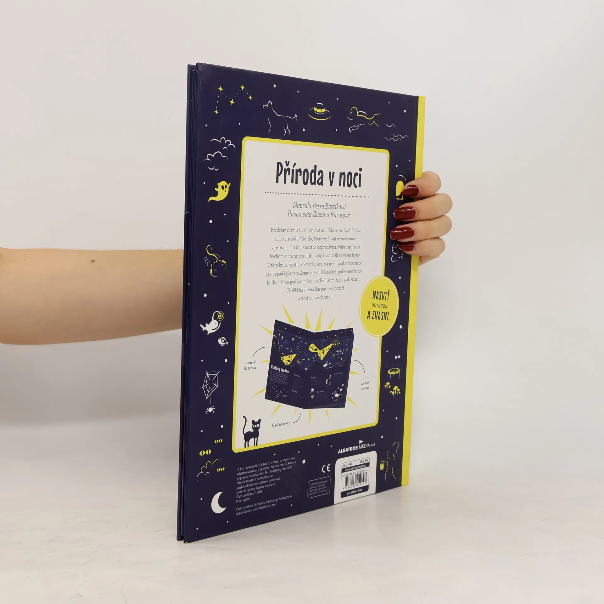 Představ si tmu a v ní jen dvě oči. Kdo se to dívá? Kočka, nebo strašidlo? Světlo, které vydávají různí tvorové v přírodě, fascinuje lidstvo odpradávna. Vůbec nejradši bychom si na ně posvítili – abychom měli ve všem jasno. V této knize zjistíš, co svítí v lese, na nebi i pod vodou nebo jak vypadá planeta Země v noci. Až dočteš, polož otevřenou knihu přímo pod lampičku. Počkej pár minut a pak zhasni. Cvak! Nasvícená ilustrace se rozzáří ve tmě do všech stran!