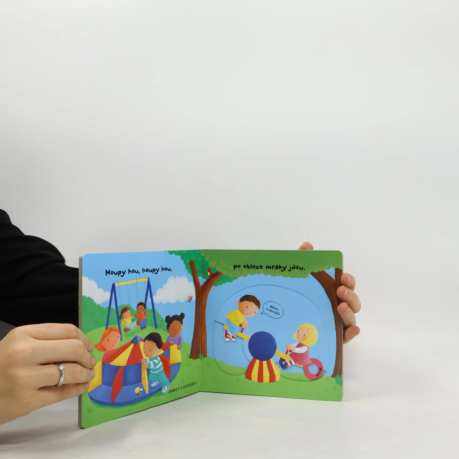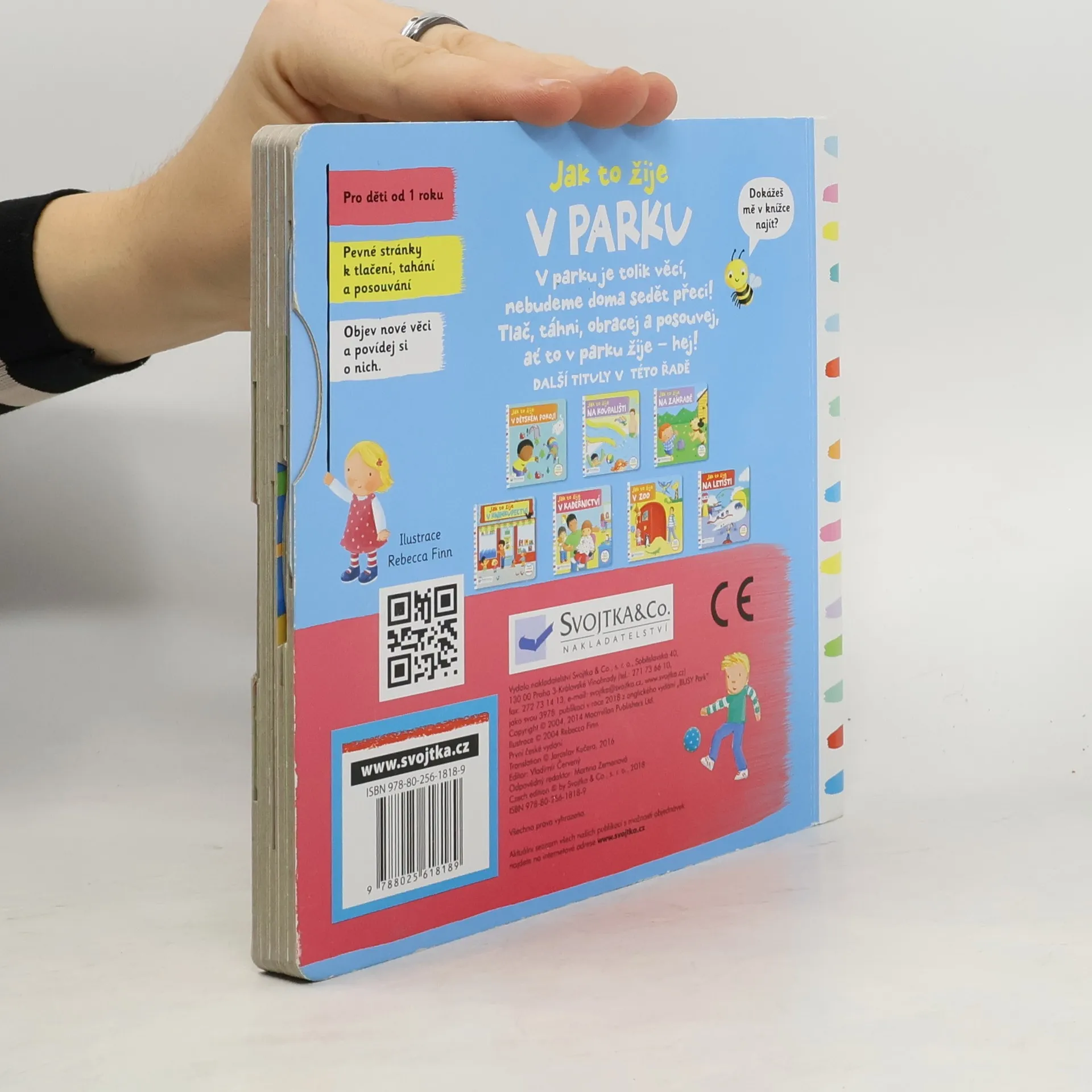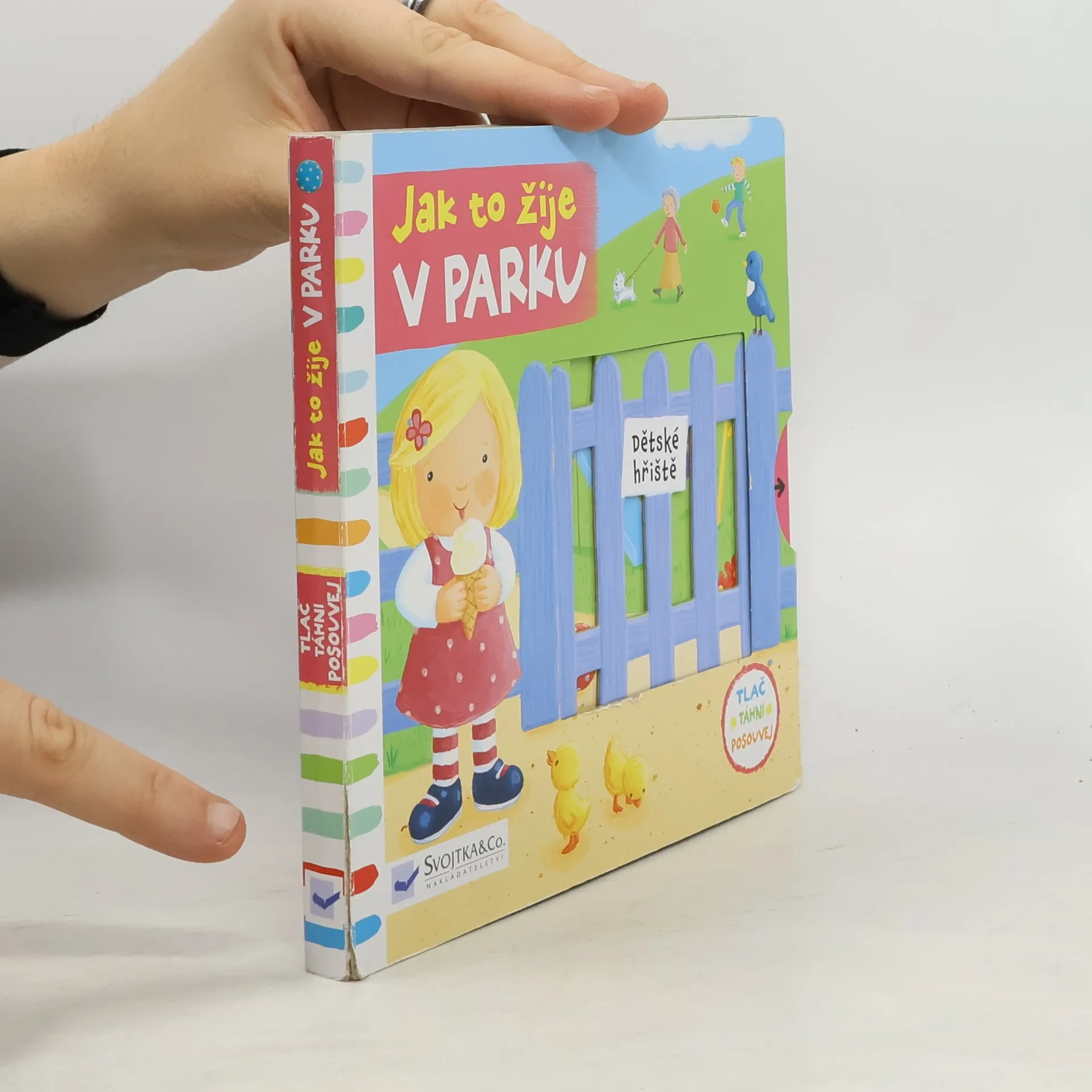 Leporelo je určeno pro děti od jednoho roku. Má pevné stránky s posuvnými a otočnými prvky. Zjisti, jak to žije v parku, a procvič si svoji jemnou motoriku. Zajímá tě, jak to žije v parku? Houpy hou, houpy hou, pohoupej děti na houpačce! Zjisti, kdo se rád schovává ve stromě! Podívej, plavou v jezírku rybky? Toto dětské leporelo je určeno pro děti od jednoho roku. Má pevné stránky s posuvnými a otočnými prvky, a tak si dítě při prohlížení knížky současně procvičí jemnou motoriku – může na jednotlivých stránkách posouvat, tahat, otáčet. Objeví nové věci a můžete si o nich společně povídat! Tak honem, v parku se děje tolik věcí!