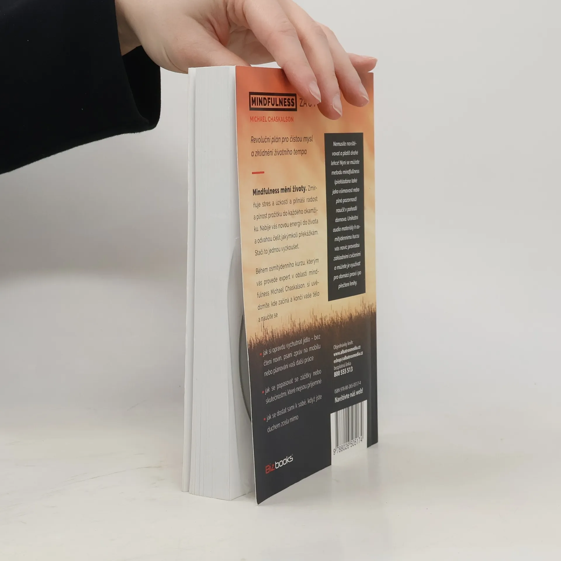Revoluční plán pro čistou mysl a zklidnění životního tempa Stres, vyčerpání, roztěkanost, deprese – všechny tyto potíže mají společné řešení: MINDFULNESS. Mindfulness mění životy. Zmírňuje stres a úzkosti a přináší radost a plnost prožitku do každého okamžiku. Nabije vás novou energií do života a odvahou čelit jakýmkoli překážkám. Stačí to jednou vyzkoušet. Během osmitýdenního kurzu, kterým vás provede expert v oblasti mindfulness Michael Chaskalson, si uvědomíte, kde začíná a končí vaše tělo a naučíte se * jak si opravdu vychutnat jídlo – bez čtení novin, psaní zpráv na mobilu nebo plánování vaší další práce * jak se popasovat se zážitky nebo skutečnostmi, které nejsou příjemné * jak se dostat sami k sobě, když jste duchem zcela mimo Nemusíte navštěvovat a platit drahé lekce! Nyní se můžete metodu mindfullness (překládáno také jako VŠÍMAVOST nebo plná pozornost) naučit v pohodlí domova.