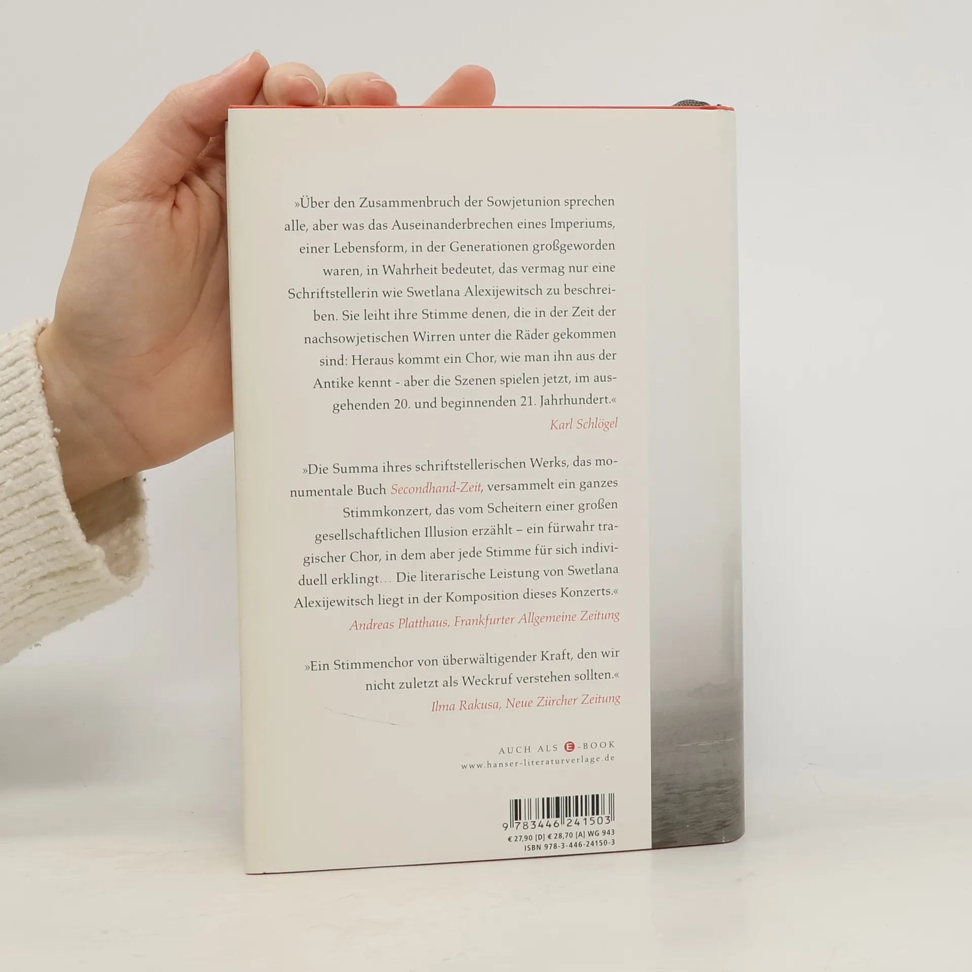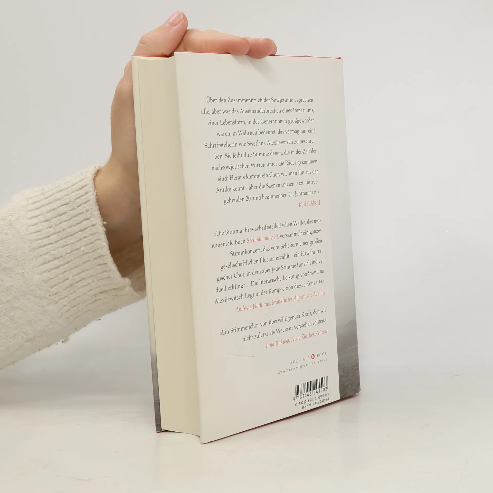 Der Kalte Krieg ist seit über zwanzig Jahren vorbei, doch das postsowjetische Russland sucht noch immer nach einer neuen Identität. Während man im Westen nach wie vor von der Gorbatschow-Zeit schwärmt, will man sie in Russland am liebsten vergessen. Inzwischen gilt Stalin dort vielen, auch unter den Jüngeren, wieder als großer Staatsmann, wie überhaupt die sozialistische Vergangenheit immer öfter nostalgisch verklärt wird. Für Swetlana Alexijewitsch leben die Russen gleichsam in einer Zeit des „secondhand“, der gebrauchten Ideen und Worte. Wie ein vielstimmiger Chor erzählen die Menschen in ihrem neuen Buch von der radikalen gesellschaftlichen Umwälzung in den zurückliegenden Jahren.