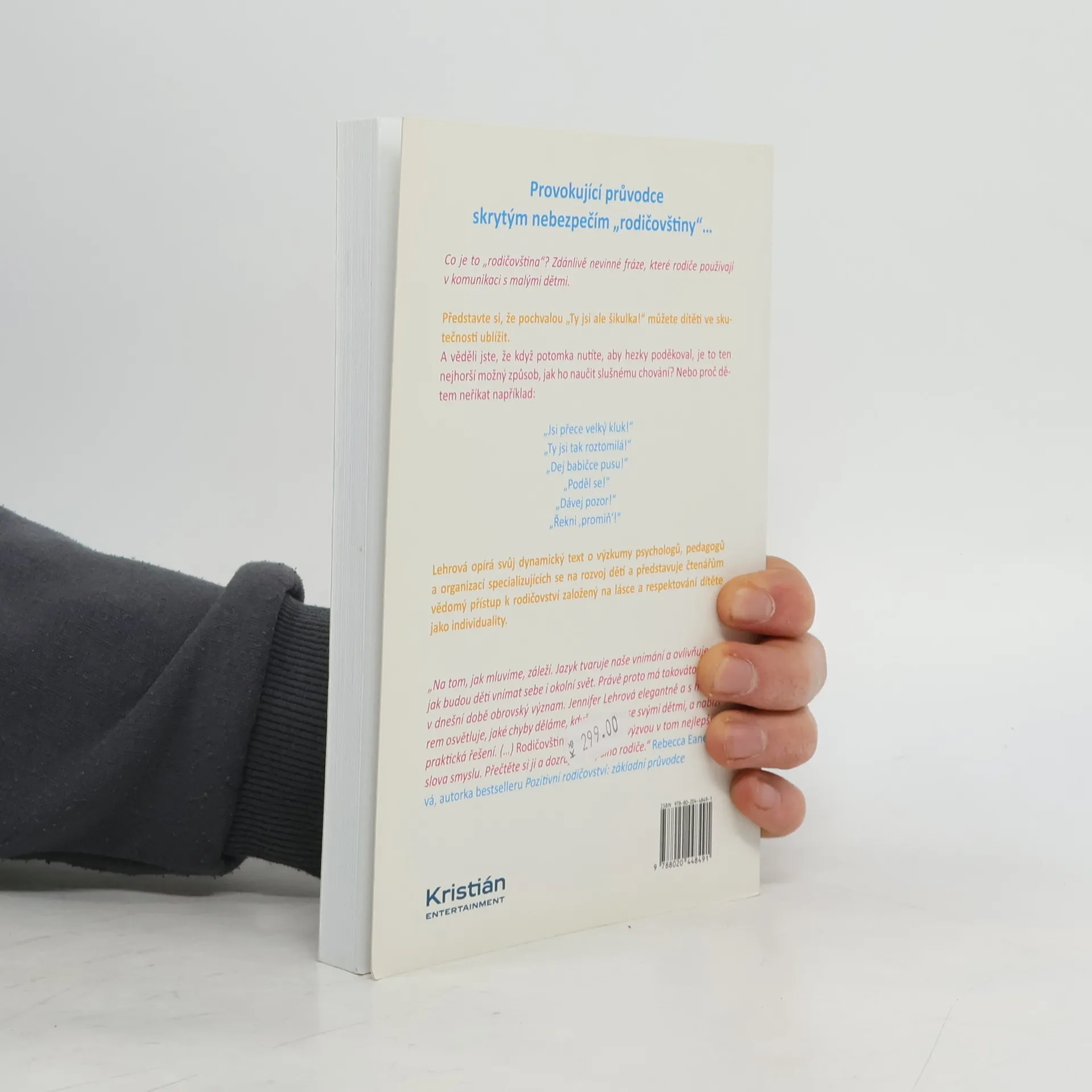 Co je to ,,rodičovština"? Zdánlivě nevinné fráze, které rodiče používají v komunikaci s malými dětmi. Představte si, že pochvalou ,,To se ti moc povedlo"! můžete dítěti ve skutečnosti ublížit. A věděli jste, že když potomka nutíte, aby hezky poděkoval, je to ten nejhorší možný způsob, jak ho naučit slušnému chování? Jennifer Lehrová je chytrá, vtipná a nebojácná autorka, která ,,převrátí vzhůru nohama všechny vaše zažité představy o rodičovství." ( Jennifer Jason Leighová). Lehrová opírá svůj dynamický text o výzkumy psychologů, pedagogů a organizací specializujících se na rozvoj dětí a představuje čtenářům vědomý přístup k rodičovství založený na lásce a respektování dítěte jako individuality.