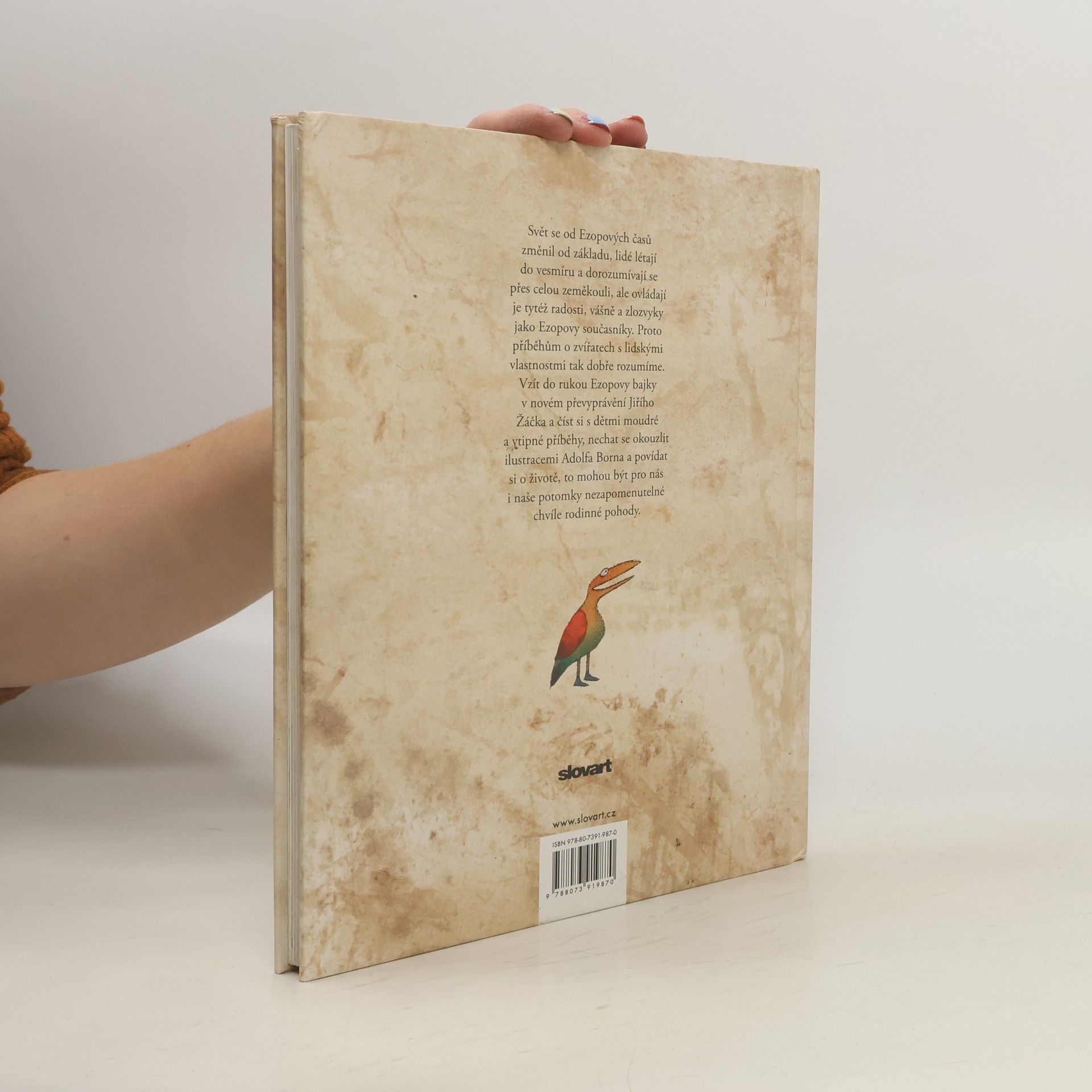 Podle dějepisce Herodota žil v Malé Asii v 6. století před Kristem otrok Aisopos čili Ezop. Byl prý hrbatý, znetvořený a koktavý, ale hlavu měl bystřejší a myšlení pronikavější než lidé urostlí a zdraví. Uměl pobavit posluchače zvířecími bajkami a vtipnými příběhy, ale zdaleka ne všichni jeho současníci byli jeho obdivovatelé. Traduje se, že byl v Delfách popraven za údajné rouhání bohům. Ezopovi byla připisována většina starověkých bajek, zapsány však byly až po třech stoletích od jeho smrti. Mnohokrát byly převyprávěny prózou i ve verších a najde se jen málo těch, co by nevěděli, kdo byl Ezop. Ale ať už se ten moudrý muž jmenoval Ezop, nebo jinak, ať už žil v 6. století před Kristem, anebo jindy, ať už byl thráckého původu, nebo jného, hlavní je, že jeho bajky dodnes nezestárly. Svět se za tu dobu změnil od základu, lidé létají do vesmíru a dorozumívají se přes celou zeměkouli, ale ovládají je tytéž radosti, vášně a zlozvyky jako Ezopovy současníky. Proto jim tak dobře rozumíme - dospělí i děti. Vzít do rukou převyprávění Ezopových bajek od Jiřího Žáčka a číst si s dětmi moudré a vtipné příběhy, prohlížet si ilustrace Adolfa Borna a povídat si o životě, to může být chvíle, která se nám zapíše do paměti.
