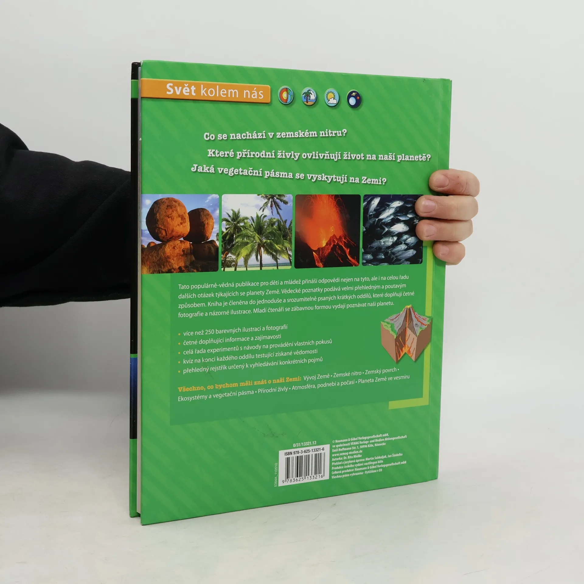 Co se nachází v zemském nitru? Které přírodní živly ovlivňují život na naší planetě? Jaká vegetační pásma se vyskytují na Zemi? Naše Země / svět kolem nás je encyklopedií pro děti a mládež a přináší odpovědi na tyto, ale i na celou řadu dalších otázek týkajících se planety Země. Vědecké poznatky podává velmi přehledným a poutavým způsobem. Je členěna do jednoduše a srozumitelně psaných krátkých oddílů, které doplňuje více než 250 barevných ilustrací a fotografií. Kromě četných informací a zajímavostí v ní najdete i celou řadu experimentů s návody na provádění vlastních pokusů. V kvízu na konci každého oddílu si můžete otestovat získané vědomosti. Vydejte se poznat naši planetu! (Stavba Země. Světadíly. Moře a oceány. Počasí)