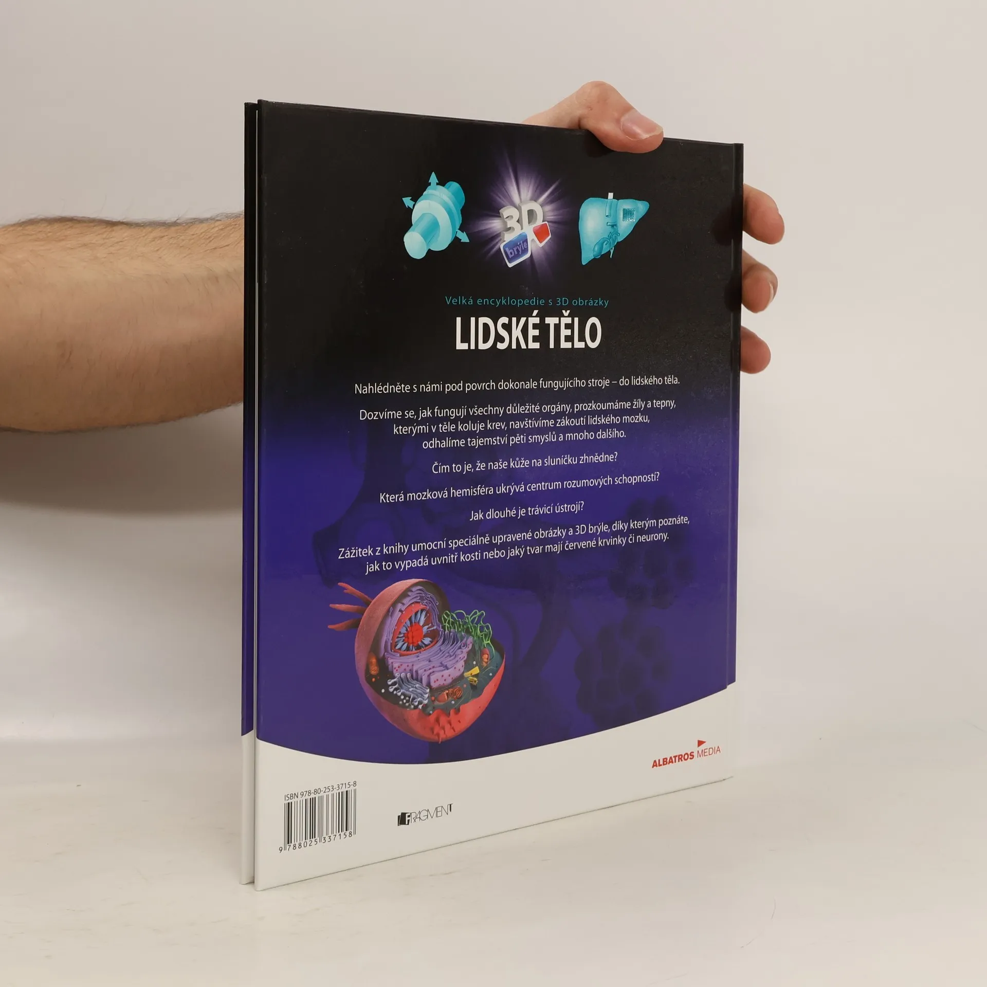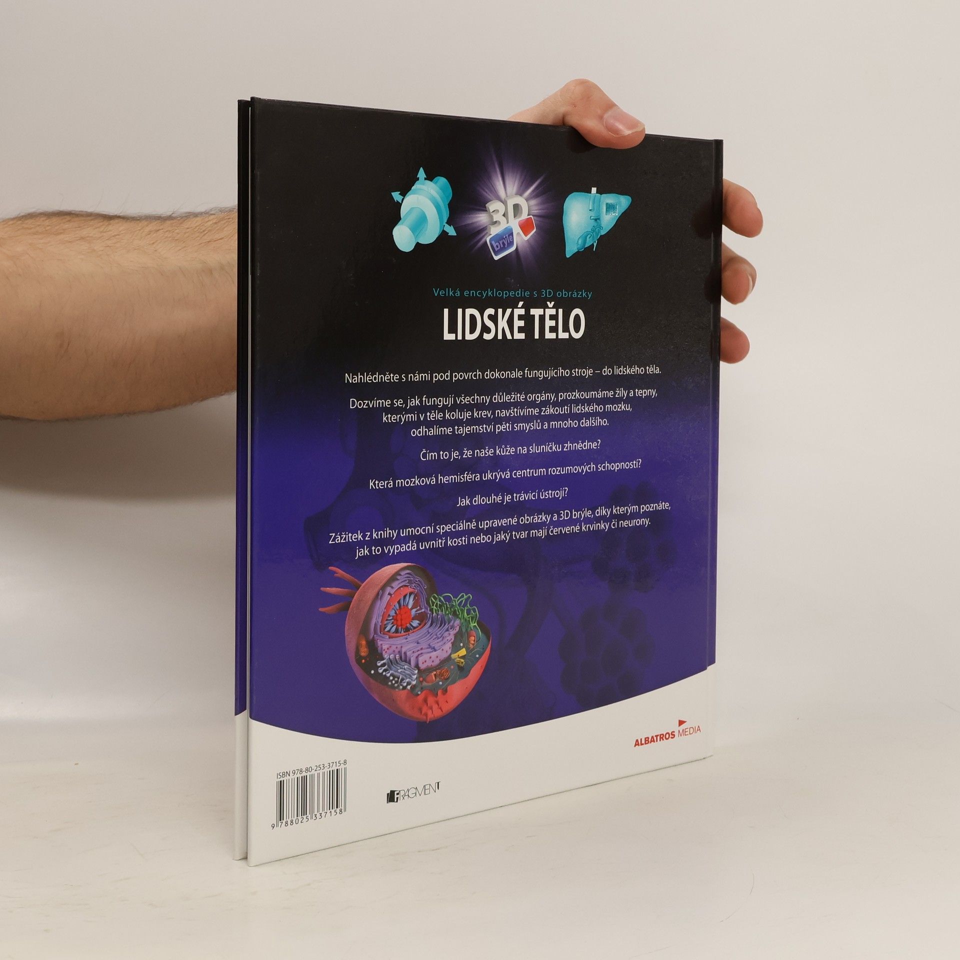 Nahlédněne s námi pod povrch dokonale fungujícího stroje - do lidského těla. Dozvíme se, jak fungují všechny důležité orgány, prozkoumáme žíly a tepny, kterými v těle koluje krev, navštívíme zákoutí lidského mozku, odhalíme tajemství pěti smyslů a mnoho dalšího. Čím to je, že naše kůže na sluníčku zhnědne? Která mozková hemisféra ukrývá centrum rozumových schopností? Jak dlouhé je trávicí ústrojí? Zážitek z knihy umocní speciálně upravené obrázky a 3D brýle, díky kterým poznáte, jak to vypadá uvnitř kosti nebo jaký tvar mají červené krvinky či neurony.
