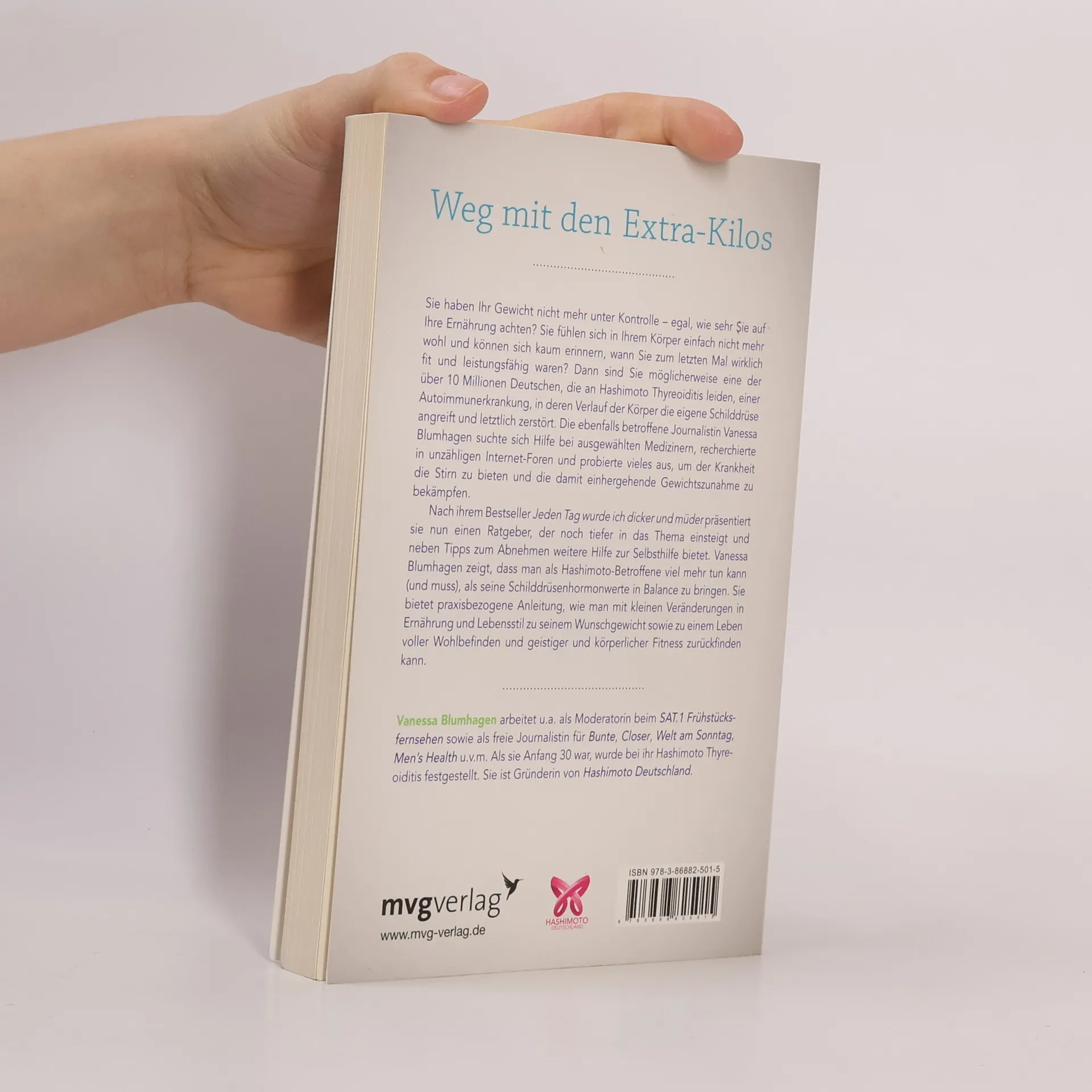 Hashimoto Thyreoiditis ist eine Autoimmunerkrankung, in deren Verlauf der Körper die eigene Schilddrüse angreift und letzten Endes zerstört. Über zehn Millionen Menschen in Deutschland, v. a. Frauen, leiden daran. Zu den Symptomen gehören Schlafstörungen, Depressionen, Zyklusveränderungen, Haarausfall, plötzlich auftretende Nahrungsmittelunverträglichkeiten und vor allem unkontrollierte Gewichtszunahme. Zu allem Überdruss wird man die zusätzlichen Kilos nur schwer wieder los, es genügt nicht, ein paar Kalorien einzusparen und sich ein bisschen mehr zu bewegen. Vanessa Blumhagen liefert einen umfassenden und detailliert recherchierten Ratgeber, in dem sie anhand ihrer eigenen Erfahrungen beschreibt, wie sie die elf Kilo, die sie ungewollt zugenommen hatte, wieder loswurde und zu ihrem Wohlfühlgewicht zurückfand. Sie erläutert alle Bausteine, von Medikamenteneinnahme über spezielle Ernährung bis hin zur nachhaltigen Veränderung von Gewohnheiten, die wirksam gegen die überflüssigen Kilos sind, und klärt auf, was die absoluten Abnehm-Verhinderer sind. Sie zeigt einen Weg, sich auch mit Hashimoto wieder dauerhaft wohl in seiner Haut zu fühlen.