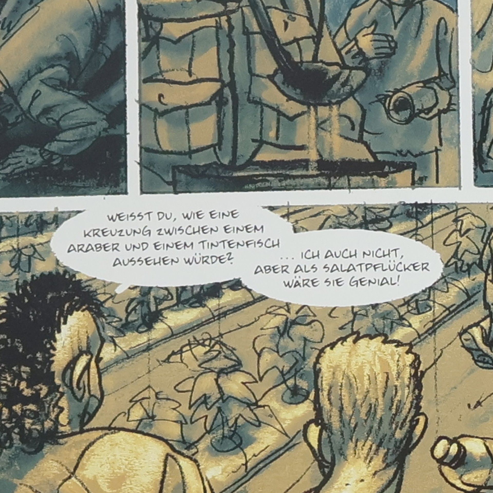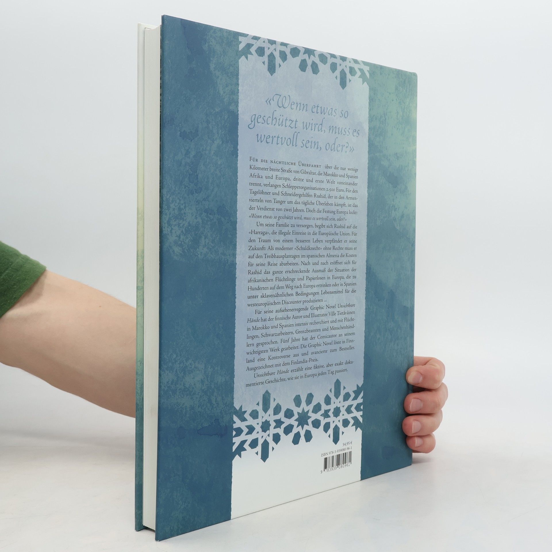 Für die nächtliche Überfahrt über die Straße von Gibraltar verlangen Schlepperorganisationen 2.500 Euro, was für den Tagelöhner Rashid, der in den Armenvierteln von Tanger lebt, der Verdienst von zwei Jahren ist. Die Festung Europa zieht ihn an: „Wenn etwas so geschützt ist, muss es wertvoll sein.“ Um seine Familie zu unterstützen, begibt sich Rashid auf die „Harraga“, die illegale Einreise in die EU. Für den Traum eines besseren Lebens verpfändet er seine Zukunft und wird zum modernen „Schuldknecht“ ohne Rechte, der in Almeria auf Treibhausplantagen arbeiten muss, um die Kosten seiner Reise abzuzahlen. Dabei wird ihm das erschreckende Ausmaß der Situation afrikanischer Flüchtlinge und Papierloser in Europa bewusst, die auf ihrem Weg ertrinken oder unter sklavenähnlichen Bedingungen arbeiten. Der finnische Autor und Illustrator Ville Tietäväinen hat für seine Graphic Novel intensiv in Marokko und Spanien recherchiert und mit Flüchtlingen, Schwarzarbeitern und Menschenhändlern gesprochen. Nach fünf Jahren Arbeit wurde die Graphic Novel in Finnland zum Bestseller und löste eine Kontroverse aus. „Unsichtbare Hände“ erzählt eine fiktive, aber exakt dokumentierte Geschichte, die täglich in Europa passiert. Zwei Euro von jedem verkauften Exemplar gehen an Pro Asyl.