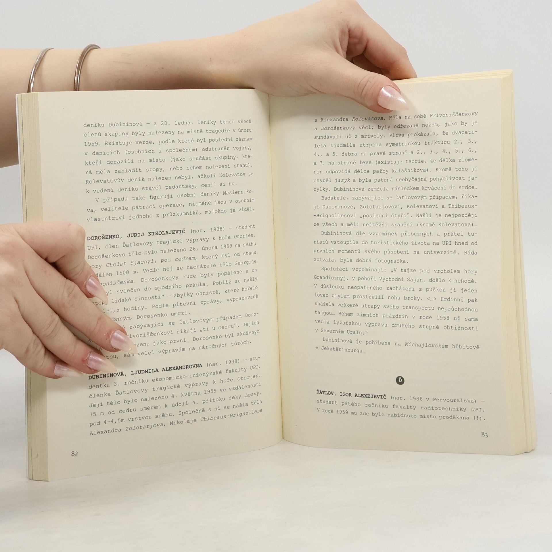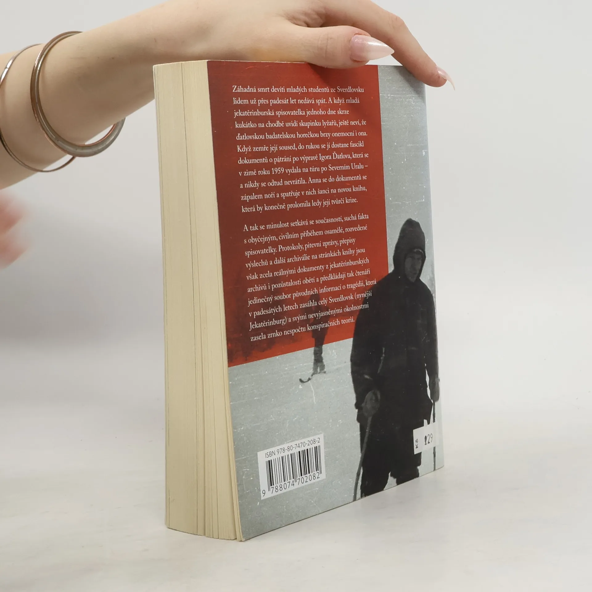 Záhadná smrt devíti mladých studentů ze Sverdlovsku lidem už přes padesát let nedává spát. A když mladá jekatěrinburská spisovatelka jednoho dne skrze kukátko na chodbě uvidí skupinku lyžařů, ještě neví, že ďatlovovskou badatelskou horečkou brzy onemocní i ona. Když zemře její soused, do rukou se jí dostane fascikl dokumentů o pátrání po výpravě Igora Ďatlova, která se v zimě roku 1959 vydala na túru po Severním Uralu – a nikdy se odtud nevrátila. Anna se do dokumentů se zápalem noří a spatřuje v nich šanci na novou knihu, která by konečně prolomila ledy její tvůrčí krize. A tak se minulost setkává se současností, suchá fakta s obyčejným, civilním příběhem osamělé, rozvedené spisovatelky. Protokoly, pitevní zprávy, přepisy výslechů a další archiválie na stránkách knihy jsou však zcela reálnými dokumenty z jekatěrinburských archivů i pozůstalosti obětí a předkládají tak čtenáři jedinečný soubor původních informací o tragédii, která v padesátých letech zasáhla celý Sverdlovsk (nynější Jekatěrinburg) a svými nevyjasněnými okolnostmi zasela zrnko nespočtu konspiračních teorií. – Kniha vychází za podpory moskevského Institutu překladu.