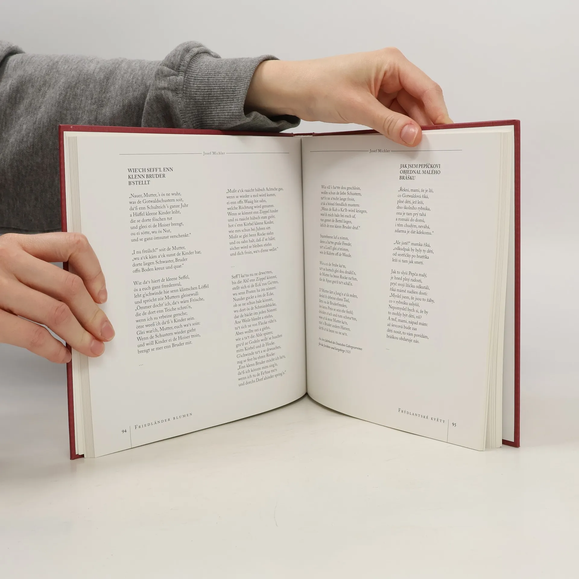 Plný titul: Frýdlantské květy: antologie německy píšících autorů z Frýdlantska a Liberecka : (19. století a 1. polovina 20. století) / Friedländer Blumen: Anthologie deutschsprachiger Autoren aus Friedland, Reichenberg und Umgebung : (19. Jahrhundert und 1. Hälfte des 20. Jahrhunderts). Dvojjazyčné vydání antologie německy píšících autorů, kteří tvořili na Frýdlantsku a Liberecku v 19. a 1. polovině 20. století, obsahuje různorodé texty 45 autorů včetně jejich medailonků a řady dobových i současných fotografií. Žánrově pestrá antologie navazuje na podobně sestavené tituly Ještědské květy a Jizerské květy. Tentokrát se editoři zaměřili na oblast Frýdlantska a Liberecka, kde do tohoto svazku našli díla celkem 45 autorů z období 19. a první poloviny 20. století. Čtenářům se tu představí povídky, paměti, úryvky z románů, básně, divadelní hry i historická studie. Každý z textů je uveden pečlivým medailonkem autora a celou knihu dotváří řada dobových i současných fotografií a dokumentů, které zobrazují autory i reálie, k nimž se jejich osudy či díla vztahují. Originální německé texty, stejně jako medailonky, jsou doplněny paralelním překladem.
