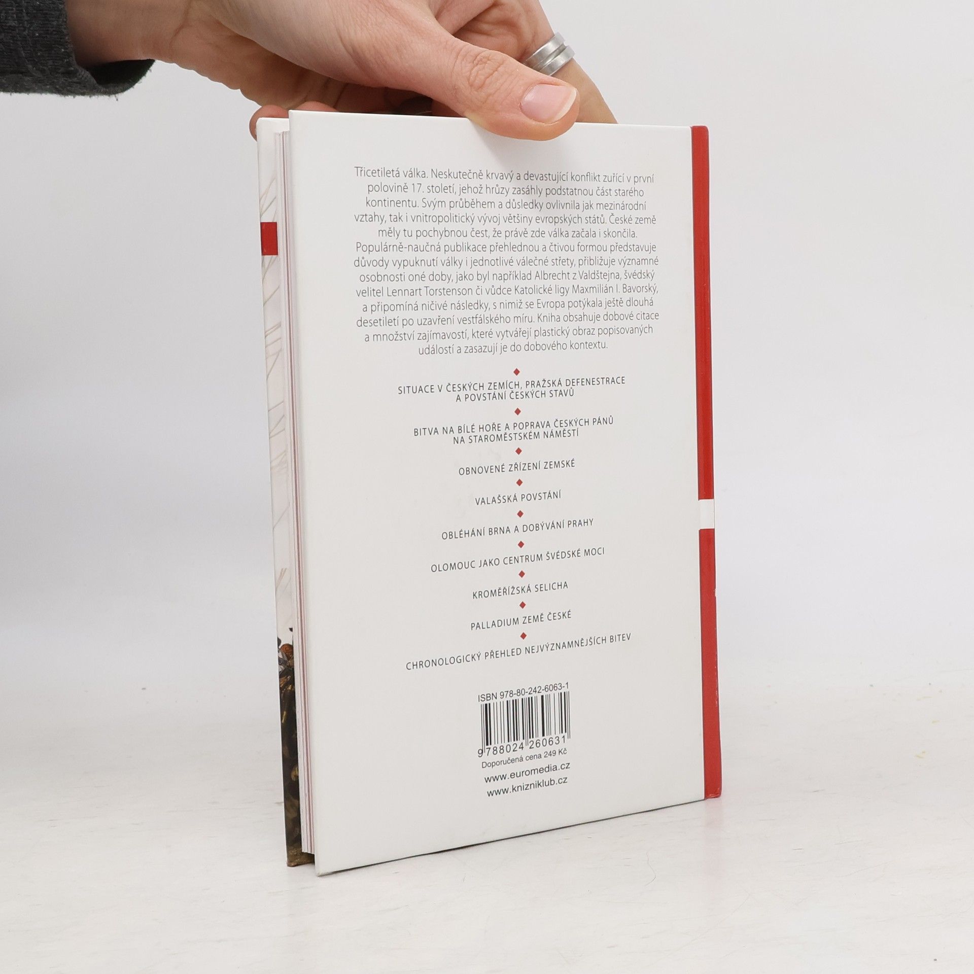 Populárně-naučná publikace pro širokou veřejnost přináší čtivou a srozumitelnou formou informace o třicetileté válce, která v 17. století zdevastovala podstatnou část evropského kontinentu včetně českých zemí. Autoři si všímají důležitých aspektů, ať už jde o důvody vypuknutí tohoto krvavého konfliktu, jednotlivé válečné střety, významné osobnosti nebo ničivé následky. Kniha obsahuje citace a množství doplňujících informací, které dohromady vytvářejí čtenářsky plastičtější obraz popisovaných událostí a zasazují je do dobového kontextu