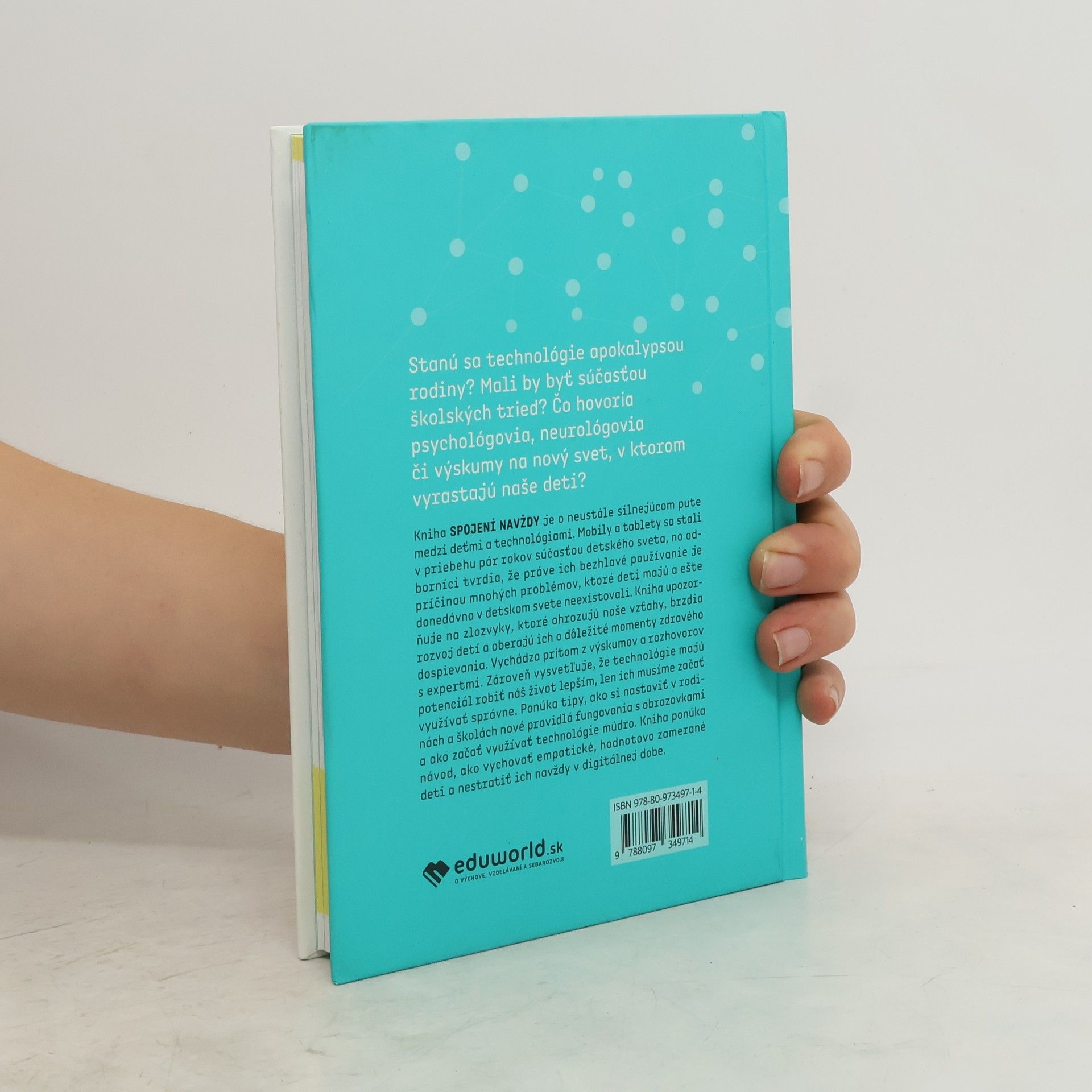 Kniha SPOJENÍ NAVŽDY je o neustále silnejúcom pute medzi deťmi a technológiami. Mobily a tablety sa stali v priebehu pár rokov súčasťou detského sveta, no odborníci tvrdia, že práve ich bezhlavé používanie je príčinou mnohých problémov, ktoré deti majú a ešte donedávna v detskom svete neexistovali. Kniha upozorňuje na zlozvyky, ktoré ohrozujú naše vzťahy, brzdia rozvoj detí a oberajú ich o dôležité momenty zdravého dospievania. Vychádza pritom z výskumov a rozhovorov s expertmi. Zároveň vysvetľuje, že technológie majú potenciál robiť náš život lepším, len ich musíme začať využívať správne. Prináša tipy, ako si nastaviť v rodinách a školách nové pravidlá fungovania s obrazovkami a ako začať využívať technológie múdro. Kniha ponúka návod, ako vychovať empatické, hodnotovo zamerané deti a nestratiť ich navždy v digitálnej dobe.