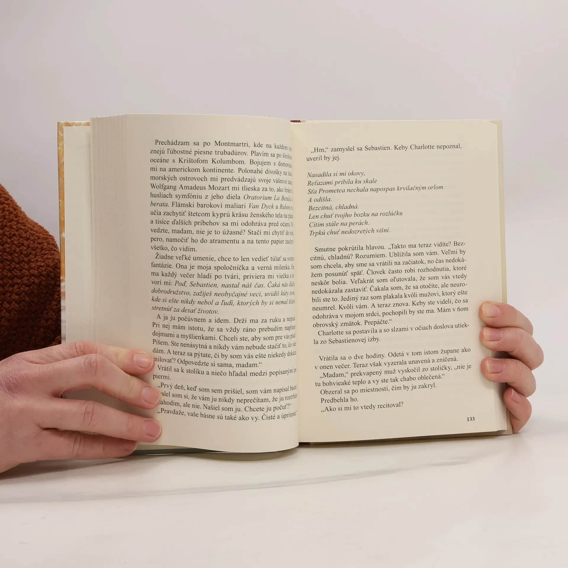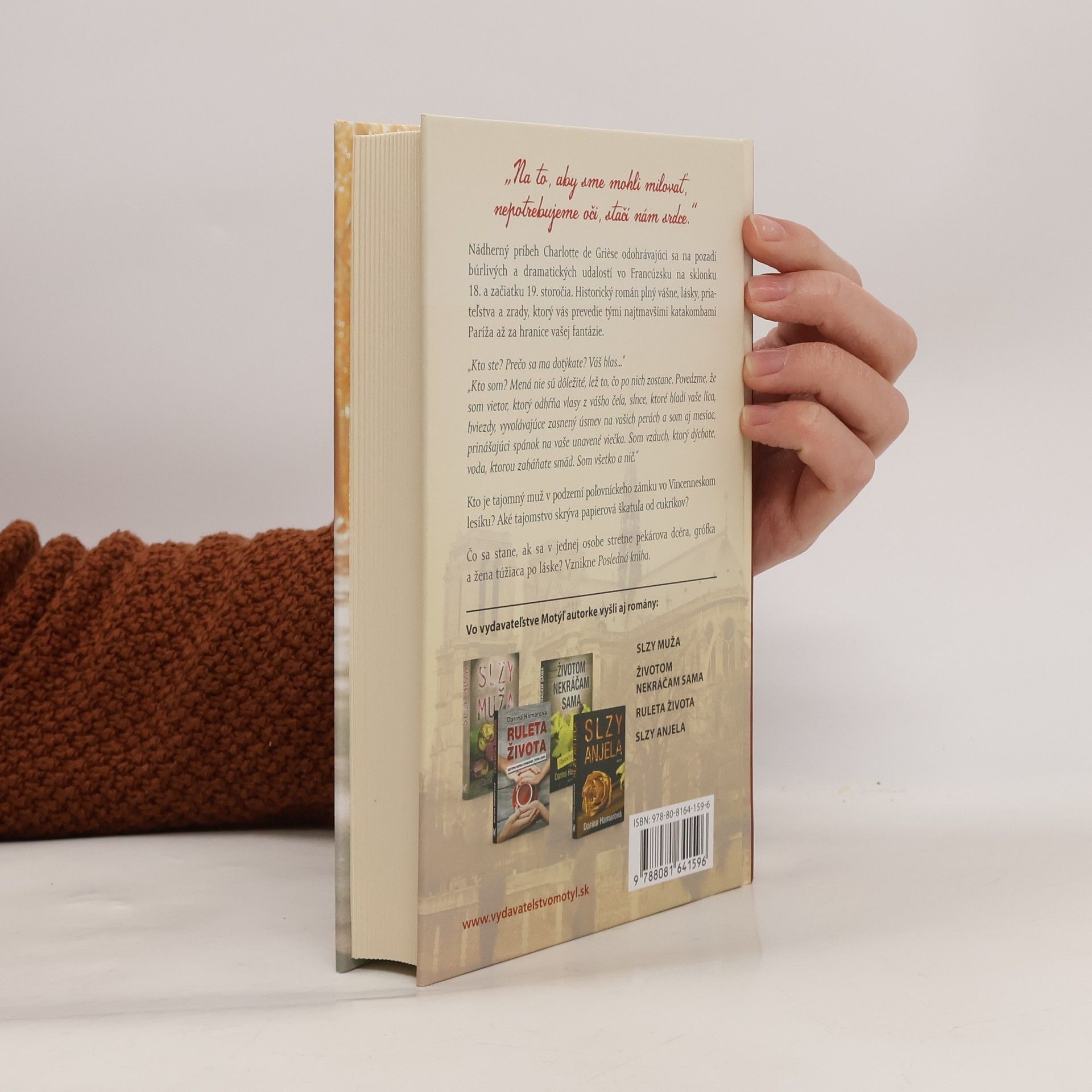 Na to, aby sme mohli milovať, nepotrebujeme oči, stačí nám srdce. Nádherný príbeh Charlotte de Grièse odohrávajúci sa na pozadí búrlivých a dramatických udalostí vo Francúzsku na sklonku 18. a začiatku 19. storočia. Historický román plný vášne, lásky, priateľstva a zrady, ktorý vás prevedie tými najtmavšími katakombami Paríža až za hranice vašej fantázie. „Kto ste? Prečo sa ma dotýkate? Váš hlas...“ „Kto som? Mená nie sú dôležité, lež to, čo po nich zostane. Povedzme, že som vietor, ktorý odhŕňa vlasy z vášho čela, slnce, ktoré hladí vaše líca, hviezdy, vyvolávajúce zasnený úsmev na vašich perách a som aj mesiac, prinášajúci spánok na vaše unavené viečka. Som vzduch, ktorý dýchate, voda, ktorou zaháňate smäd. Som všetko a nič.“ Kto je tajomný muž v podzemí poľovníckeho zámku vo Vincenneskom lesíku? Aké tajomstvo skrýva papierová škatuľa od cukríkov? Čo sa stane, ak sa v jednej osobe stretne pekárova dcéra, grófka a žena, túžiaca po láske? Vznikne Posledná kniha.