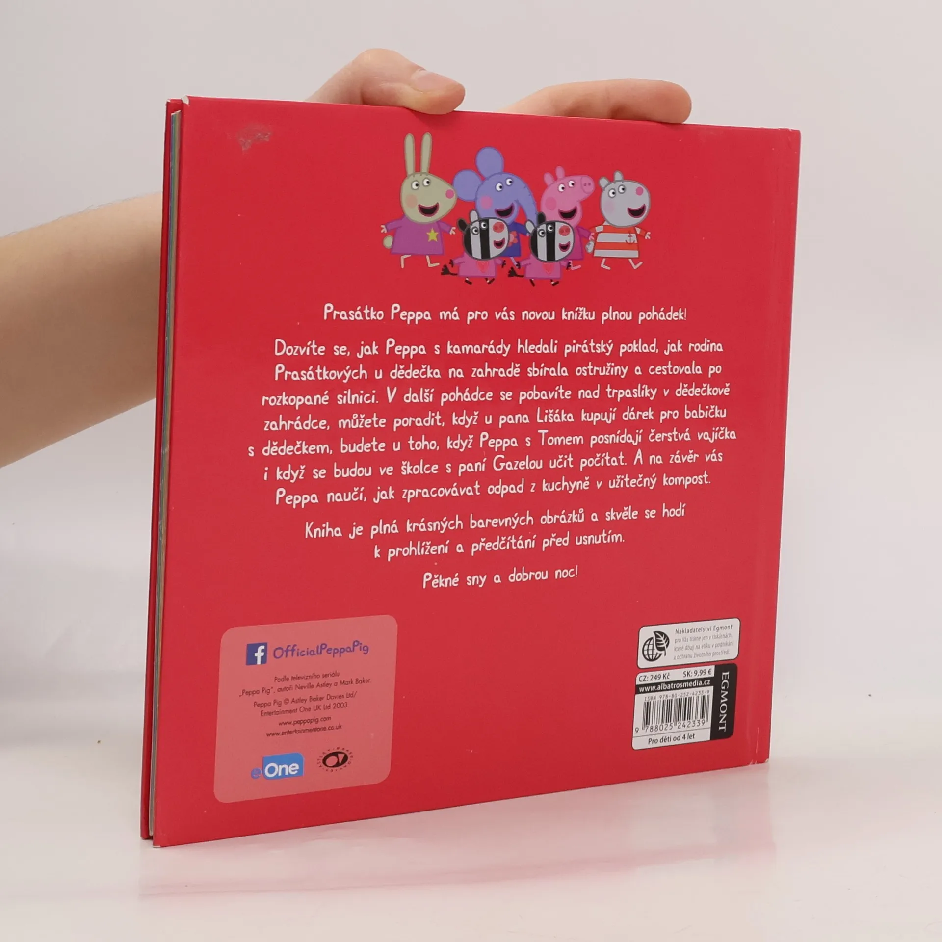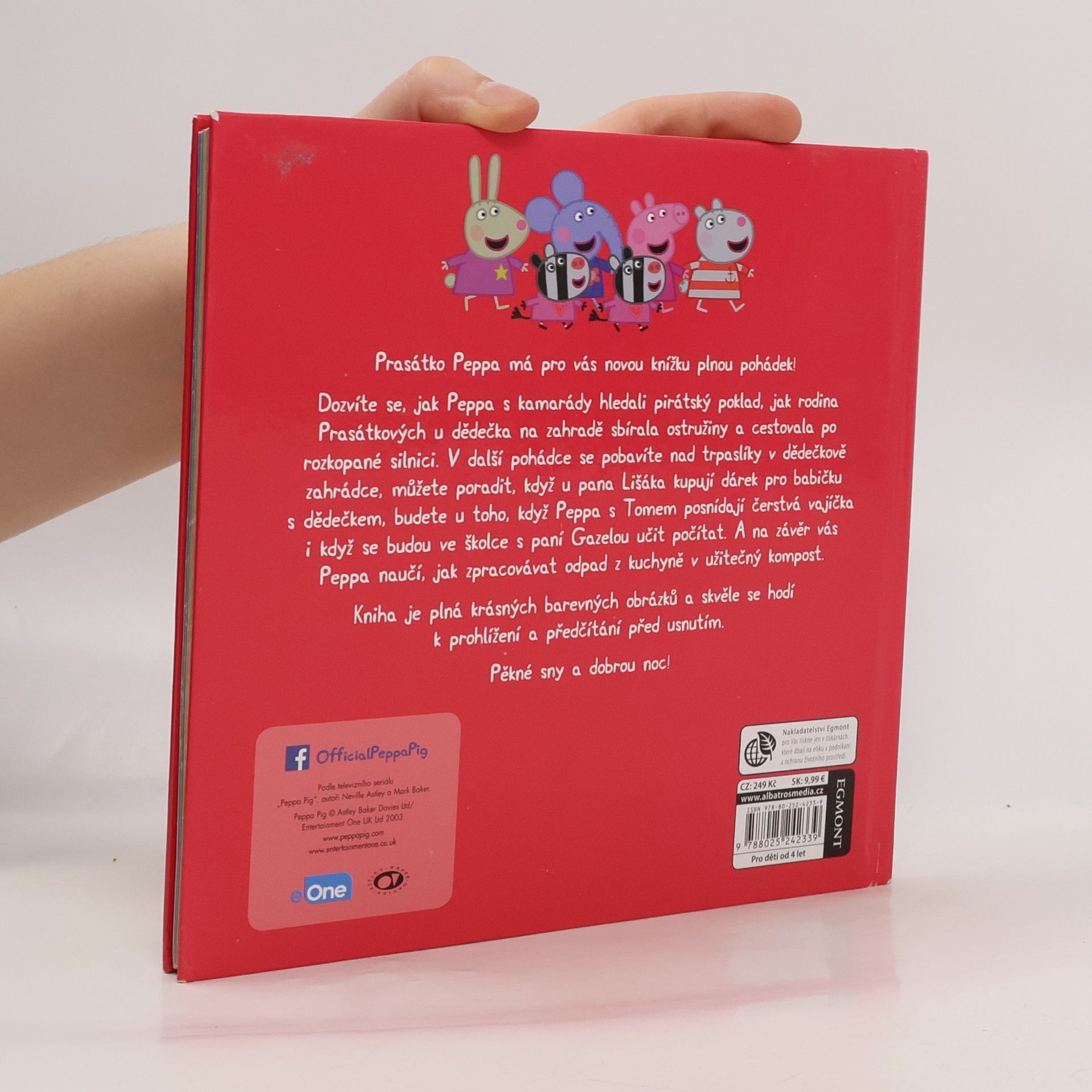 V nové knížce plné pohádek si přečtete, jak Peppa s kamarády hledala pirátský poklad nebo se ve školce učila počítat, o tom, jak s rodinou sbírali ostružiny, nakupovali u pana Lišáka, cestovali po rozkopané silnici, stavěli studnu přání, sbírali čerstvá vajíčka a vyráběli kompost. Knížka s krásnými obrázky se skvěle hodí k předčítání přes usnutím!