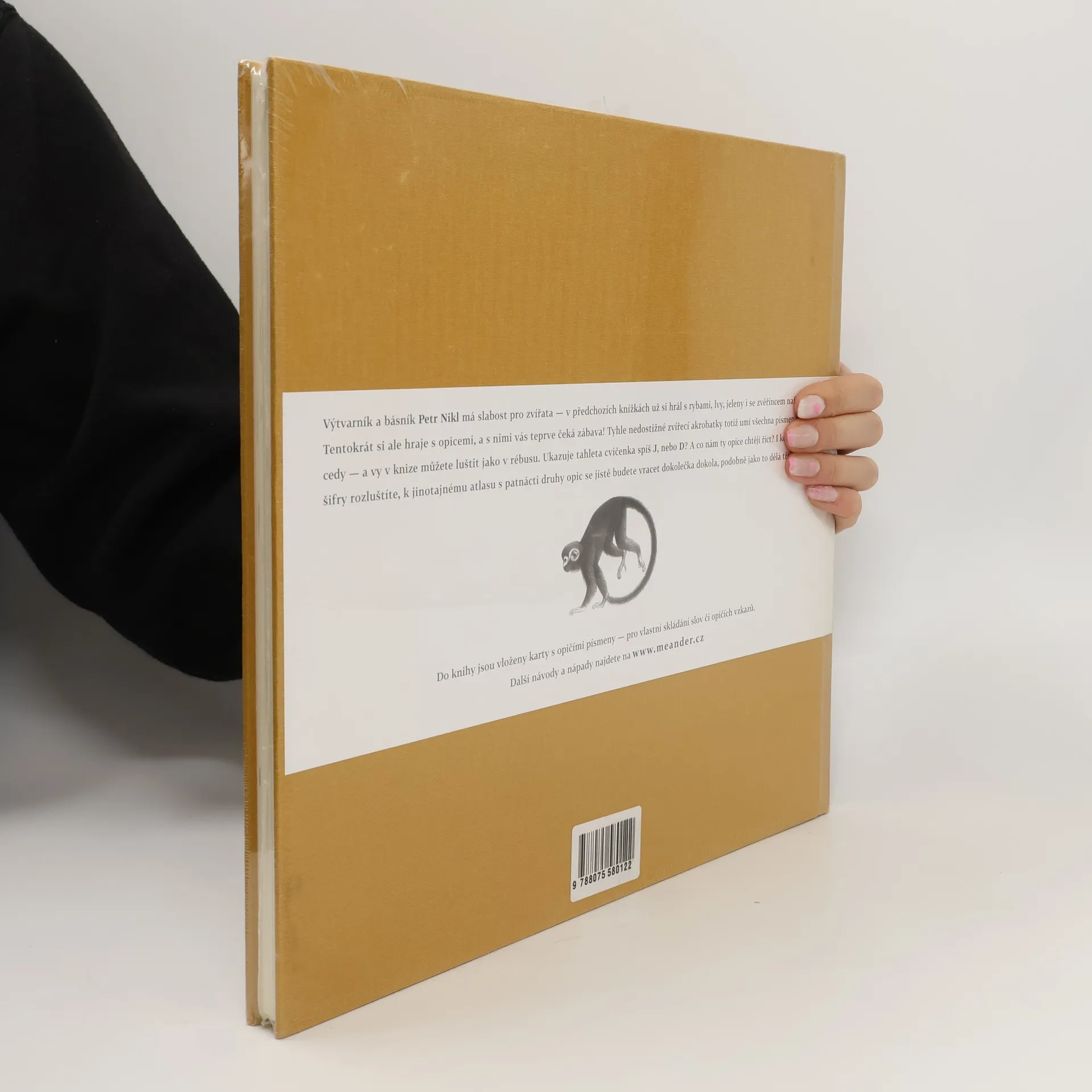 Petr Nikl má slabost pro zvířata – už si pohrával s rybami, lvy, jeleny, dokonce i se zvěřincem nafukovacím. Tentokrát se ale zaměřil na hravé akrobatky opice. A s těmi si teprve užijete legraci! Ve třináctém autorově svazku ze sebe totiž jednotlivé druhy lidoopů vyskládaly celou abecedu a vy si tak v knize můžete luštit jako v rébusu. Je támhleten šimpanz spíš J nebo I? Co se mi to ty opice snaží sdělit? A i když tajemství opičího písma rozluštíte, k tomuto originálnímu atlasu plného básní o různých druzích opic, se budete vracet stále znovu. Ted nezbývá než trénovat a cvičit, abyste už v příštím roce čínské Opice jejich tajuplný jazyk ovládali. Z doslovu spisovatele Ondřeje Hníka: Věděli jste, že opice jsou mistrynemi abecedy? Jestli ne, tak se o tom v Jinotajích opic sami přesvědčíte. Svými polehy, posezy a ocasy umí opice vykouzlit všechna písmena abecedy, a možná ještě mnohá další. A jsou to písmena krasopisná, neroztřesená, nerozpitá, zkrátka dokonalá. Až nadpozemsky krásná. …