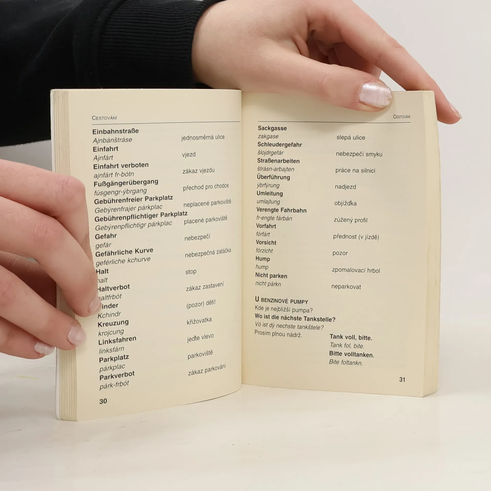 Konverzace zahrnující základní výrazy a fráze, důležité základní informace a fráze z oblasti cestování (vč. ubytování a stravování), kultury, sportu, služeb a užitečné výrazy ohledně úřadů, nákupování a zdraví.