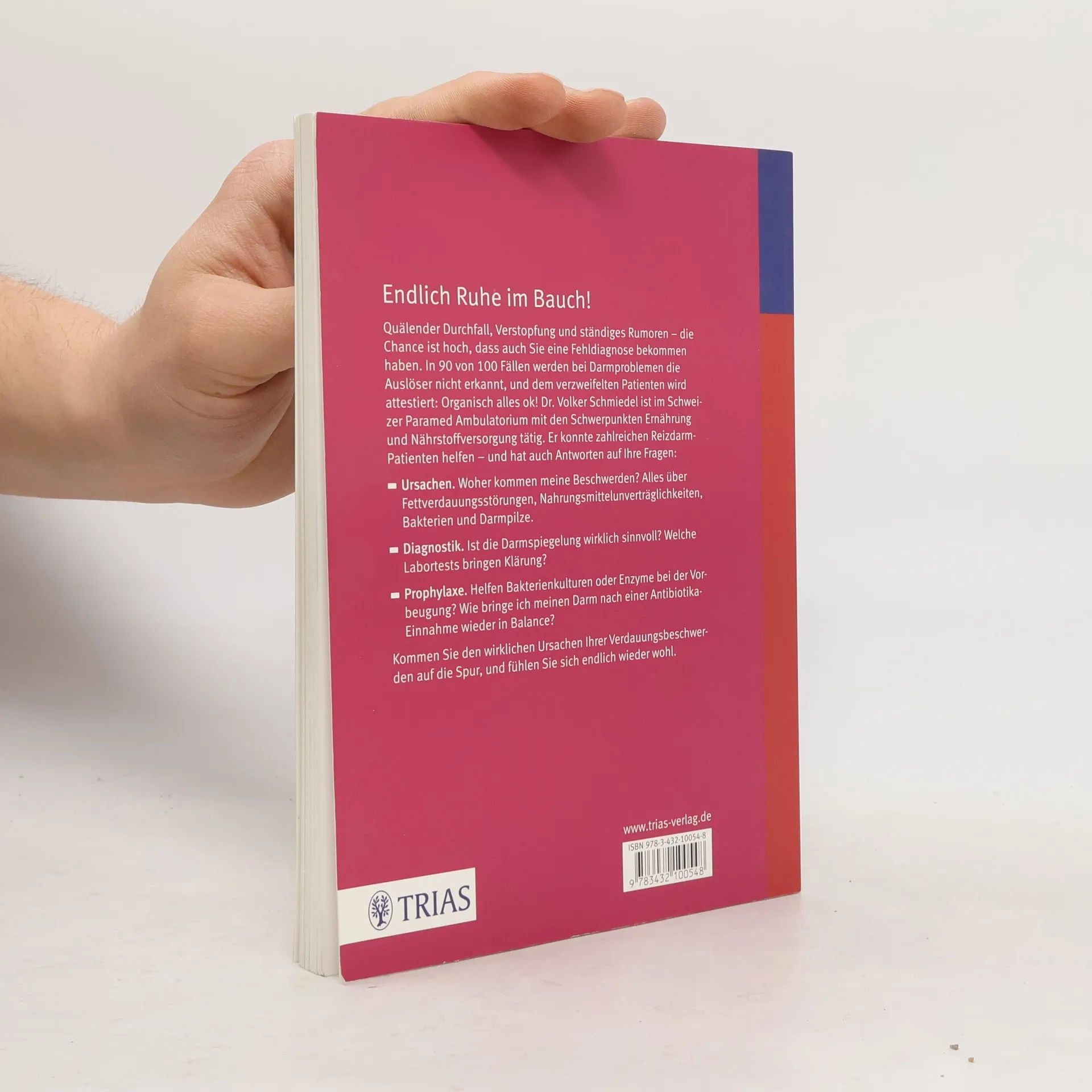 Endlich Ruhe im Bauch! Quälender Durchfall, Verstopfung und ständiges Rumoren - die Chance ist hoch, dass auch Sie eine Fehldiagnose bekommen haben. In 90 von 100 Fällen werden bei Darmproblemen die Auslöser nicht erkannt, und dem verzweifelten Patienten wird attestiert: Organisch alles ok! Dr. Volker Schmiedel ist im Schweizer Paramed Ambulatorium mit den Schwerpunkten Ernährung und Nährstoffversorgung tätig. Er konnte zahlreichen Reizdarm-Patienten helfen - und hat auch Antworten auf Ihre Fragen: Ursachen: Woher kommen meine Beschwerden? Alles über Fettverdauungsstörungen, Nahrungsmittelunverträglichkeiten, Bakterien und Darmpilze. Diagnostik: Ist die Darmspiegelung wirklich sinnvoll? Welche Labortests bringen Klärung? Prophylaxe. Helfen Bakterienkulturen oder Enzyme bei der Vorbeugung? Wie bringe ich meinen Darm nach einer Antibiotika-Einnahme wieder in Balance? Kommen Sie den wirklichen Ursachen Ihrer Verdauungsbeschwerden auf die Spur, und fühlen Sie sich endlich wieder wohl.