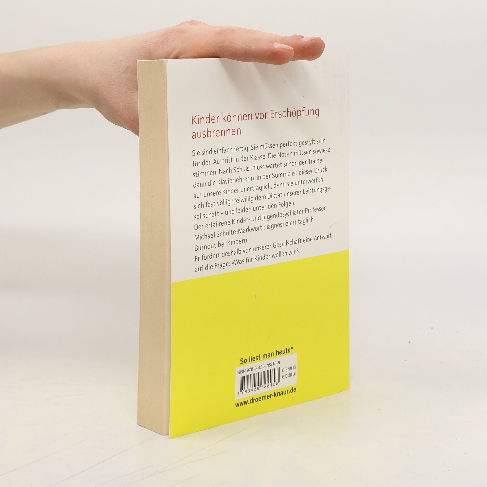 Sie sind oft ausgelaugt und fertig. Sie müssen perfekt gestylt sein für den Auftritt in der Klasse. Die Noten müssen stimmen. Nach Schulschluss wartet schon der Trainer, danach die Klavierlehrerin. In der Summe ist dieser Druck auf unsere Kinder unerträglich, denn sie unterwerfen sich meist völlig freiwillig dem Diktat der Leistungsgesellschaft. Professor Schulte-Markwort diagnostiziert täglich Burnout bei Kindern. Er fordert deshalb dringend eine Abkehr vom Leistungsideal.