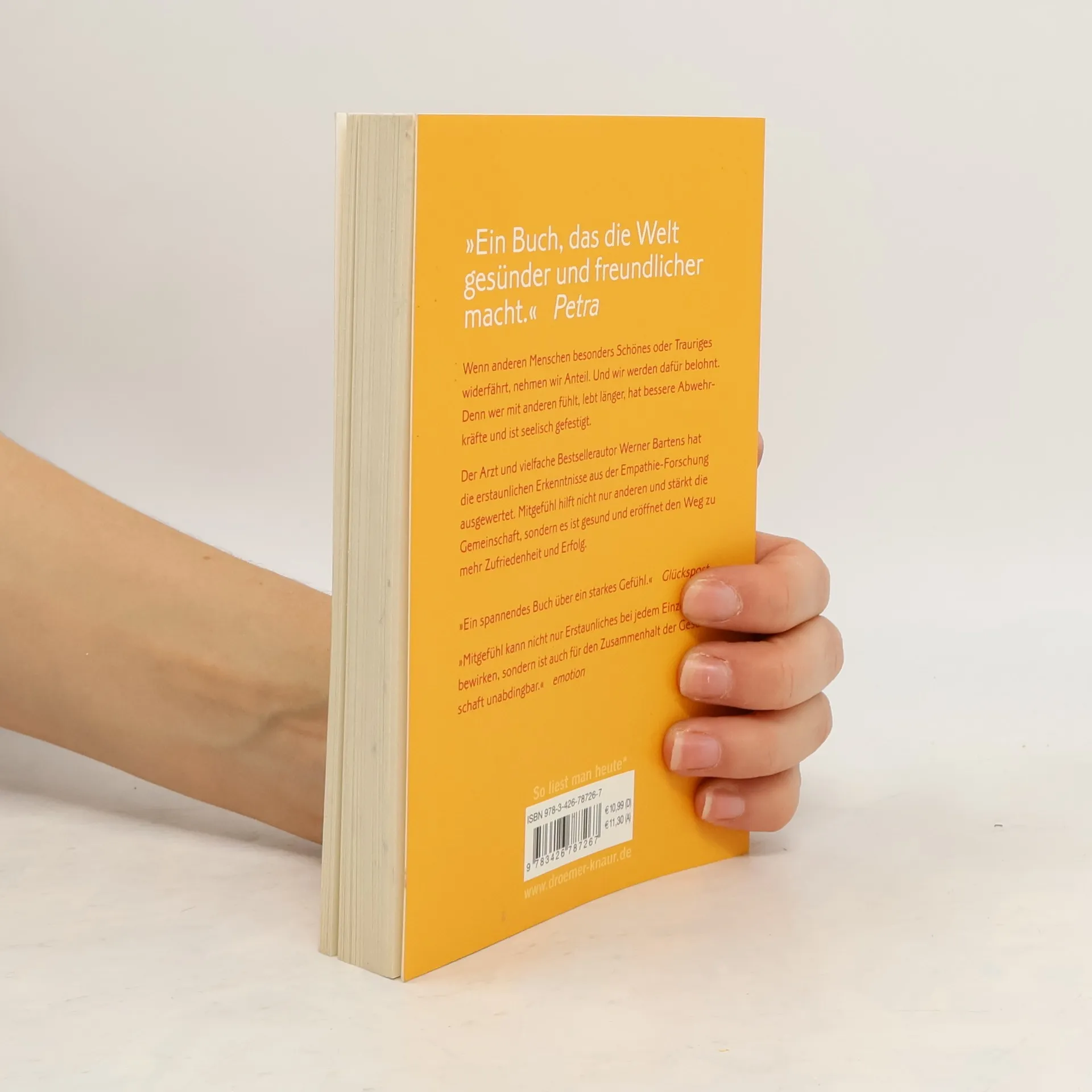 Das große Buch über Empathie und deren Bedeutung für unsere Beziehungen und unser Wohlbefinden, auf dem neuesten Stand der Forschung vom Arzt und Bestsellerautor Dr. med. Werner Barten. Empathie statt Egoismus, Mitgefühl statt Rücksichtslosigkeit. Wer sich in andere hineinversetzen kann, ist nicht nur bei seinen Mitmenschen beliebt, sondern tut auch sich selbst etwas Gutes. Bestsellerautor Werner Bartens nimmt uns mit auf eine Reise zu unseren edelsten Emotionen und zeigt, wie Einfühlung und Anteilnahme den Körper gesund erhalten, die Seele stärken und die Gemeinschaft festigen. Mit der richtigen Form des Mitgefühls verhindern wir, dass uns das Leiden anderer überwältigt – wir werden psychisch stabiler und vermeiden Burn-out. Was ist Empathie? Kann man Empathie lernen? Gut zu sich sein: Achtsamkeit und Selbstmitgefühl. Vom Nutzen der Empathie: Mehr Erfolg mit Mitgefühl. Die gesellschaftliche und politische Bedeutung von Empathie. Der Unterschied zwischen Empathie und Mitgefühl. Empathie tut anderen gut und ist gesund. Deutschlands bekanntester Medizinjournalist hat Hunderte Studien aus der internationalen Empathie-Forschung ausgewertet. Die Ergebnisse sind spannend: Empathie und Mitgefühl sind gesund. Menschen, die sich einfühlen können, leiden seltener an Stress und Depressionen, leben länger und sind weniger schmerzempfindlich. Empathie hält die Gesellschaft zusammen und hilft uns selbst!