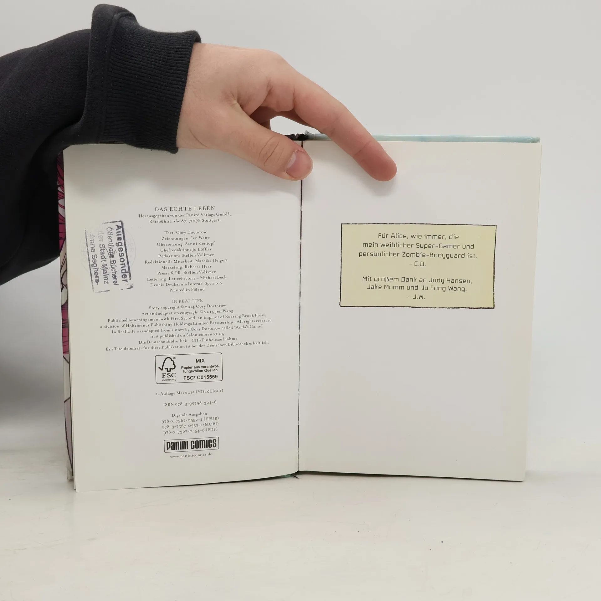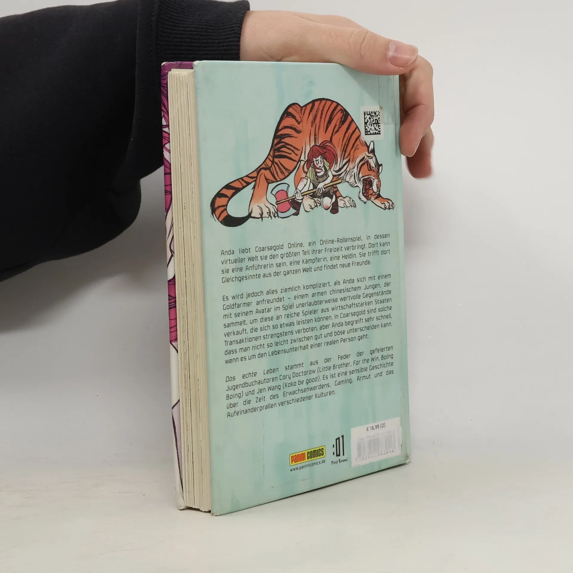 Anda liebt Coarsegold Online, ein Online-Rollenspiel, in dessen virtueller Welt sie den größten Teil ihrer Freizeit verbringt. Dort kann sie eine Anführerin sein, eine Kämpferin, eine Heldin. Sie trifft dort Gleichgesinnte aus der ganzen Welt und findet neue Freunde. Es wird jedoch alles ziemlich kompliziert, als Anda sich mit einem Goldfarmer anfreundet – einem armen chinesischem Jungen, der mit seinem Avatar im Spiel unerlaubterweise wertvolle Gegenstände sammelt, um diese an reiche Spieler aus wirtschaftstarken Staaten verkauft, die sich so etwas leisten können. In Coarsegold sind solche Transaktionen strengstens verboten, aber Anda begreift sehr schnell, dass man nicht so leicht zwischen gut und böse unterscheiden kann, wenn es um den Lebensunterhalt einer realen Person geht. Das echte Leben stammt aus der Feder der gefeierten Jugendbuchautoren Cory Doctorow (Little Brother, For the Win, Boing Boing) und Jen Wang (Koko be good). Es ist eine sensible Geschichte über die Zeit des Erwachsenwerdens, Gaming, Armut und das Aufeinanderprallen verschiedener Kulturen.