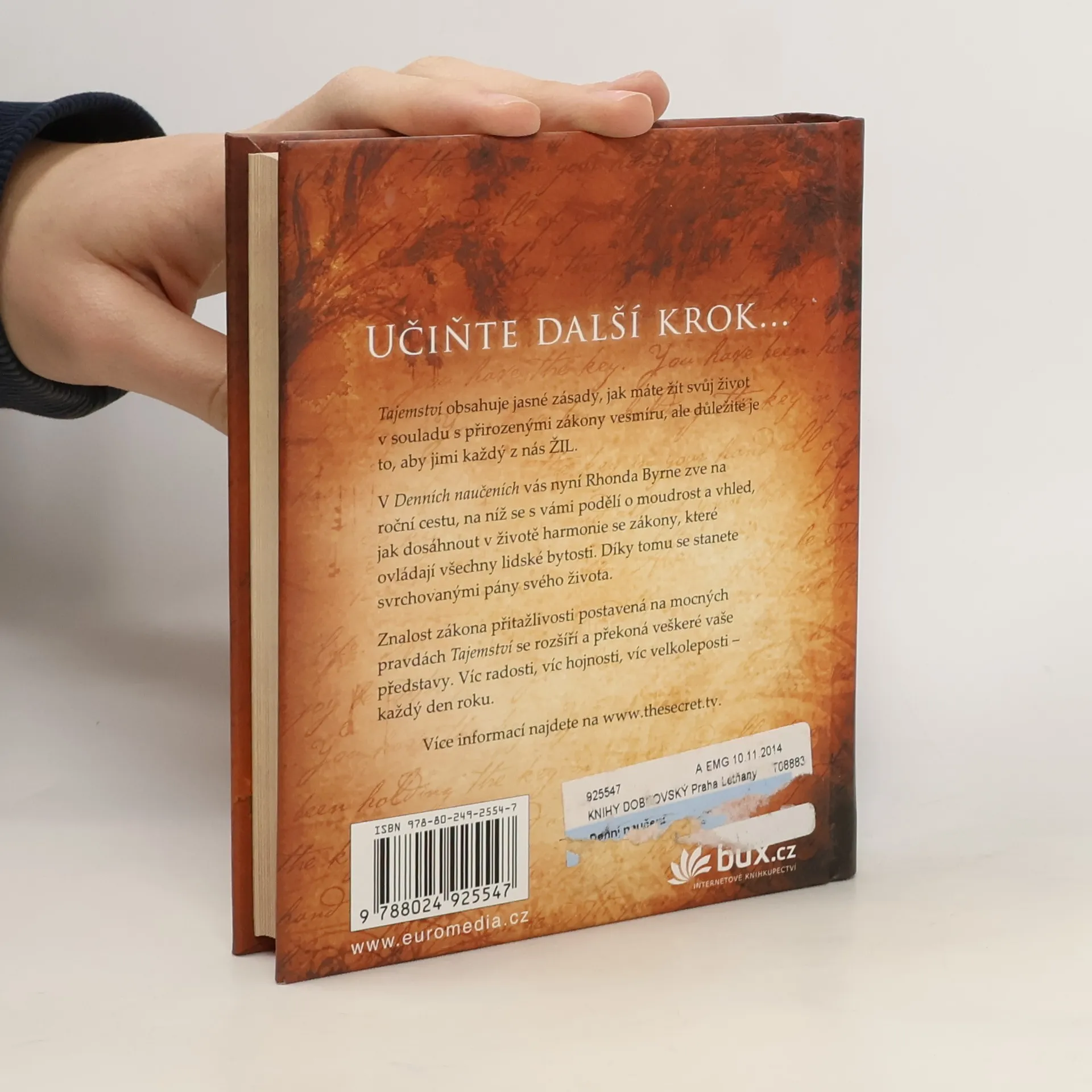 Tajemství obsahuje jasné zásady, jak vést život v souladu s přirozenými zákony vesmíru, ale hlavně jimi musíte skutečně ŽÍT. S Denním naučením vás Rhonda Byrne provede rokem učení a podělí se s vámi o moudrost i vhled, jak dosáhnout harmonie se zákony, které ovládají všechny lidské bytosti. Stanete se pány svého osudu. Mocné pravdy Tajemství tvoří pevné základy, na nichž vybudujete rozšířenou znalost zákona přitažlivosti. Víc radosti, víc hojnosti, víc velkoleposti – každý den po celý rok.