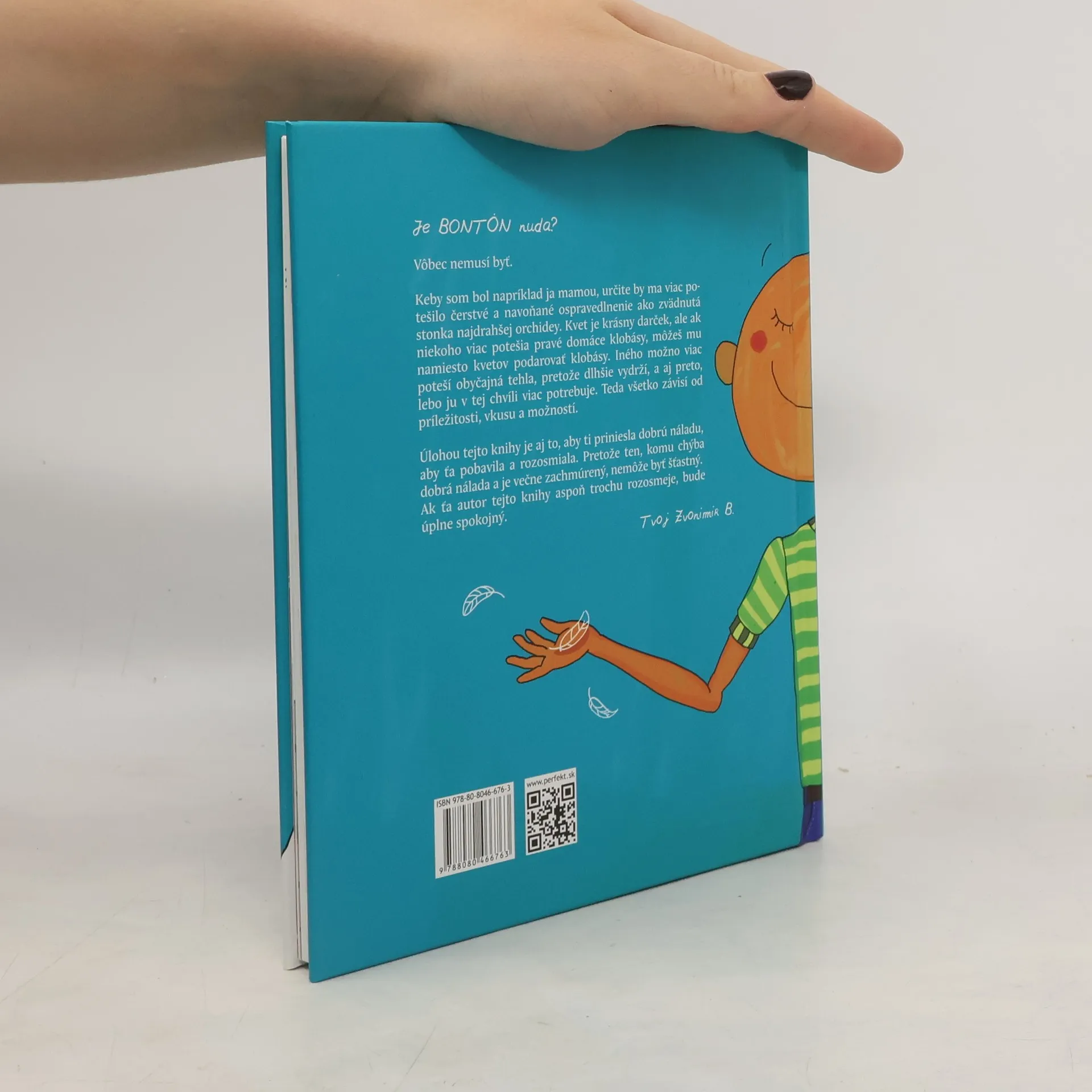 Je Bontón nuda? Vôbec nemusí byť. Keby som bol napríklad ja mamou, určite by ma viac potešilo čerstvé a navoňané ospravedlnenie ako zvädnutá stonka najdrahšej orchidey. Kvet je krásny darček, ale ak niekoho viac potešia pravé domáce klobásy, môžeš mu namiesto kvetov podarovať klobásy. Iného možno viac poteší obyčajná tehla, pretože dlhšie vydrží, a aj preto, lebo ju v tej chvíli viac potrebuje. Teda všetko závisí od príležitosti, vkusu a možností. Úlohou tejto knihy je aj to, aby ti priniesla dobrú náladu, aby ťa pobavila a rozosmiala. Pretože ten, komu chýba dobrá nálada a je večne zachmúrený, nemôže byť šťastný. Ak autor tejto knihy čítajúcich aspoň trochu rozosmeje, bude úplne spokojný.