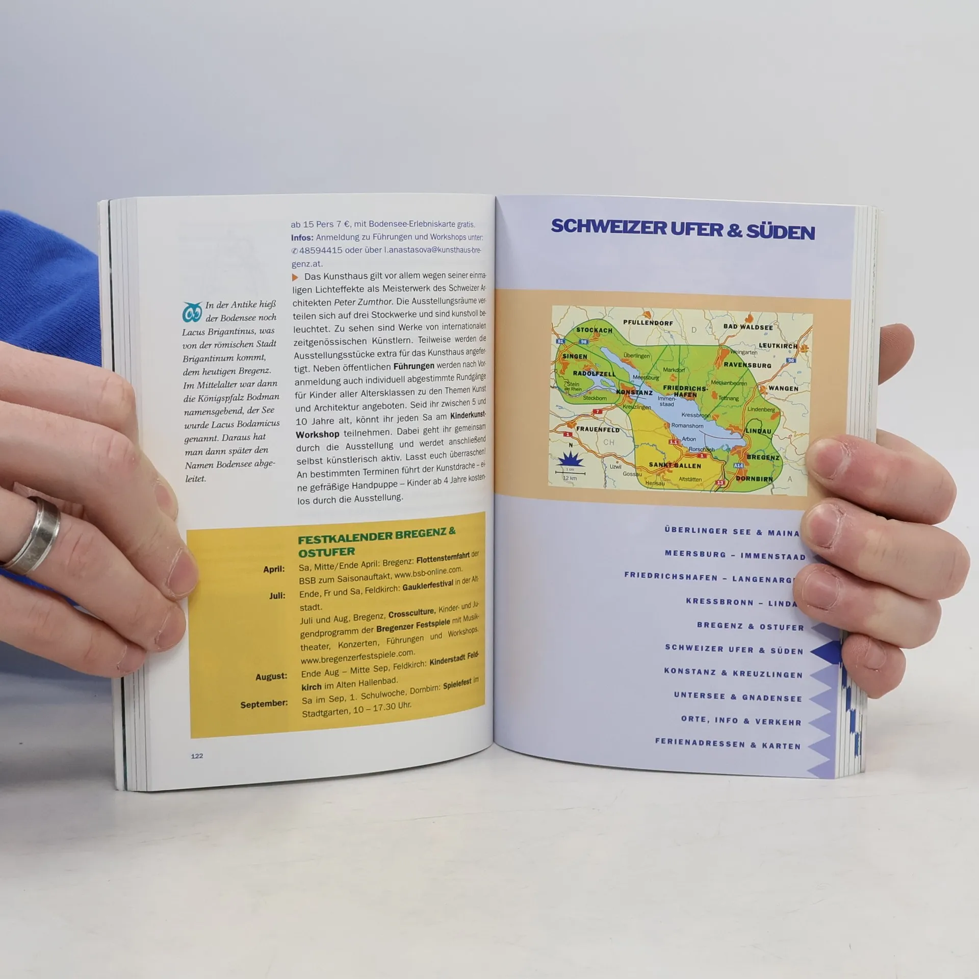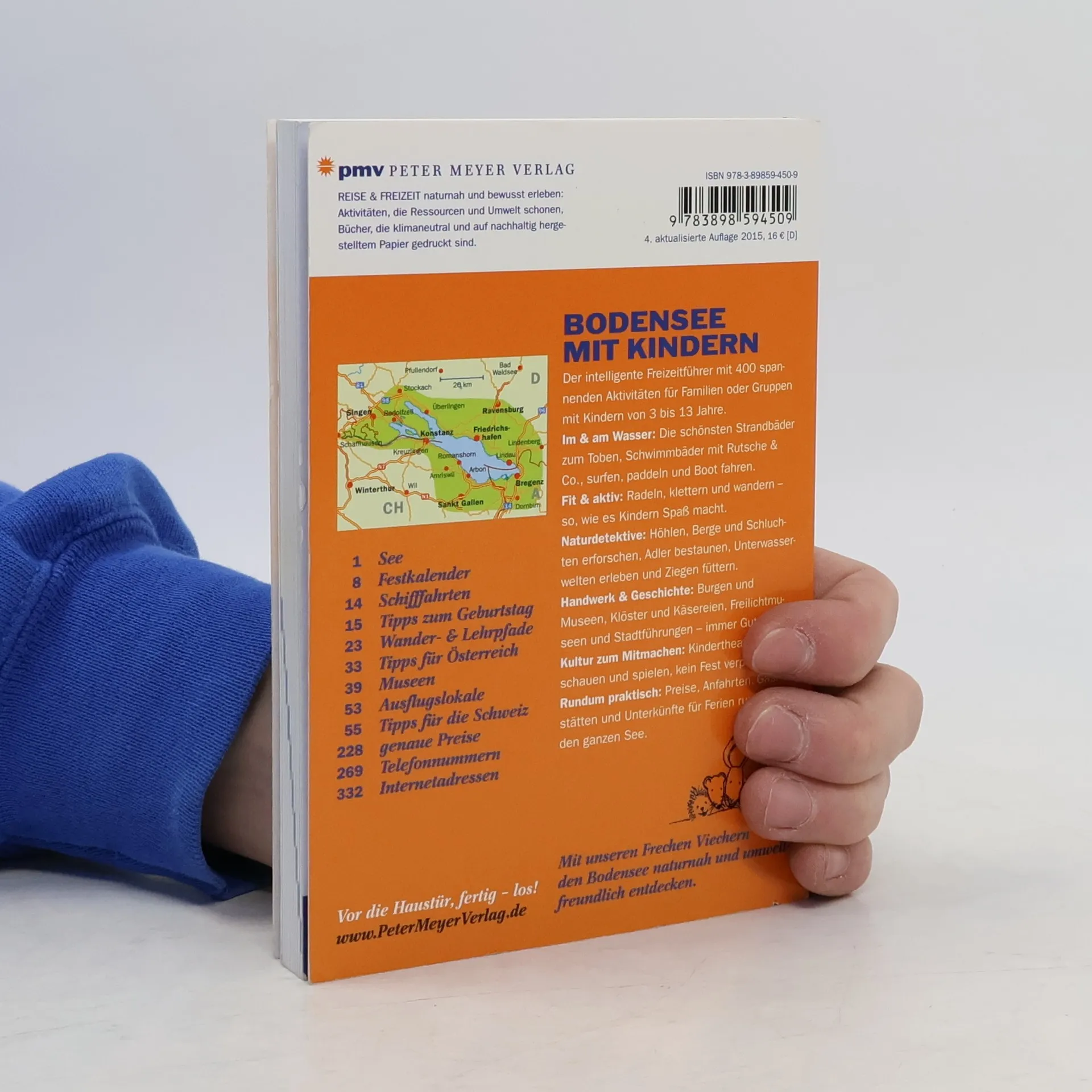 Dieses Buch beschreibt Strandbäder, kleine Radtouren, Schluchtwanderungen, Adlerwarten und Schaukäsereien ausführlich für alle Orte rund um den See; auch für die österreichische und Schweizer Seite. Bei 400 spannenden Aktivitäten reichen die Anregungen auch noch für Eltern und Großeltern! Angesprochen werden aber vor allem Kinder zwischen 3 und 13 Jahren, für die selbst schlechtes Wetter kein Problem mehr ist, denn Aquarien und Kinderspielprogramme werden ebenfalls vorgestellt. Wie bei pmv üblich, gibt es detaillierte Informationen zu Eintrittspreisen und Ermäßigungen, Öffnungszeiten und Internetadressen. Bei den Anfahrten mit öffentlichen Verkehrsmitteln werden auch die Fähren und Ausflugsboote berücksichtigt. Dem farbig bebilderten Text sind Tipps zur Einkehr, zu Literatur und Karten oder Wissenswertem beigestellt. So wird die Freizeitplanung kinderleicht und einem erholsamen Familienurlaub steht nichts mehr im Wege.