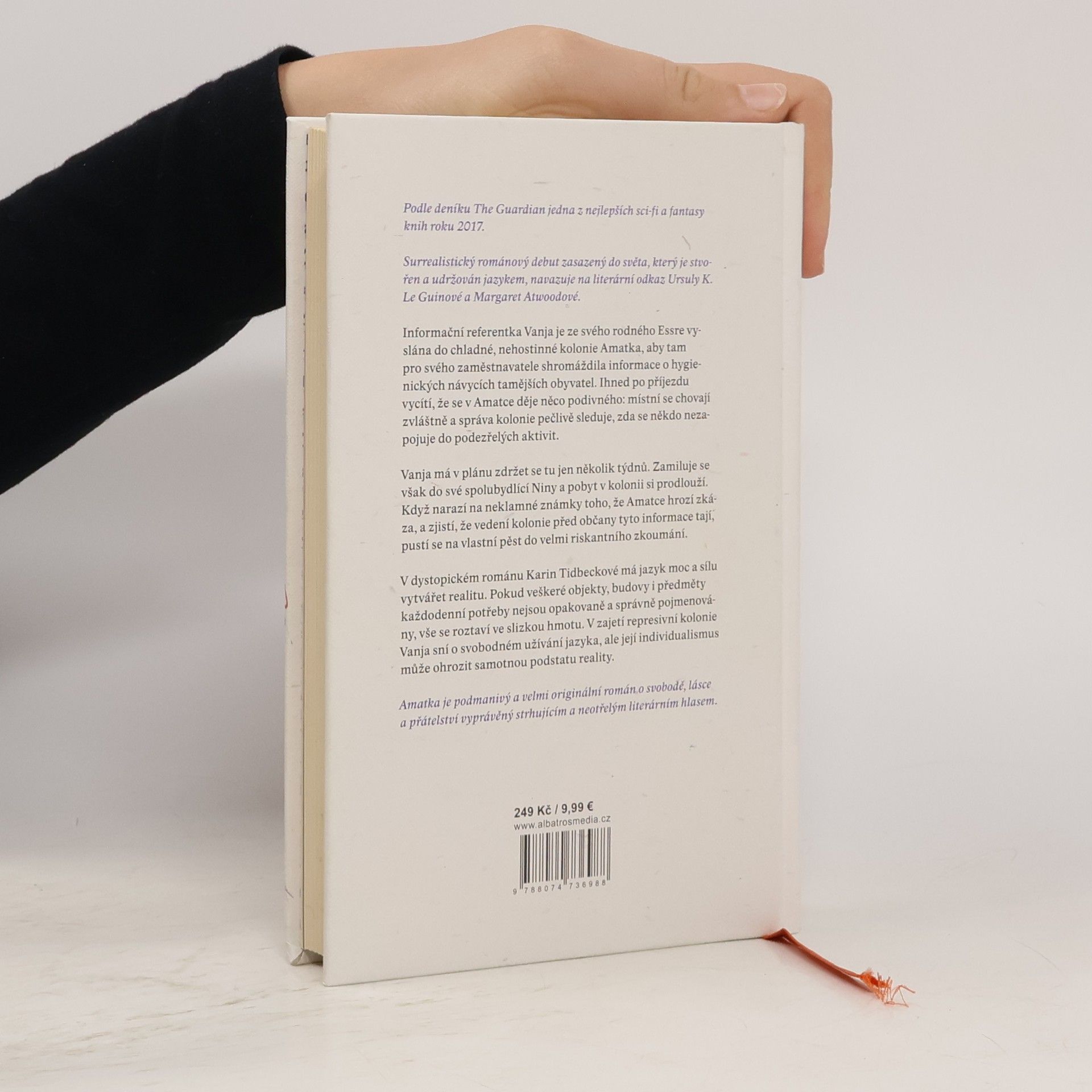 Podle deníku The Guardian jedna z nejlepších sci‑fi a fantasy knih roku 2017. Surrealistický románový debut zasazený do světa, který je stvořen a udržován jazykem, navazuje na literární odkaz Ursuly K. Le Guinové a Margaret Atwoodové. Informační referentka Vanja je ze svého rodného Essre vyslána do chladné, nehostinné kolonie Amatka, aby tam pro svého zaměstnavatele shromáždila informace o hygienických návycích tamějších obyvatel. Ihned po příjezdu vycítí, že se v Amatce děje něco podivného: místní se chovají zvláštně a správa kolonie pečlivě sleduje, zda se někdo nezapojuje do podezřelých aktivit. Vanja má v plánu zdržet se tu jen několik týdnů. Zamiluje se však do své spolubydlící Niny a pobyt v kolonii si prodlouží. Když narazí na neklamné známky toho, že Amatce hrozí zkáza, a zjistí, že vedení kolonie před občany tyto informace tají, pustí se na vlastní pěst do velmi riskantního zkoumání. V dystopickém románu Karin Tidbeckové má jazyk moc a sílu vytvářet realitu. Pokud veškeré objekty, budovy i předměty každodenní potřeby nejsou opakovaně a správně pojmenovány, vše se roztaví ve slizkou hmotu. V zajetí represivní kolonie Vanja sní o svobodném užívání jazyka, ale její individualismus může ohrozit samotnou podstatu reality.