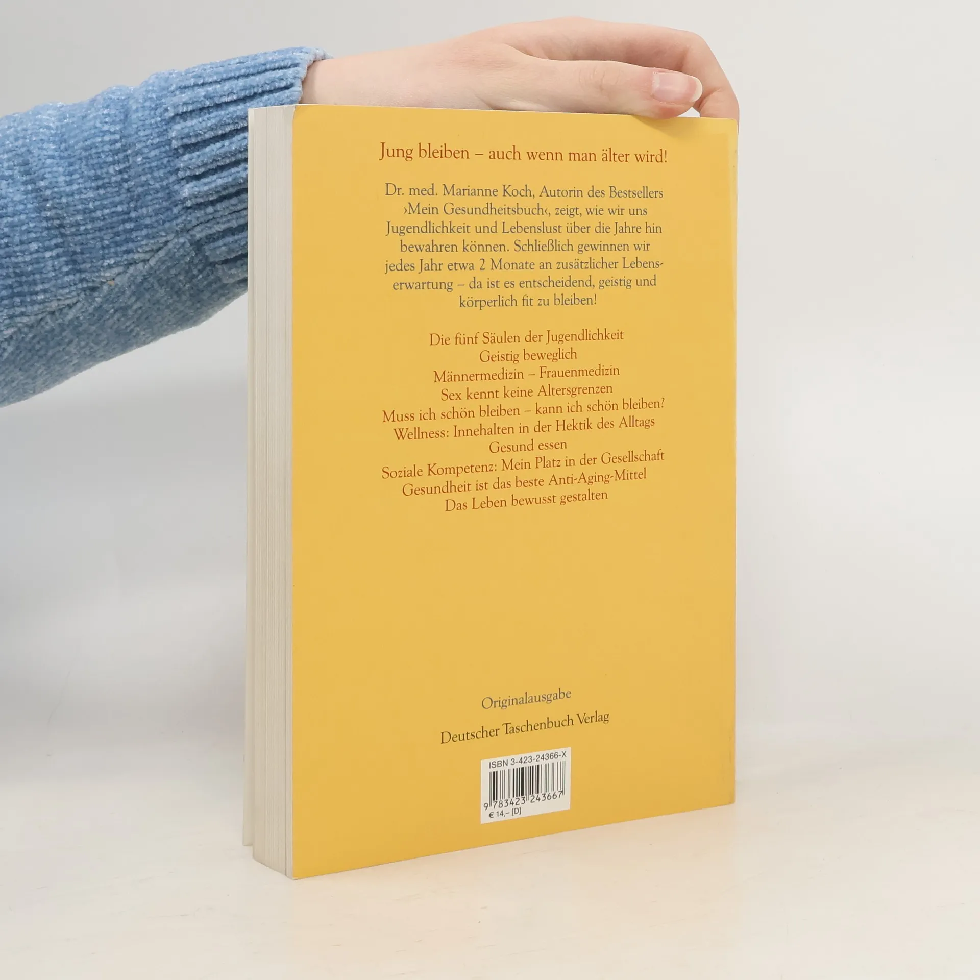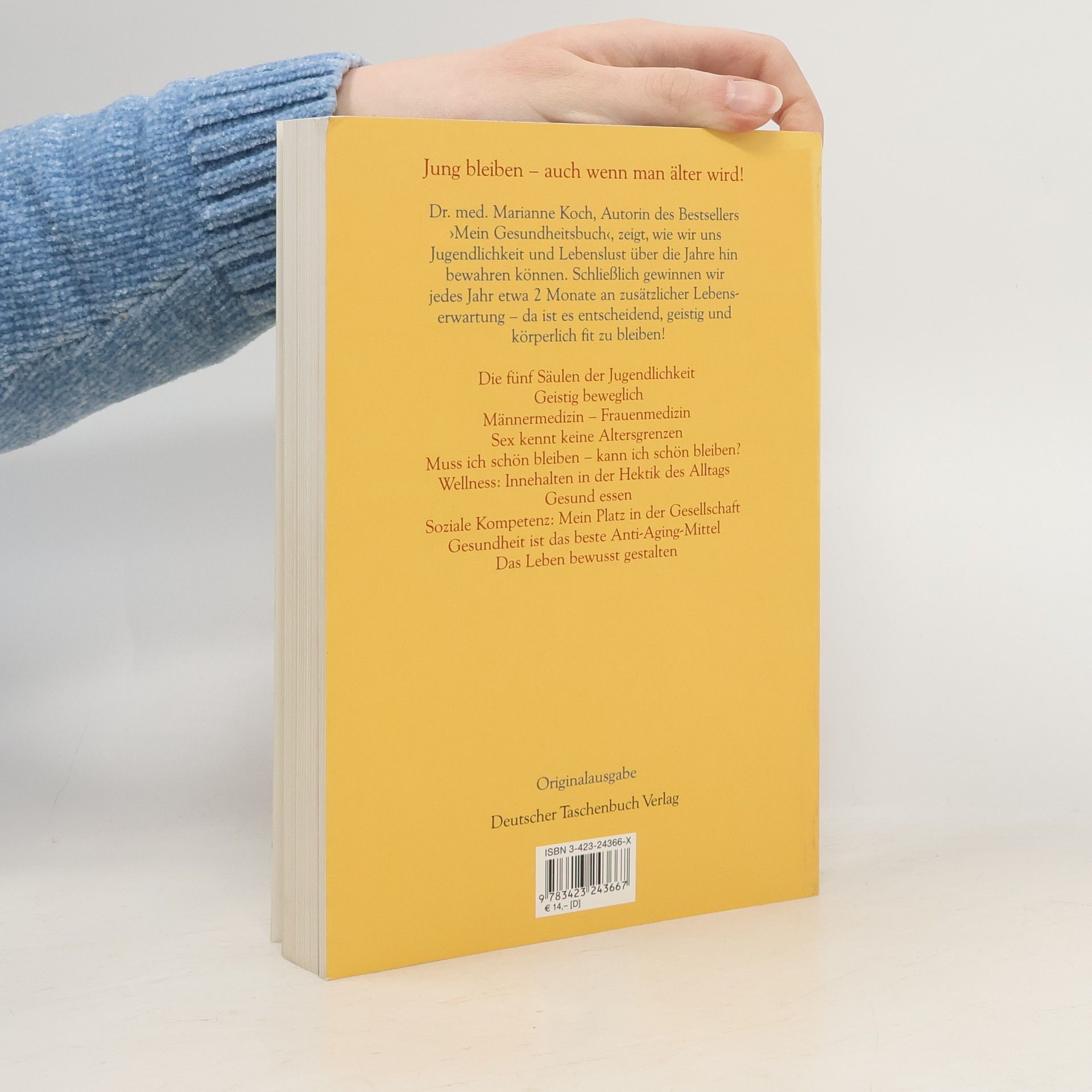 Die Ärztin und Bestsellerautorin zeigt, wie wir uns Jugendlichkeit und Lebenslust über die Jahre bewahren können. Wann wird man älter? Mit 30 Jahren? Mit 50? Mit 70? Oder noch später? Kommt drauf an, sagen die Wissenschaftler. Nachgewiesen ist jedenfalls, dass die Art und Weise, wie wir leben, großen Einfluss auf Jugendlichkeit und Lebenslust in späteren Jahren hat. Auf der Basis der neuesten Studien zeigt Marianne Koch in diesem Gesundheitsbuch die vielen Möglichkeiten auf, die wir haben, um jugendlich und geistig fit zu bleiben. Sie hat mit Experten wie mit Prominenten gesprochen und gibt daneben sehr viele praktische Tipps. Mit ihrer sehr persönlichen Erzählweise und ihrer bildhaften Sprache kann sie wie kaum jemand sonst vermitteln, was es bedeutet, »intelligent« zu altern, das heißt, mit Körper, Geist und Seele so klug umzugehen, dass wir Energie und Lebensqualität auch noch im hohen Alter besitzen. Aus dem Inhalt: - Sind wir Sklaven unserer Gene? - Gibt es ein »natürliches« Altern? - Muss ich schön bleiben - kann ich schön bleiben? - Mein Körper ist mein Kapital - Wellness-Welle - was taugt sie wirklich? - Sex kennt keine Altersgrenzen - Gesunde Ernährung - gar nicht so einfach - Hirnzellen wollen Neues lernen - Strategien gegen Depression und Einsamkeit